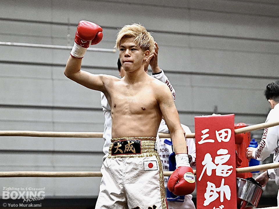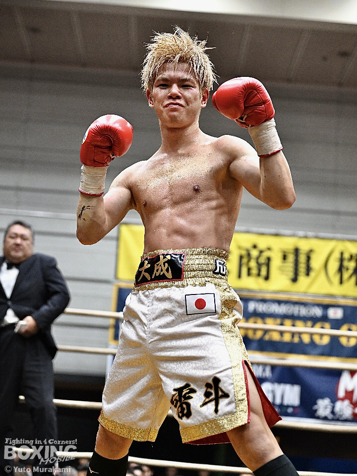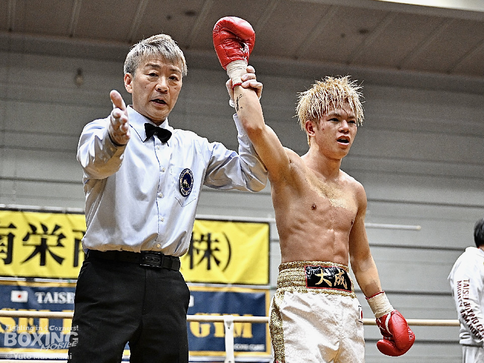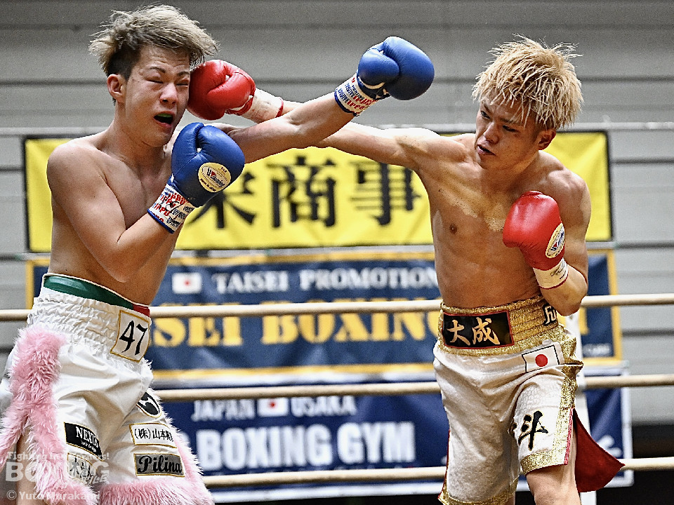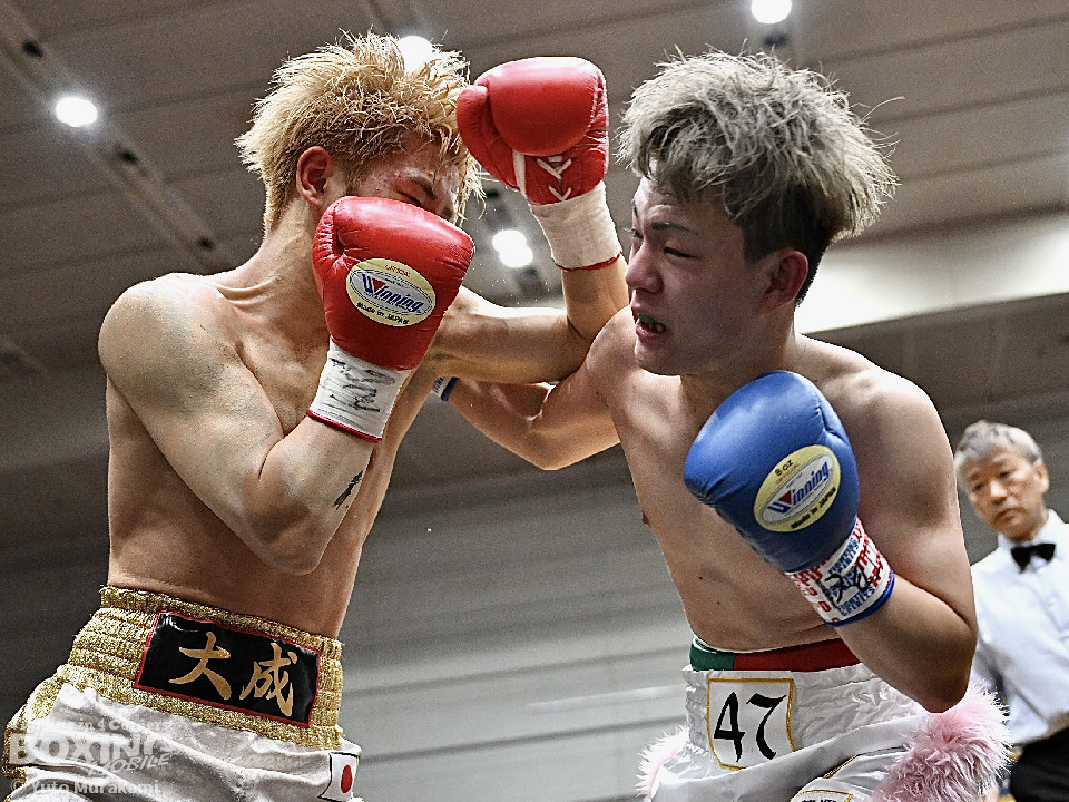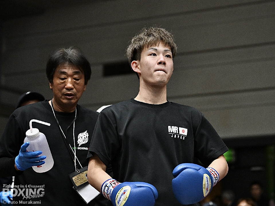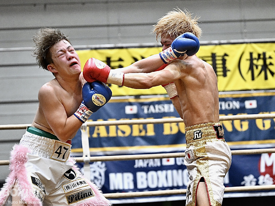 試合:出井がジャブを飛ばして体に当てる意識を作りつつ、ワンツーをヒット。2回、後手に回った下川は距離を詰めてワンツーを打ち込むが、出井は真っ向から応戦すると右カウンターでダウンを奪取。再開後、下川は打ち下ろしの右ストレート、左ボディで反撃。出井はホールディングの反則により減点1が課せられた。3回、至近距離での打ち合いの中、下川が右をコツコツと当てて優勢。レフェリーは出井に対しホールディングの反則でさらに減点を与えた。4回、出井は左アッパーで迎え撃つが、相手の勢いを止められず。下川はグイグイと距離を潰して右フックをねじ込んだところでレフェリーが割って入った。