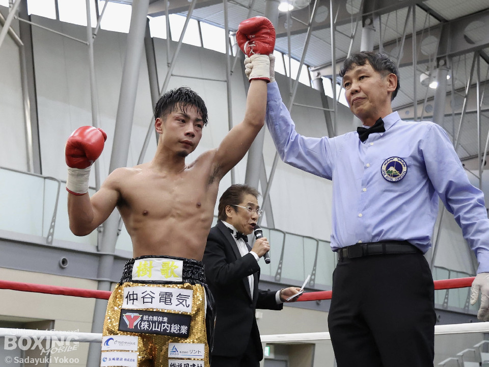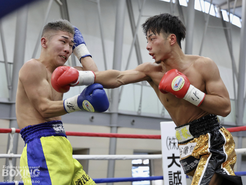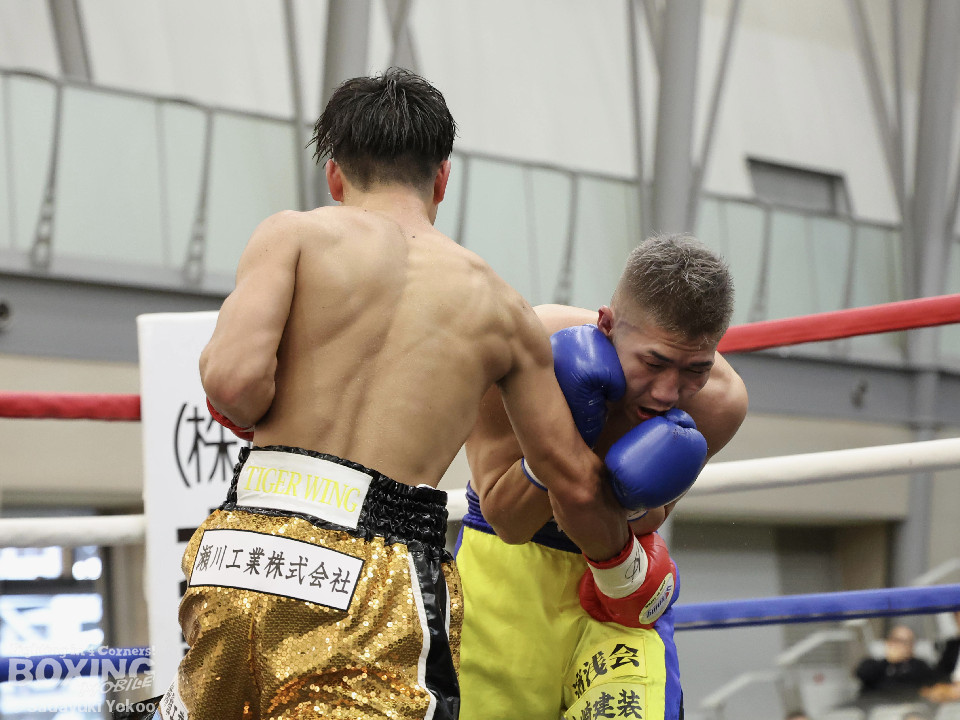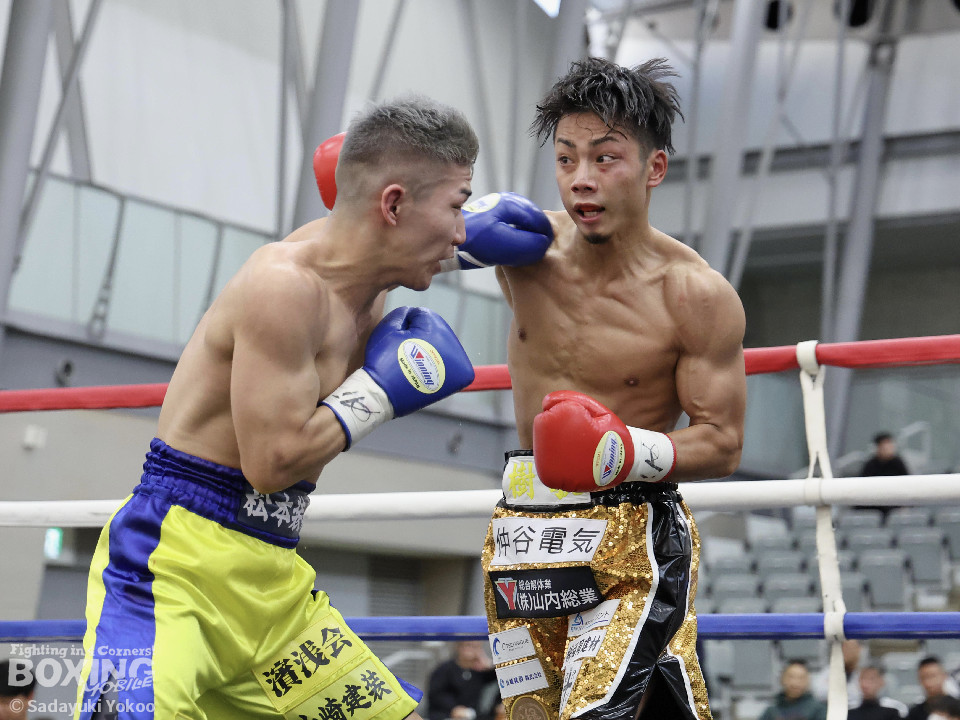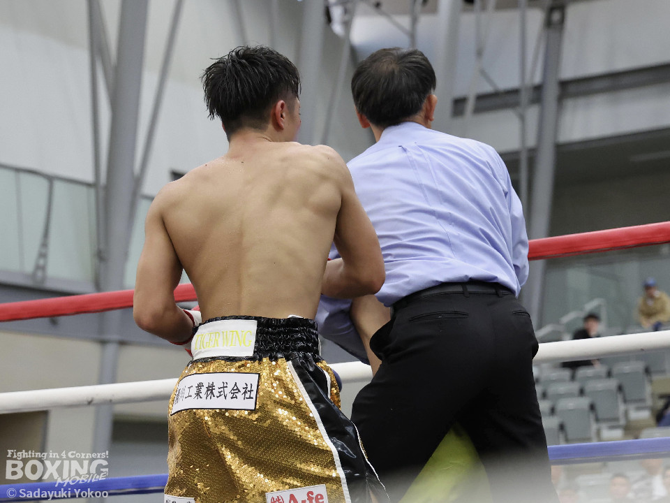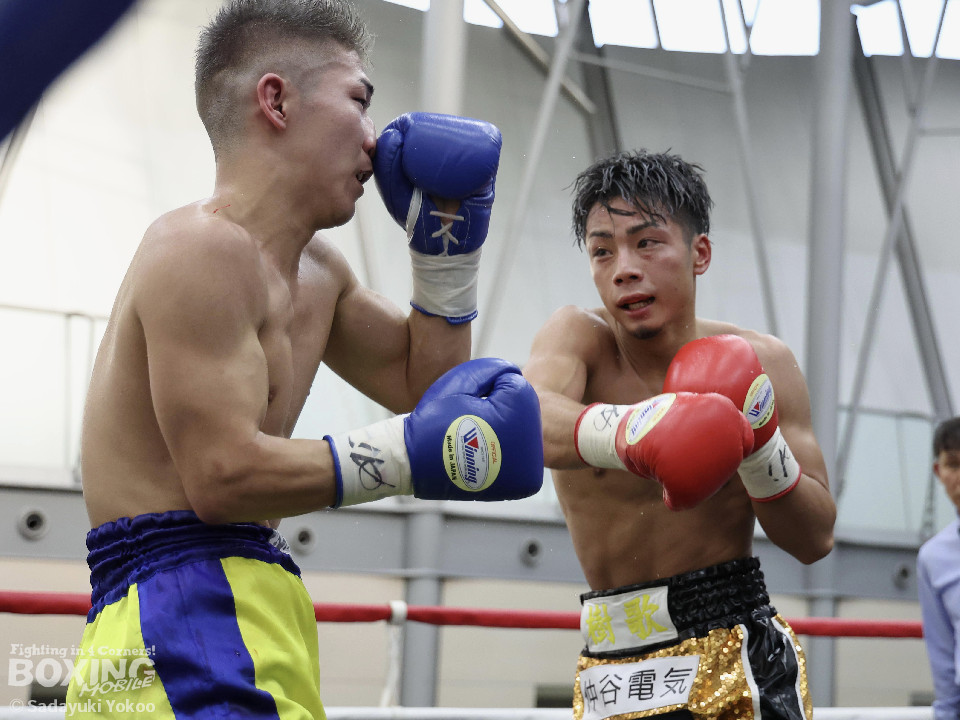 試合:樫谷は立ち上がりからステップワーク、クリンチを駆使して相手に的を絞らせない。敵地に乗り込んできた平井は序盤から果敢に攻めていくが樫谷にジャブを合わされる。2回、鋭いジャブから試合を組み立てる樫谷。平井はなんとか距離を潰しパンチを当てたいが樫谷に距離をキープされてしまう。3回、平井が飛びこみながら右フックをクリーンヒット。平井の強引な攻めに樫谷のクリンチの回数が増える。4回、手数を増やしプレスをかける平井の右ストレートがクリーンヒット!樫谷は膝をガクンと落とすがなんとか踏みとどまる。5回、勢いに乗った平井が距離を潰し攻撃を仕掛ける。樫谷のパンチが空を切る場面が増え苦しい展開。6回、樫谷が再び落ち着きを取り戻しヒット数を上げる。平井は被弾をもろともせず前に出るがここで樫谷の右ストレートがクリーンヒット。動きが鈍くなった平井に立て続けに樫谷の右ストレートが着弾。完全に動きが止まった平井をレフェリーが救出した。