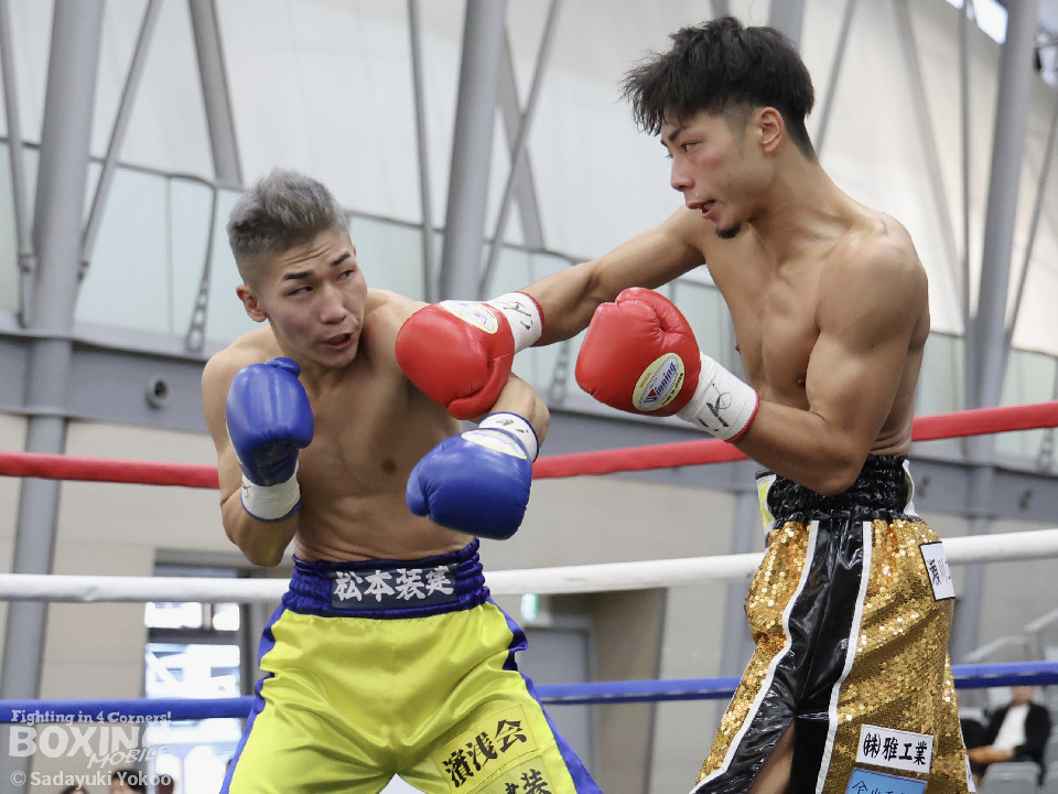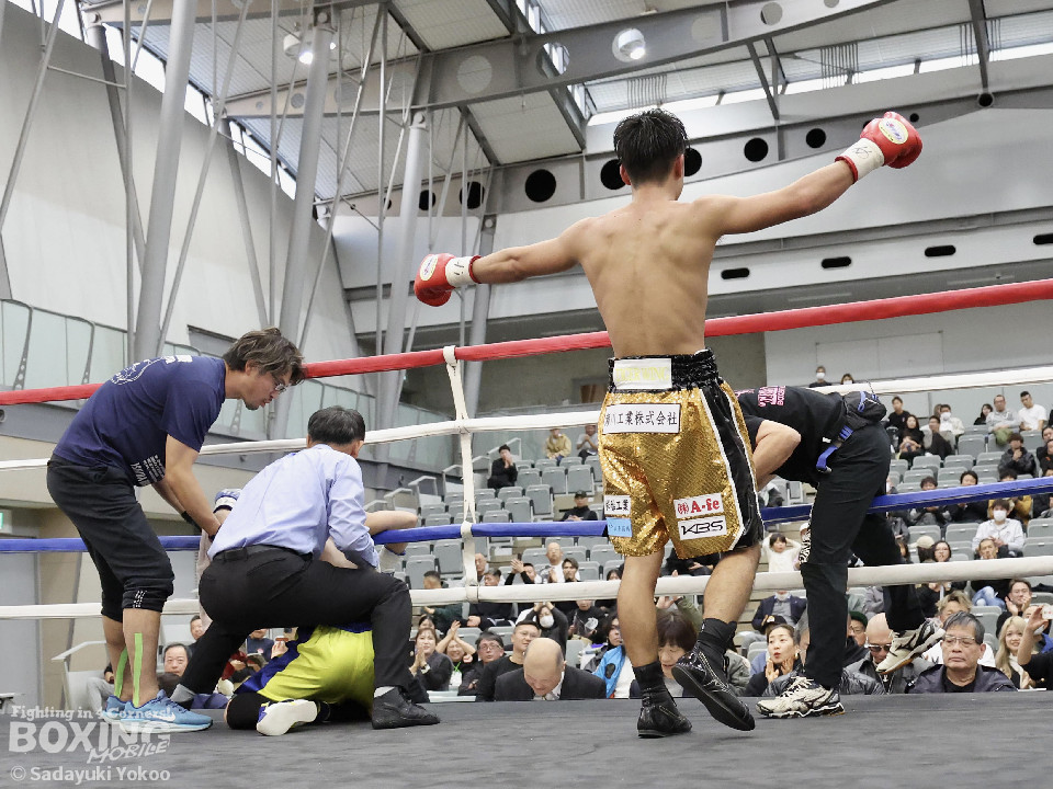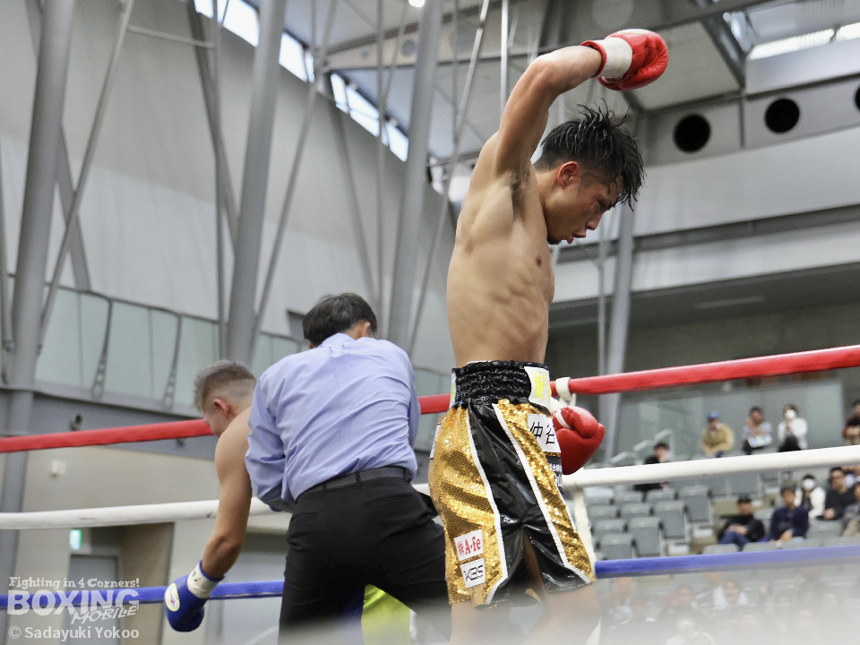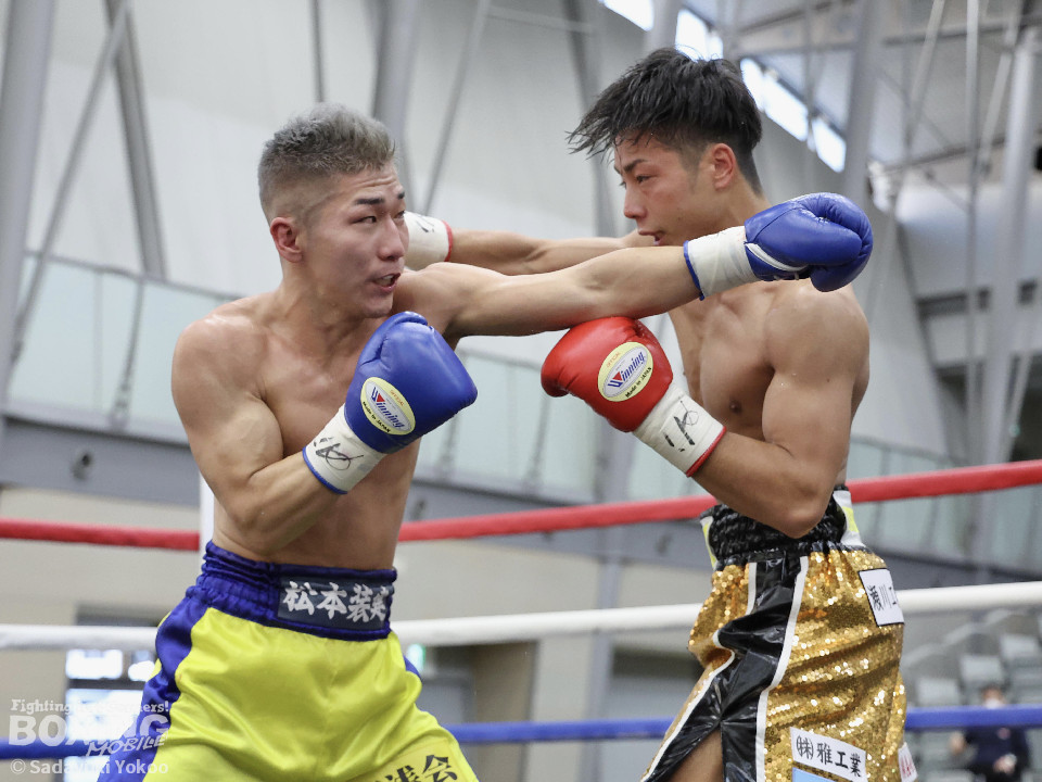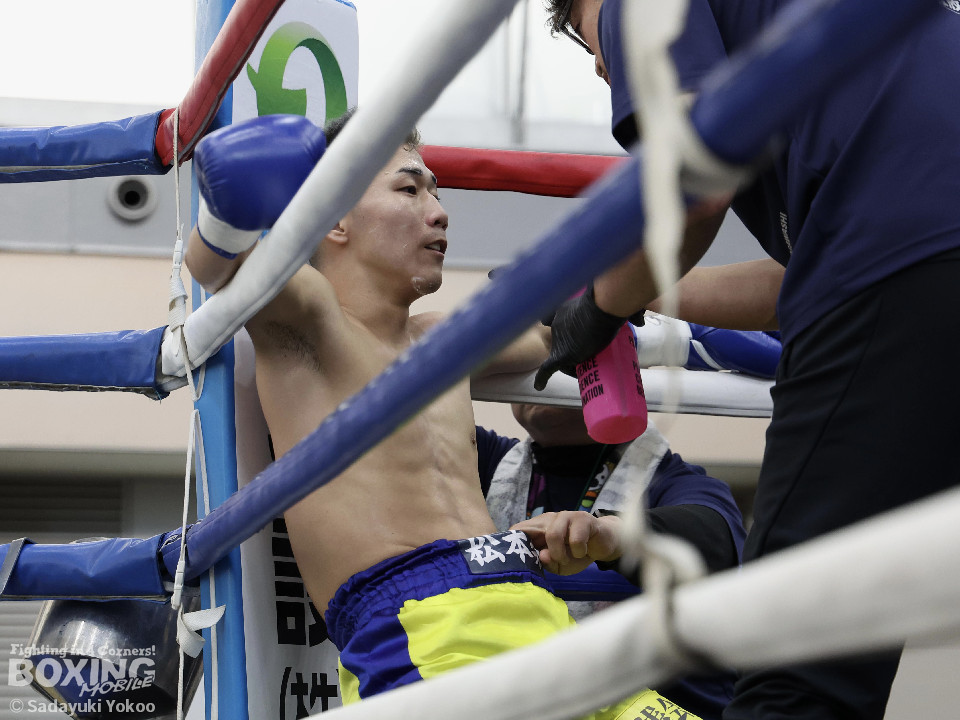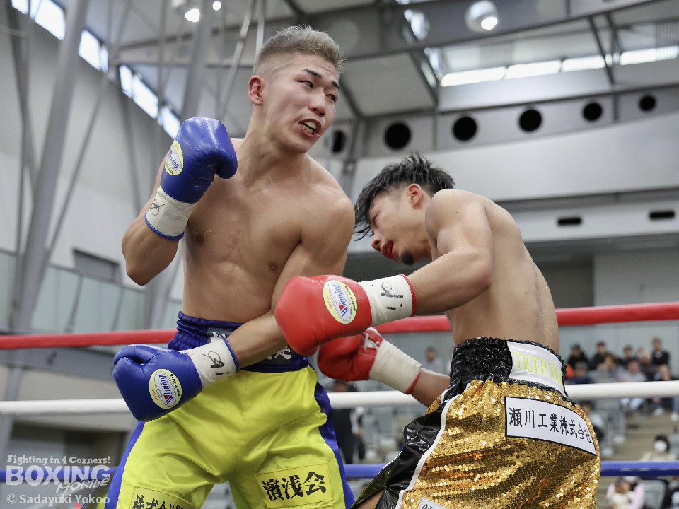 試合:樫谷は立ち上がりからステップワーク、クリンチを駆使して相手に的を絞らせない。敵地に乗り込んできた平井は序盤から果敢に攻めていくが樫谷にジャブを合わされる。2回、鋭いジャブから試合を組み立てる樫谷。平井はなんとか距離を潰しパンチを当てたいが樫谷に距離をキープされてしまう。3回、平井が飛びこみながら右フックをクリーンヒット。平井の強引な攻めに樫谷のクリンチの回数が増える。4回、手数を増やしプレスをかける平井の右ストレートがクリーンヒット!樫谷は膝をガクンと落とすがなんとか踏みとどまる。5回、勢いに乗った平井が距離を潰し攻撃を仕掛ける。樫谷のパンチが空を切る場面が増え苦しい展開。6回、樫谷が再び落ち着きを取り戻しヒット数を上げる。平井は被弾をもろともせず前に出るがここで樫谷の右ストレートがクリーンヒット。動きが鈍くなった平井に立て続けに樫谷の右ストレートが着弾。完全に動きが止まった平井をレフェリーが救出した。