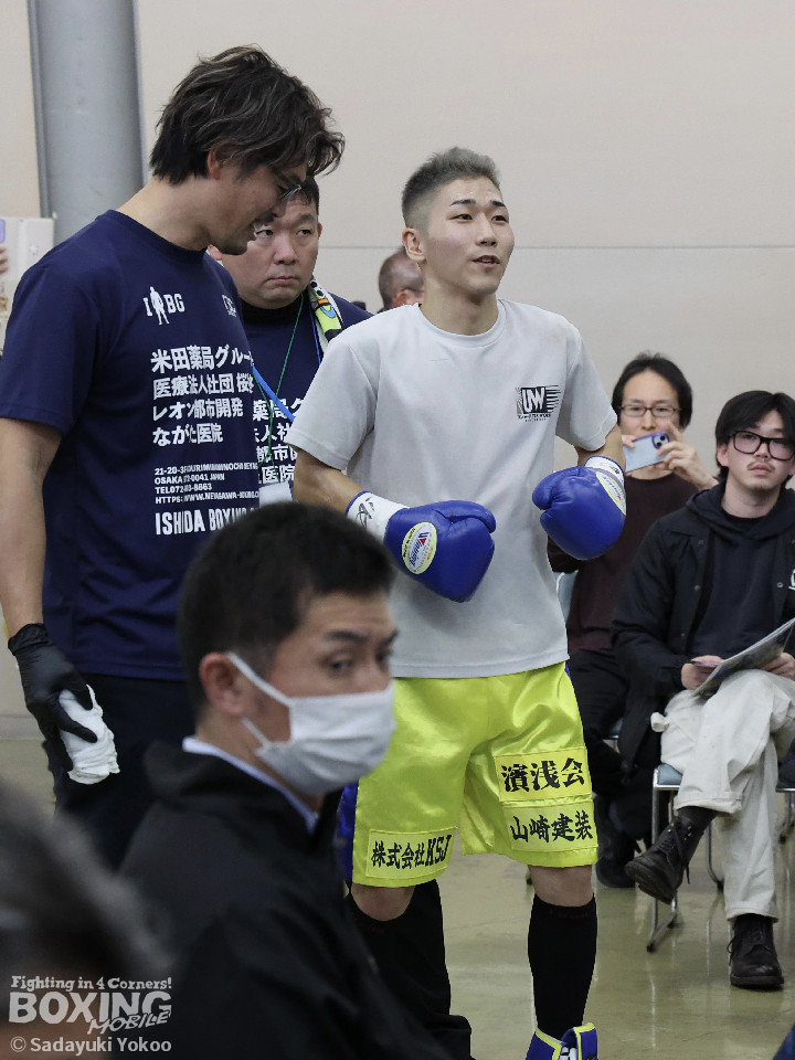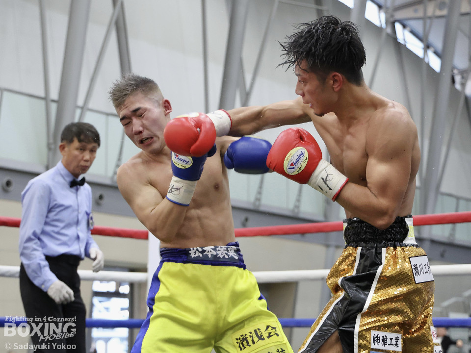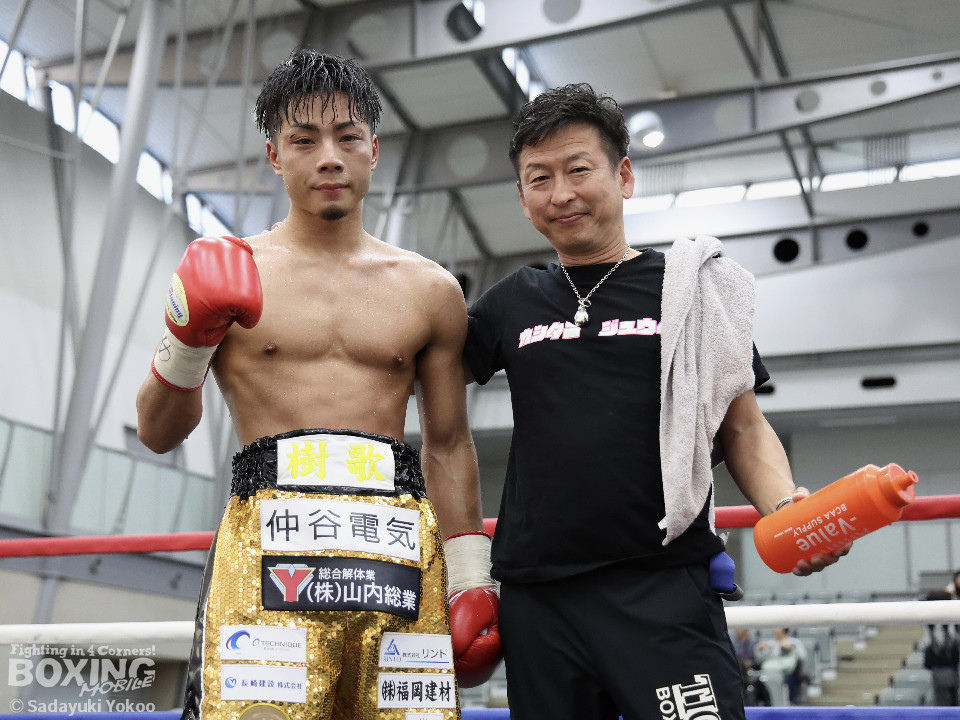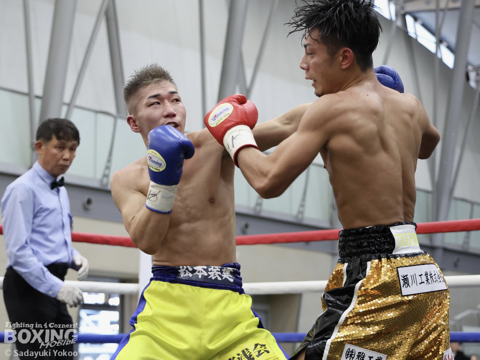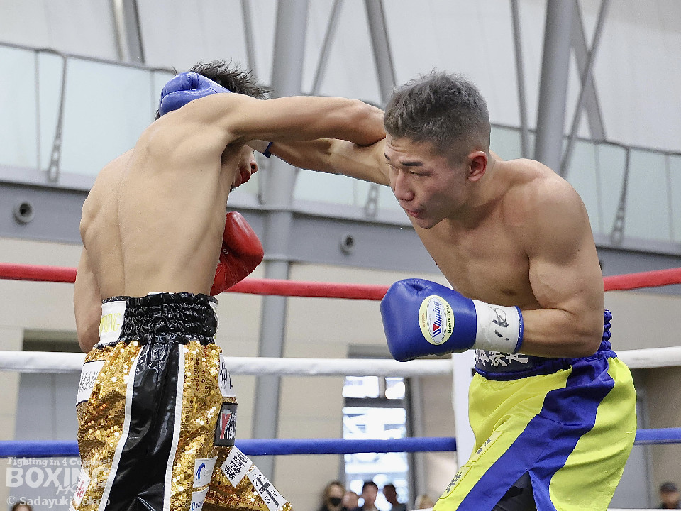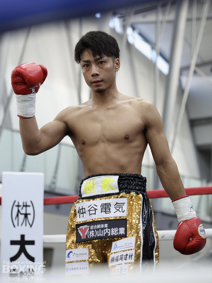 試合:樫谷は立ち上がりからステップワーク、クリンチを駆使して相手に的を絞らせない。敵地に乗り込んできた平井は序盤から果敢に攻めていくが樫谷にジャブを合わされる。2回、鋭いジャブから試合を組み立てる樫谷。平井はなんとか距離を潰しパンチを当てたいが樫谷に距離をキープされてしまう。3回、平井が飛びこみながら右フックをクリーンヒット。平井の強引な攻めに樫谷のクリンチの回数が増える。4回、手数を増やしプレスをかける平井の右ストレートがクリーンヒット!樫谷は膝をガクンと落とすがなんとか踏みとどまる。5回、勢いに乗った平井が距離を潰し攻撃を仕掛ける。樫谷のパンチが空を切る場面が増え苦しい展開。6回、樫谷が再び落ち着きを取り戻しヒット数を上げる。平井は被弾をもろともせず前に出るがここで樫谷の右ストレートがクリーンヒット。動きが鈍くなった平井に立て続けに樫谷の右ストレートが着弾。完全に動きが止まった平井をレフェリーが救出した。