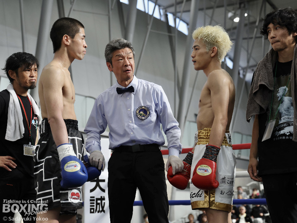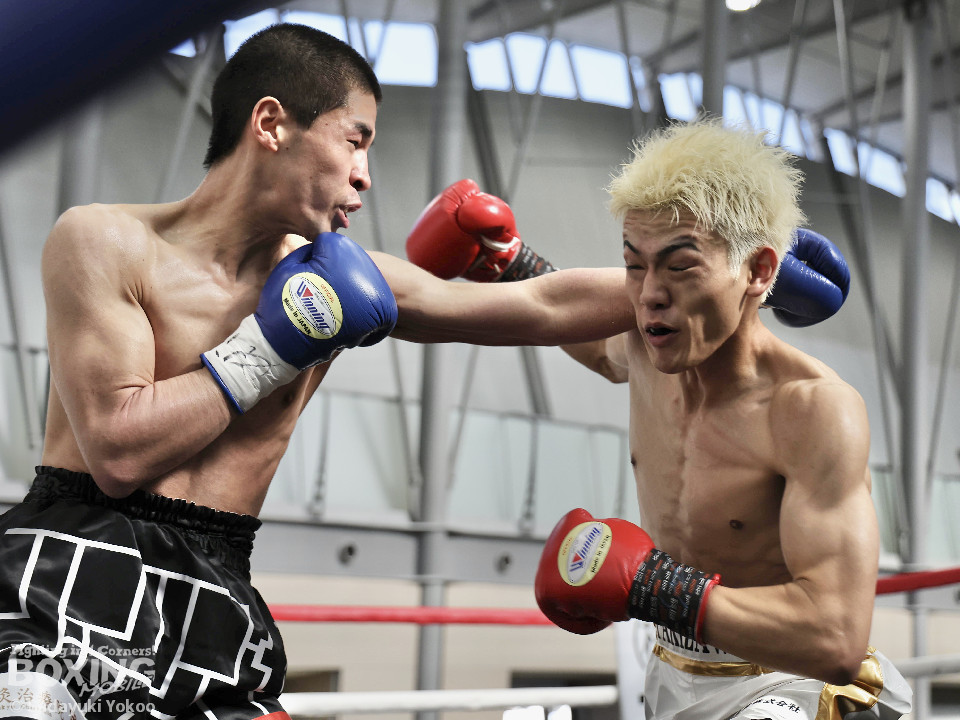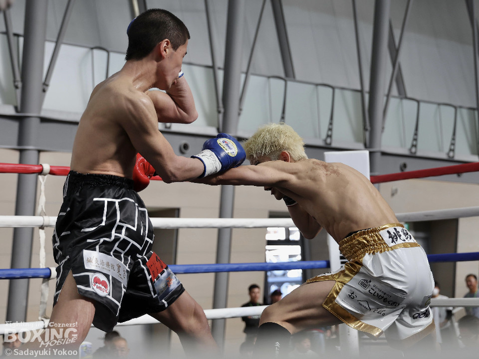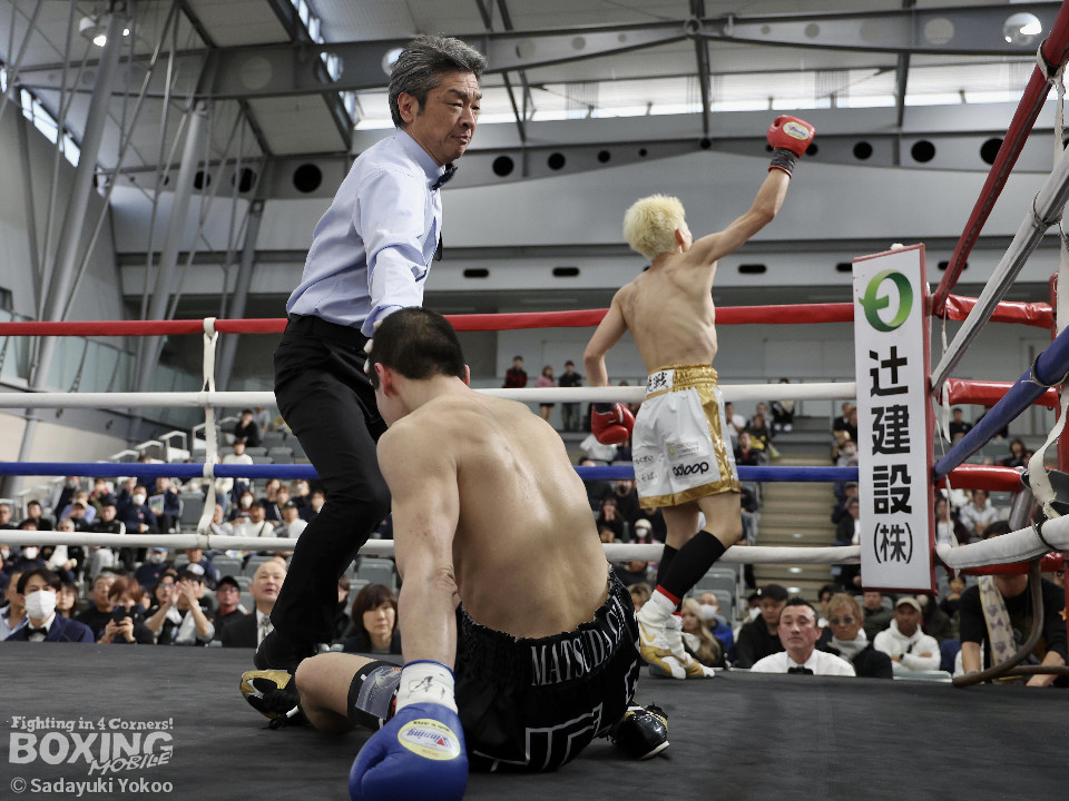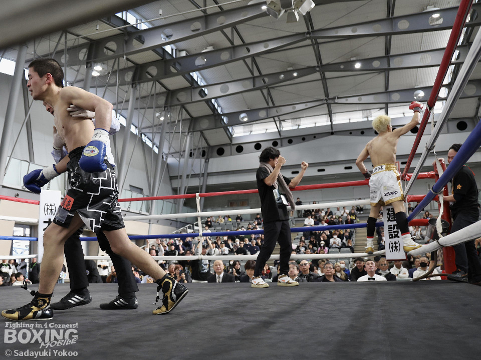 試合:試合開始直後からパンチを交錯させる両者。先手を取ったのは樋田。右ストレートを側頭部に合わせて一度目のダウンを奪う。立ち上がった島袋だがダメージは深く樋田の追撃に合う。その後、再び右ストレートをもらい完全に効いた島袋をレフェリーが救った。樋田は大歓声の中、勝ち名乗りを受けた。