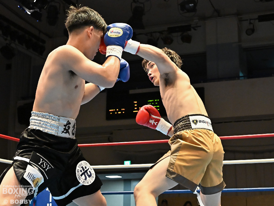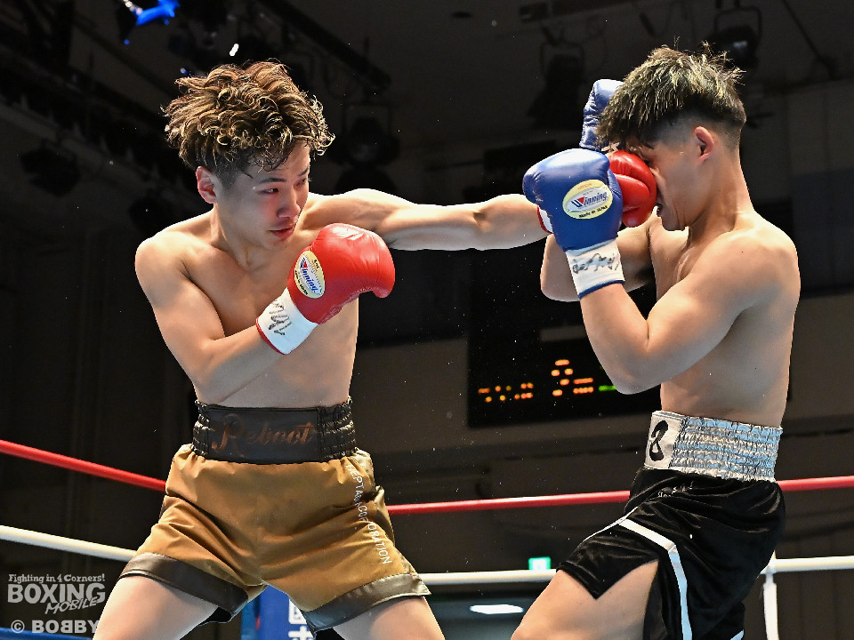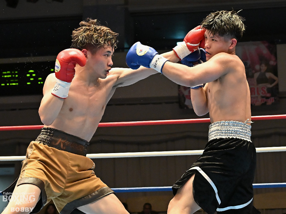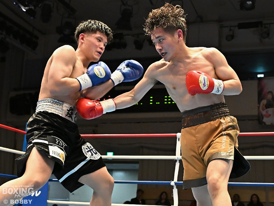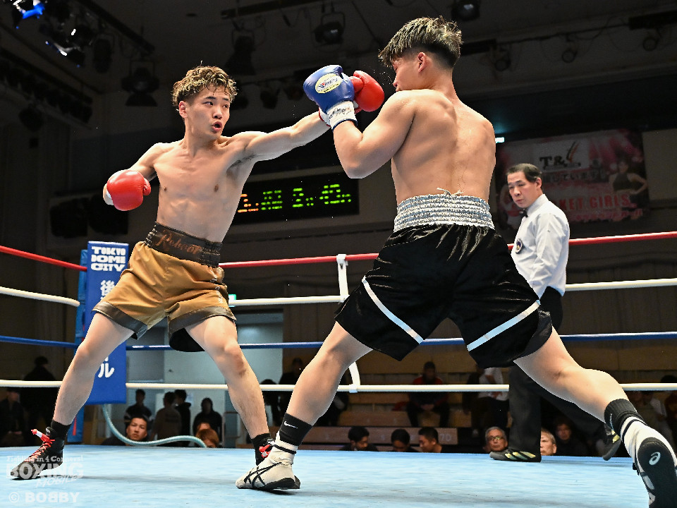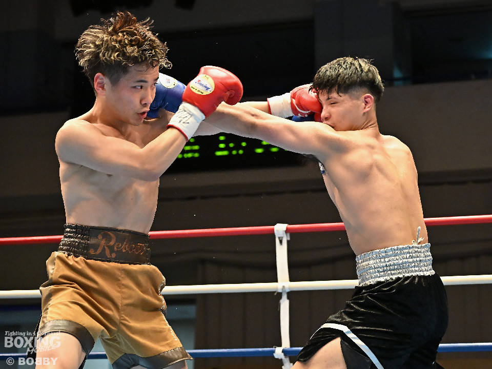 試合:互いにフェイントをかけつつジャブを繰り出し、機会を探ると、赤城がボディジャブで先制、永野はワンツーをヒットした。2回、ワンツーを軸に攻勢を強めた永野に対し、赤城は打ち終わりに左フックをヒット。右から左アッパーにつなげた。3回、左アッパーで一瞬動きを止めた永野に追撃した赤城は右をヒット。4回、ボディからワンツーを返した赤城に対し、永野はワンツー連打で対抗した。結果は三者三様のドローとなった。