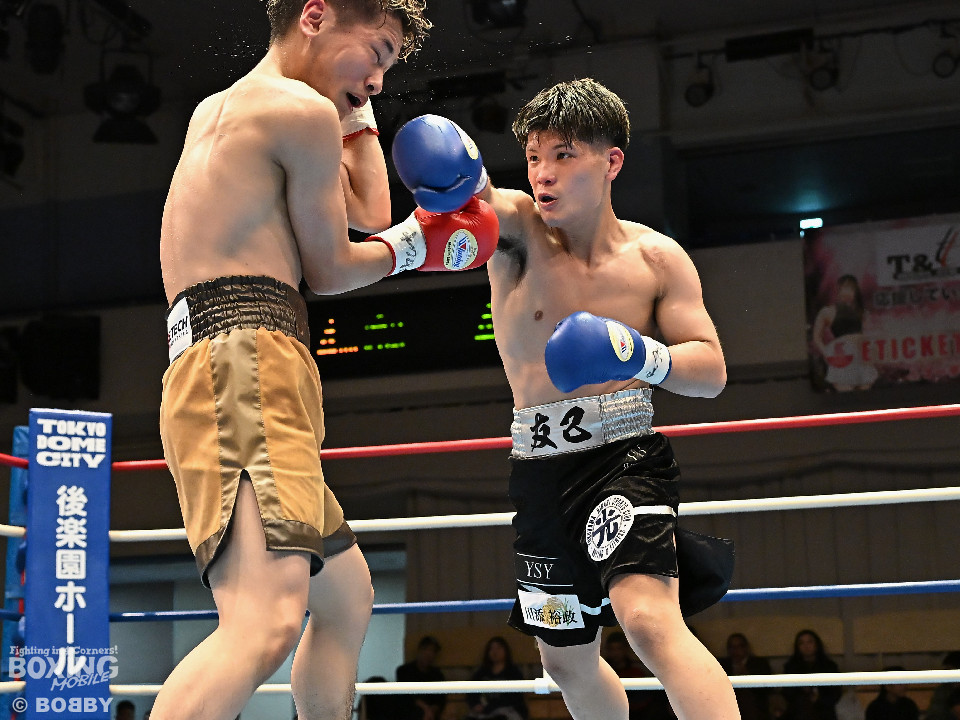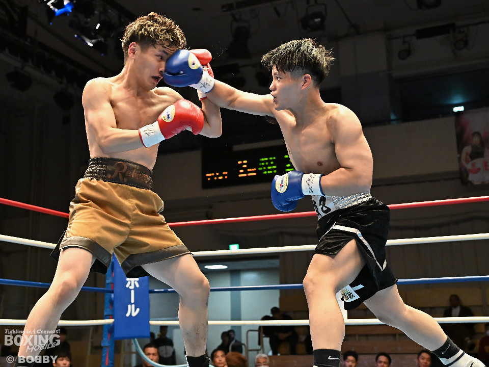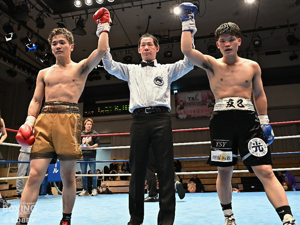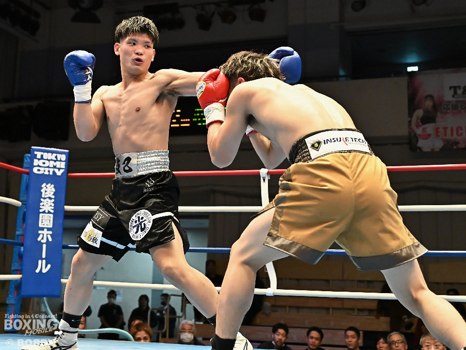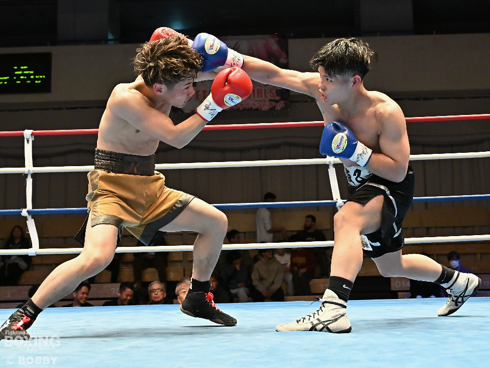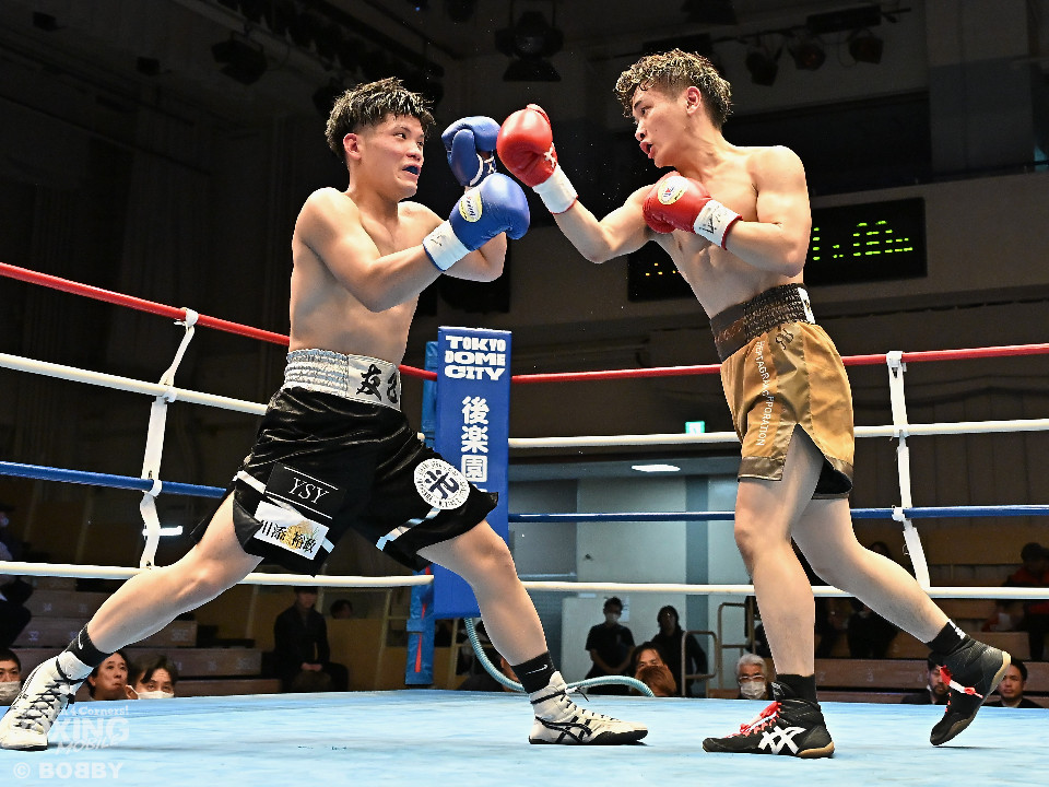 試合:互いにフェイントをかけつつジャブを繰り出し、機会を探ると、赤城がボディジャブで先制、永野はワンツーをヒットした。2回、ワンツーを軸に攻勢を強めた永野に対し、赤城は打ち終わりに左フックをヒット。右から左アッパーにつなげた。3回、左アッパーで一瞬動きを止めた永野に追撃した赤城は右をヒット。4回、ボディからワンツーを返した赤城に対し、永野はワンツー連打で対抗した。結果は三者三様のドローとなった。