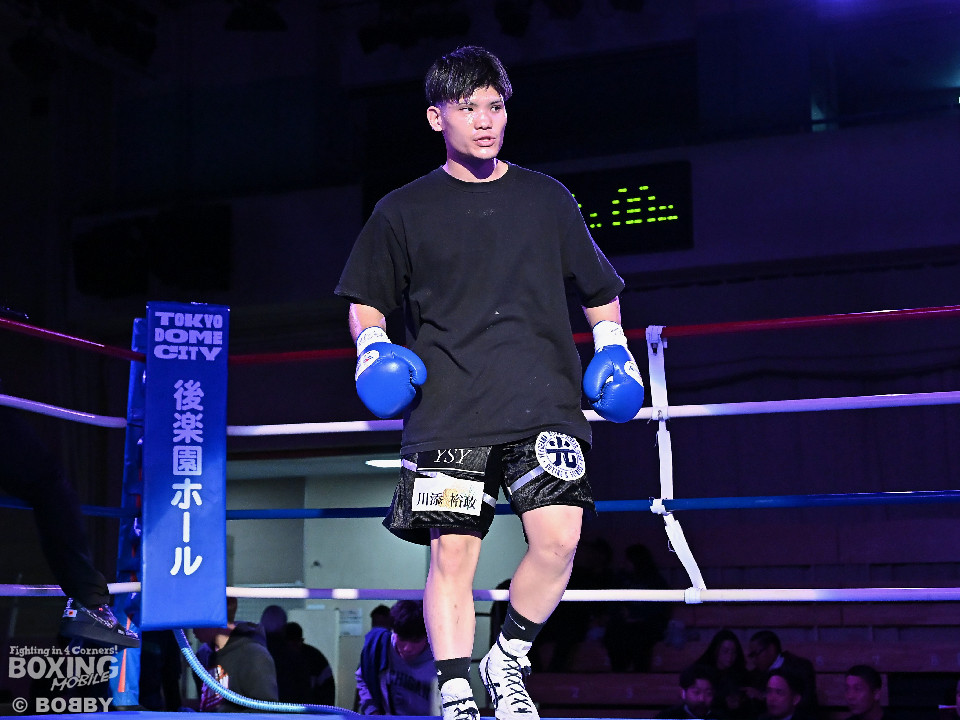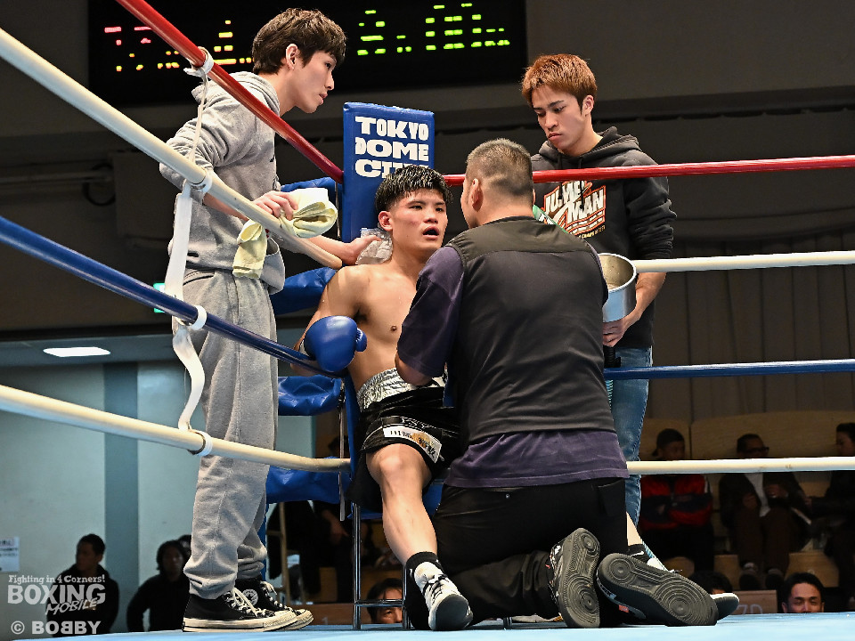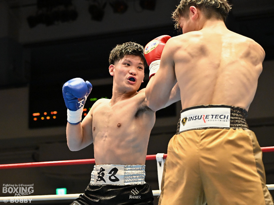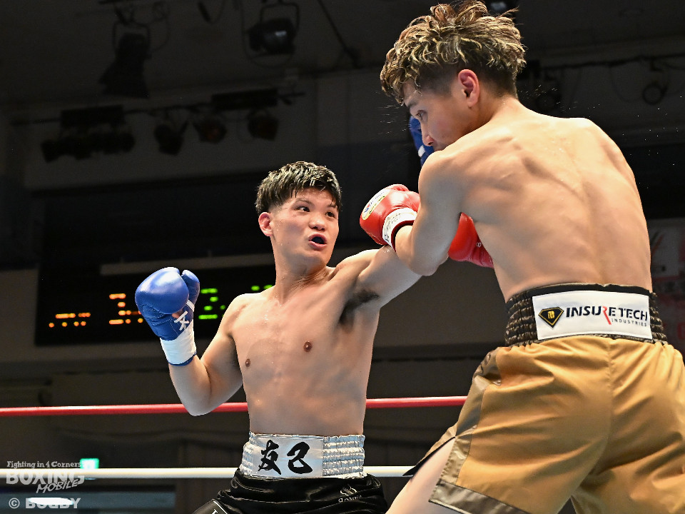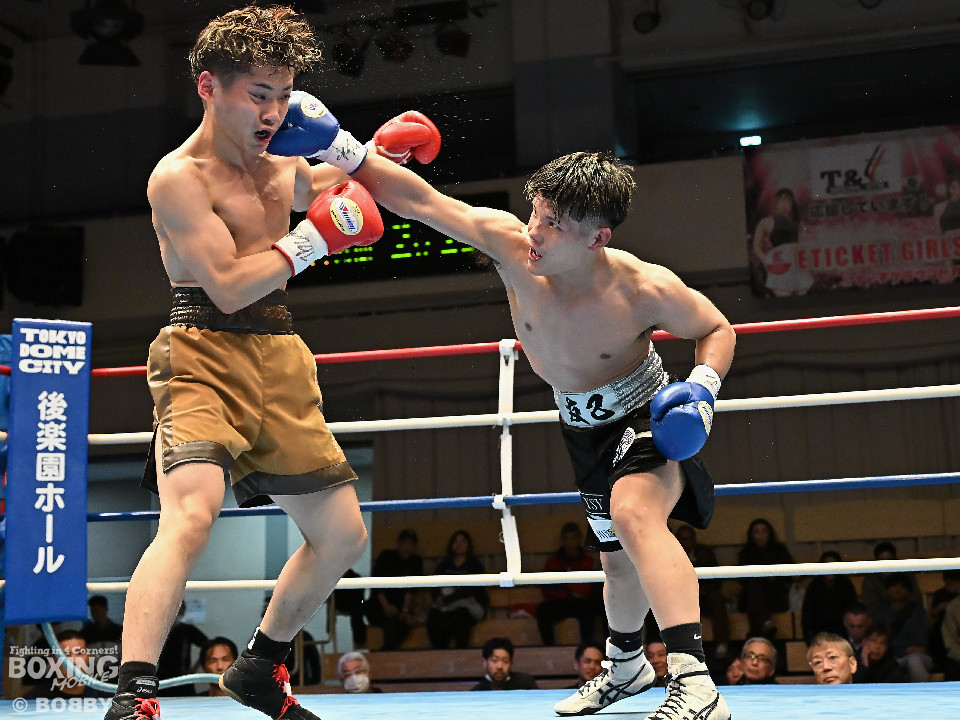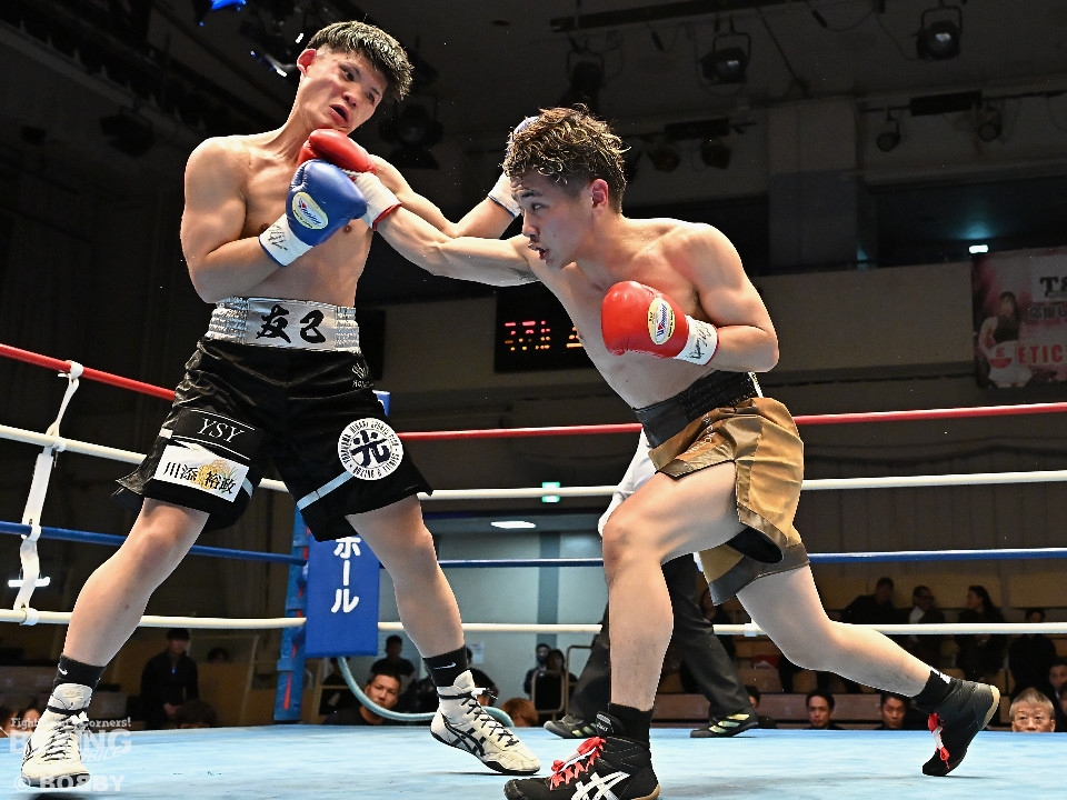 試合:互いにフェイントをかけつつジャブを繰り出し、機会を探ると、赤城がボディジャブで先制、永野はワンツーをヒットした。2回、ワンツーを軸に攻勢を強めた永野に対し、赤城は打ち終わりに左フックをヒット。右から左アッパーにつなげた。3回、左アッパーで一瞬動きを止めた永野に追撃した赤城は右をヒット。4回、ボディからワンツーを返した赤城に対し、永野はワンツー連打で対抗した。結果は三者三様のドローとなった。