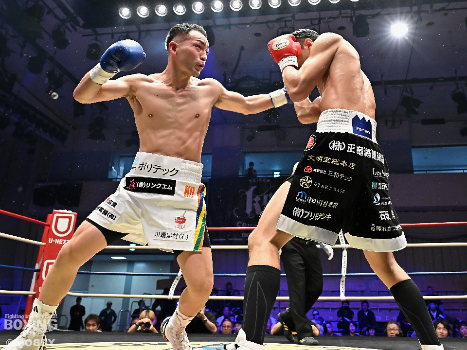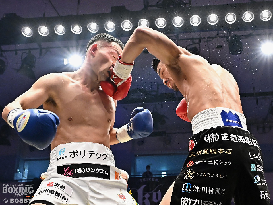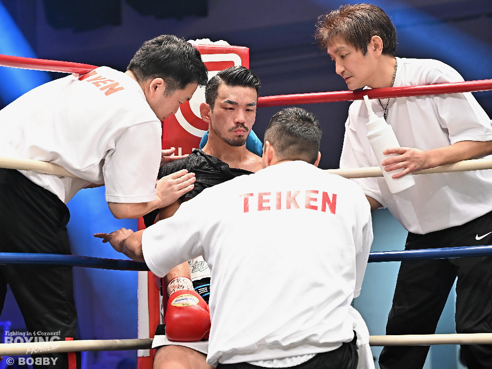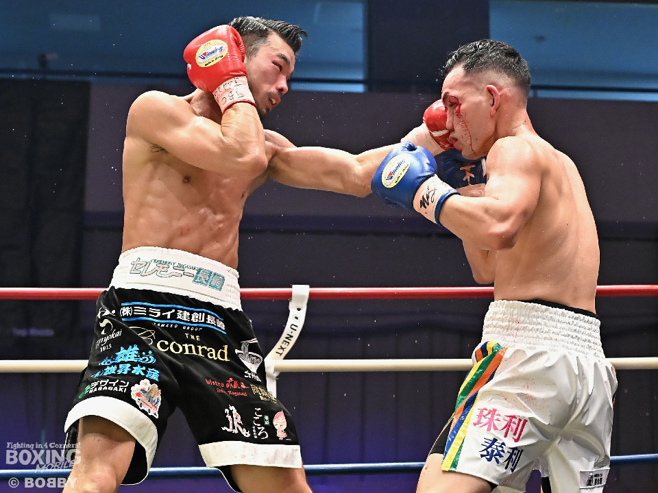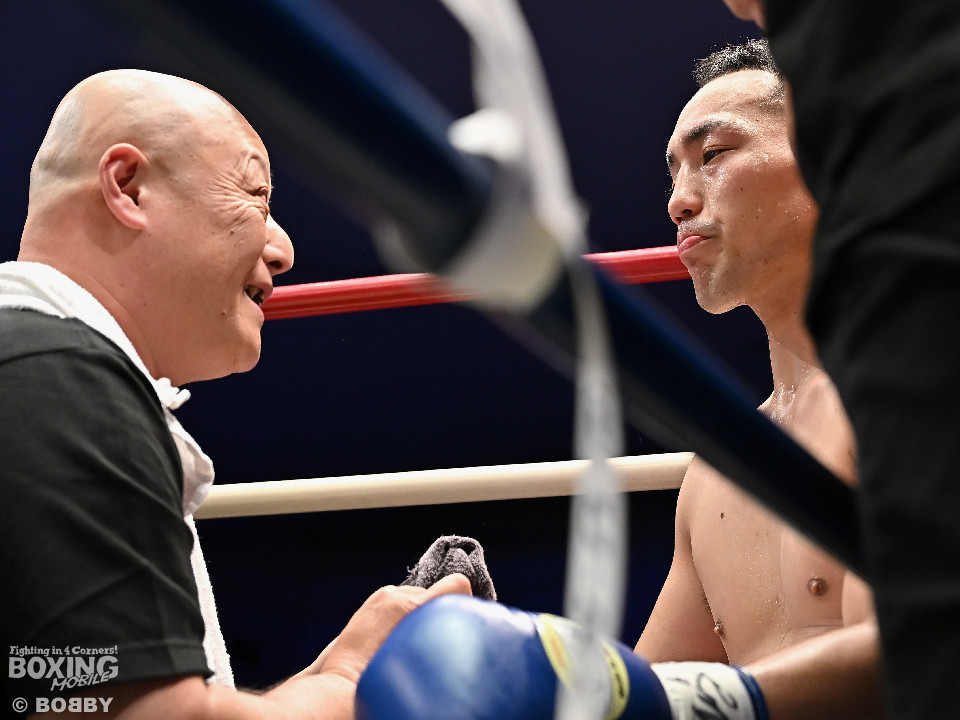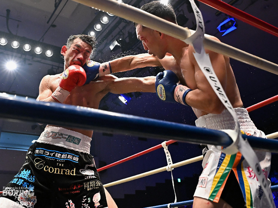 試合:WBOアジアパシフィック・スーパーウェルター級2位の辻本に3戦目の落合が挑んだ。初回、落合が距離で外すと左ボディを好打。さらに上下に打ち分けリズム感のある攻撃。2回、辻本は打ち下ろしの右ストレートで左目尻を切り裂くとプレスをかけて反撃。3回、中間距離で激しいパンチの応酬となるが、落合の左フックの見栄えがいい。4回、辻本はプッシュしながら左ボディを突き刺し攻勢をアピール。行ったり来たりのラウンドが続いた。5回、落合は右ショートをねじ込むが、辻本は表情を変えず倍返し。続く回もジリジリと距離を詰めて手数を増やしたのは辻本。7回、傷が深くなった落合に2度目のドクターチェックが入るとレフェリーはこれ以上の試合続行を不能と判断。辻本がTKO勝ちで6連勝を飾った。