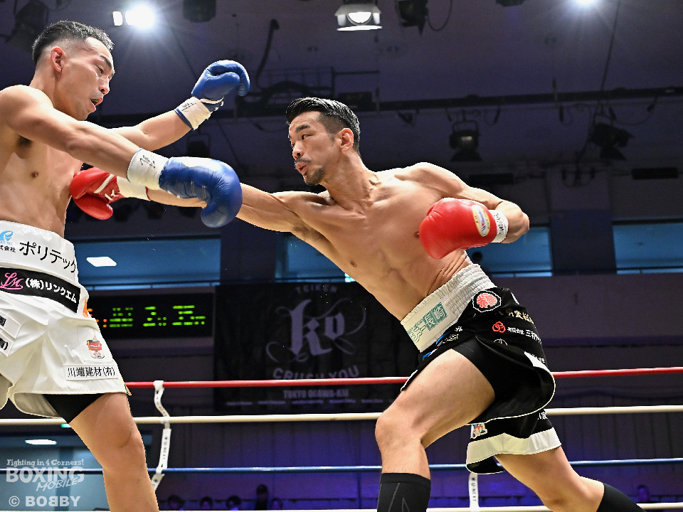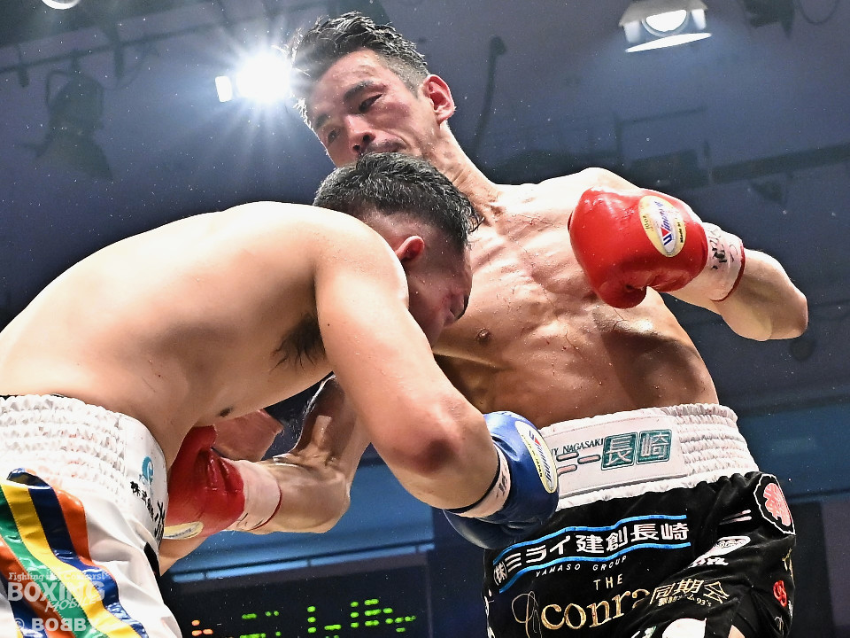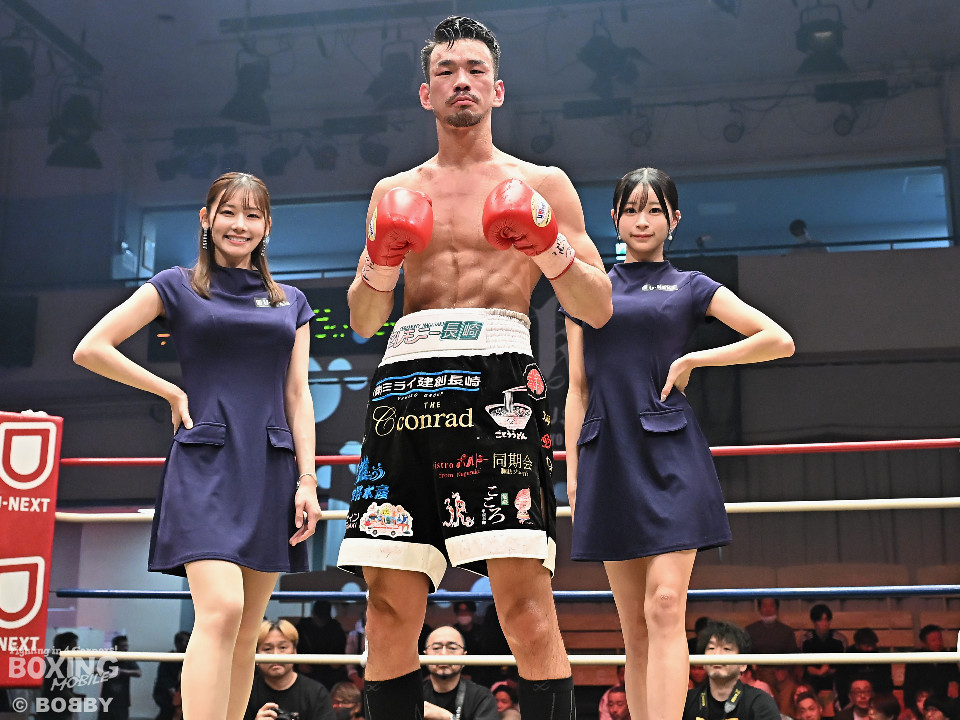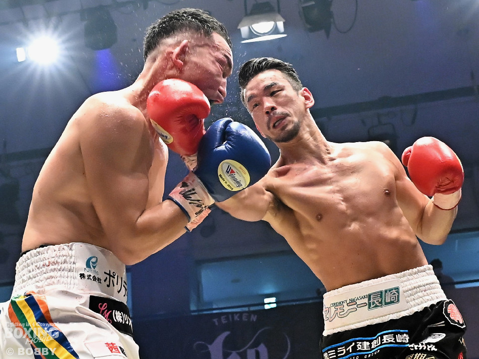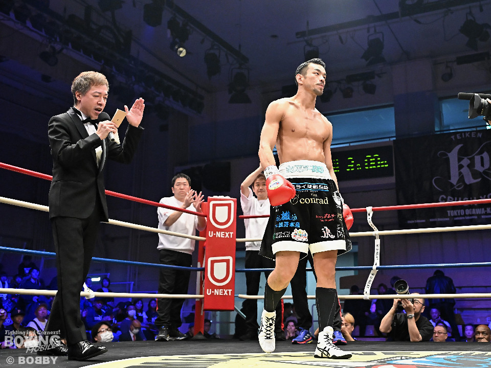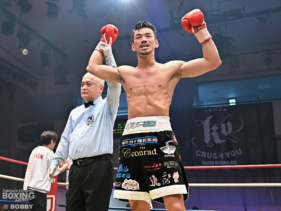 試合:WBOアジアパシフィック・スーパーウェルター級2位の辻本に3戦目の落合が挑んだ。初回、落合が距離で外すと左ボディを好打。さらに上下に打ち分けリズム感のある攻撃。2回、辻本は打ち下ろしの右ストレートで左目尻を切り裂くとプレスをかけて反撃。3回、中間距離で激しいパンチの応酬となるが、落合の左フックの見栄えがいい。4回、辻本はプッシュしながら左ボディを突き刺し攻勢をアピール。行ったり来たりのラウンドが続いた。5回、落合は右ショートをねじ込むが、辻本は表情を変えず倍返し。続く回もジリジリと距離を詰めて手数を増やしたのは辻本。7回、傷が深くなった落合に2度目のドクターチェックが入るとレフェリーはこれ以上の試合続行を不能と判断。辻本がTKO勝ちで6連勝を飾った。