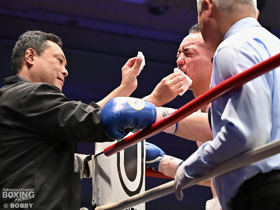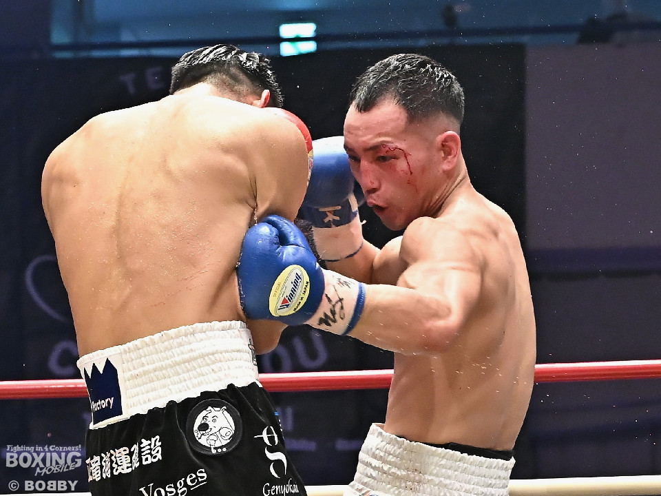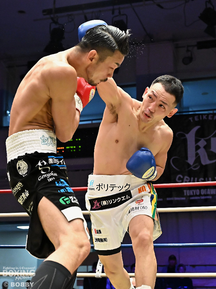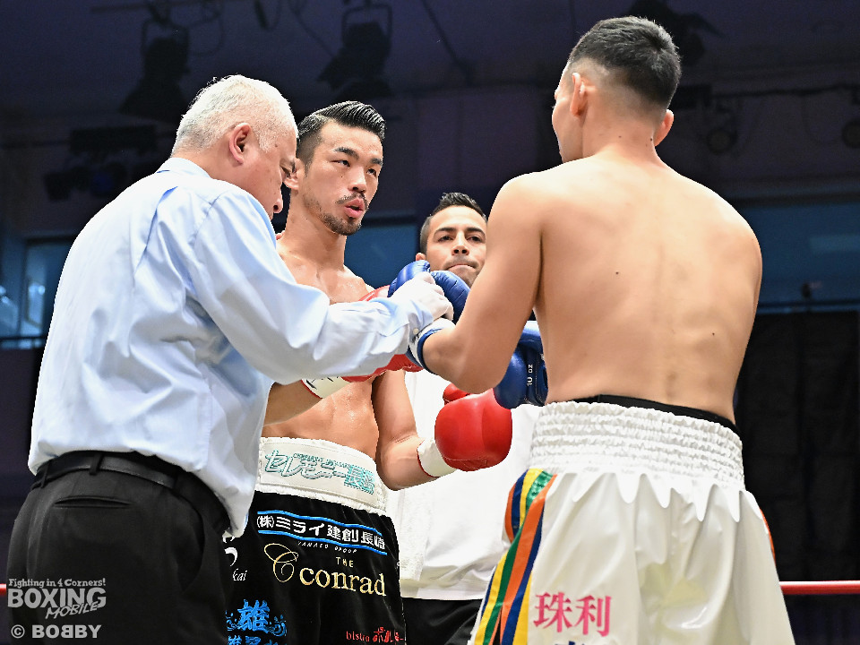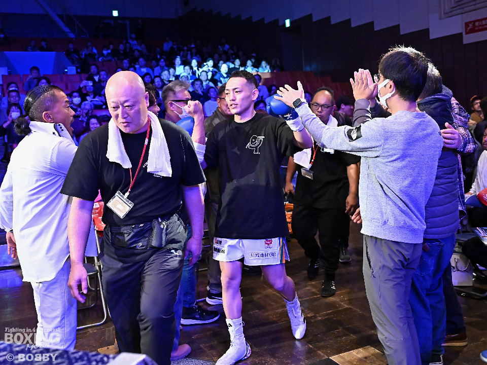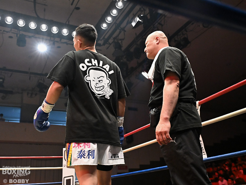 試合:WBOアジアパシフィック・スーパーウェルター級2位の辻本に3戦目の落合が挑んだ。初回、落合が距離で外すと左ボディを好打。さらに上下に打ち分けリズム感のある攻撃。2回、辻本は打ち下ろしの右ストレートで左目尻を切り裂くとプレスをかけて反撃。3回、中間距離で激しいパンチの応酬となるが、落合の左フックの見栄えがいい。4回、辻本はプッシュしながら左ボディを突き刺し攻勢をアピール。行ったり来たりのラウンドが続いた。5回、落合は右ショートをねじ込むが、辻本は表情を変えず倍返し。続く回もジリジリと距離を詰めて手数を増やしたのは辻本。7回、傷が深くなった落合に2度目のドクターチェックが入るとレフェリーはこれ以上の試合続行を不能と判断。辻本がTKO勝ちで6連勝を飾った。