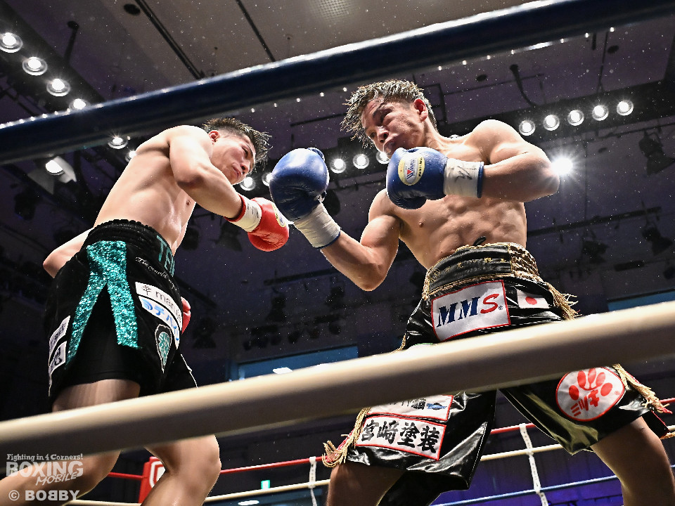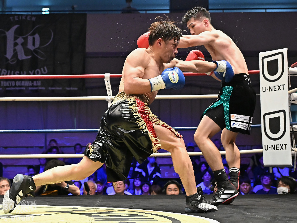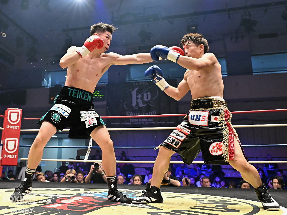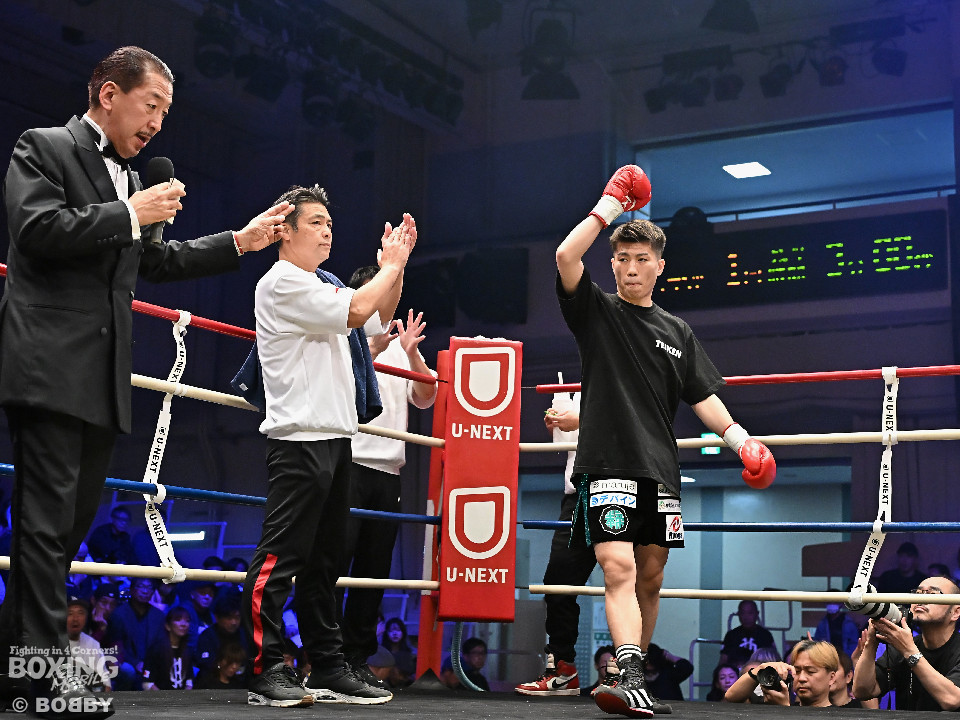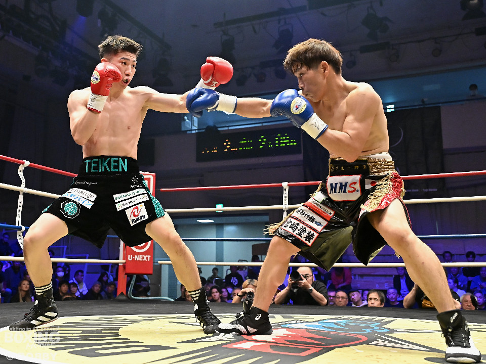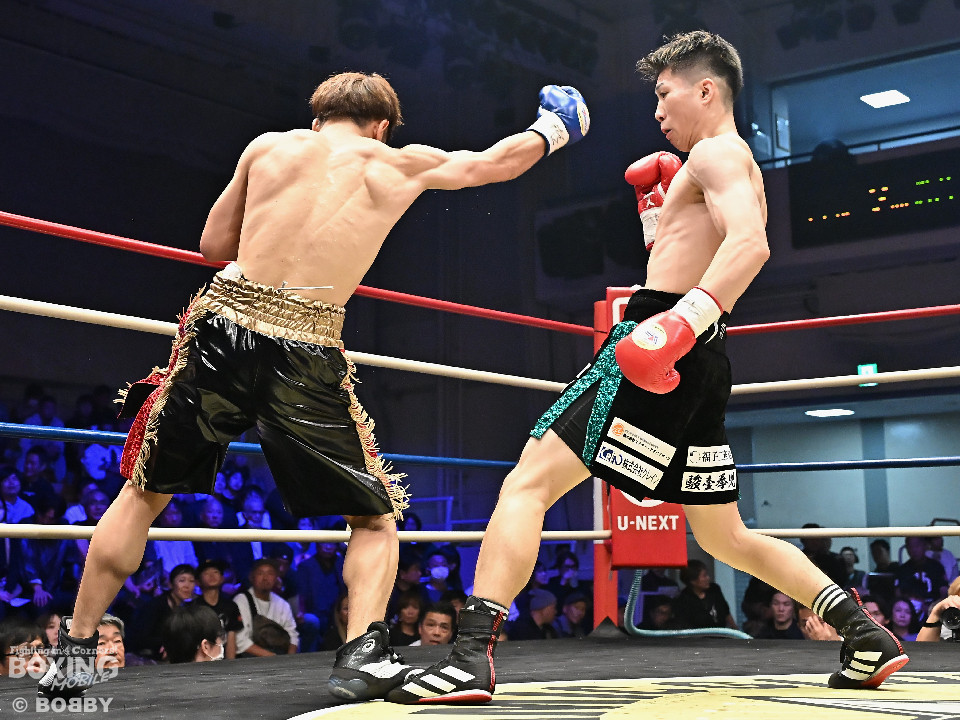 試合:1~2回、サウスポー岸根が前後を意識しながら左を狙うのに対し、福井は慎重にリターンを返す構図。激しいペース争いが続いた。3回、岸根が右ボディを叩くが、福井は右ストレートで顔を弾き見栄えの良さをアピール。4回、左から切り込む岸根だが、距離が遠く決定打を打ち込めず。福井はリターンの左フックを決めた。5回、福井は右ボディストレートを差し込みポイントを加点。頭がぶつかり左目を痛めた岸根に対し休憩が与えられた。6回、岸根は強引に前に出て右フックを強振、流れを変えに行く。7回、福井は打ち合いを避けてカウンターを軸に試合を進めた。8回、福井は右カウンターでダウンを奪取。再開後、オーソドックスにスイッチした岸根は、右オーバーハンドを叩きつけるが、福井は冷静さを失わなかった。福井が今年4月の日本タイトル戦以来の再起戦を飾った。