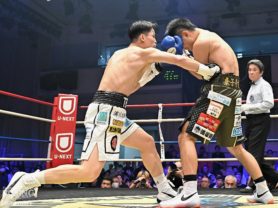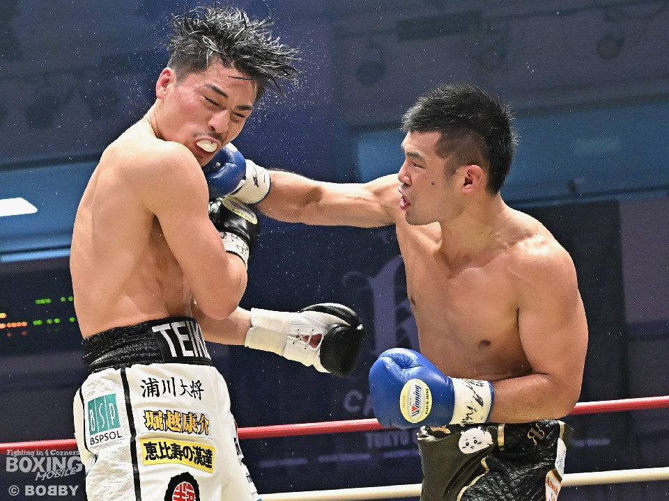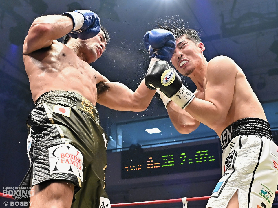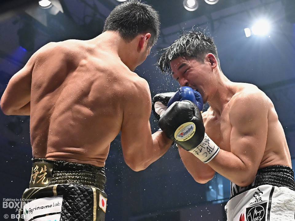 試合:空位の日本スーパーウェルター級王座を玉山と神風が争った。玉山がプレスをかけながらワンツー、左ボディで先制。神風はガードを固めながらジャブで対抗。2回、神風は左ボディから左フックにつなげて反撃。3回、神風は右フックでバランスを崩させると回転力を上げてアグレッシブな姿勢。4回、接近戦でのショートパンチの交換、玉山の有効打がやや上回った印象。5回、神風は右フックをねじ込むと左右フックを叩きつけて攻勢。前半終了時の公開採点は、48-47×2、49-46×1で神風がリード。6回、神風は右アッパーで顔を跳ね上げるとパパっとまとめた。7回、神風は右フックでグラつかせると一気にスパート!ピンチの玉山はクリンチで逃れるとラウンド終了間際に反撃に転じた。8回、玉山はワンツーから手数を増やして猛追。壮絶な打撃戦に会場は興奮に包まれた。9回、休むことのない乱打戦で意地のぶつかり合い!玉山はヒッティングで右目上をカットした。10回、両応援団の大声援が起こる中、神風が右フックをねじ込むと連打で攻勢。最後まで粘る玉山を振り切ると試合終了間際にもスパートをかけた。ジャッジ2者の支持を得た神風が新チャンピオン。激戦を制した神風はリング上で歓喜の涙を流した。