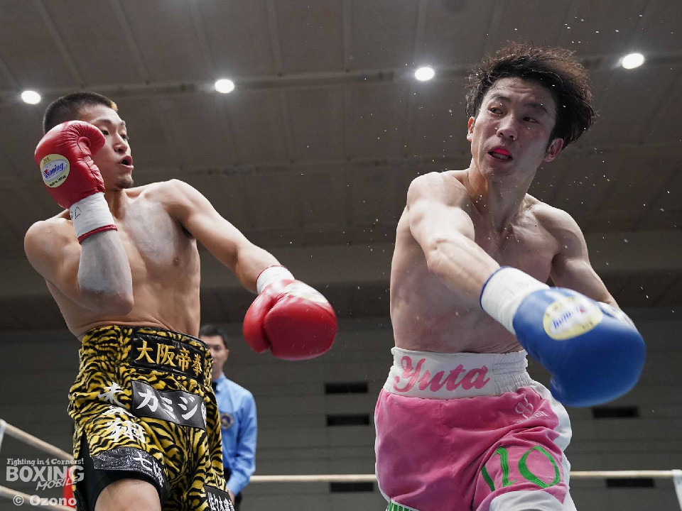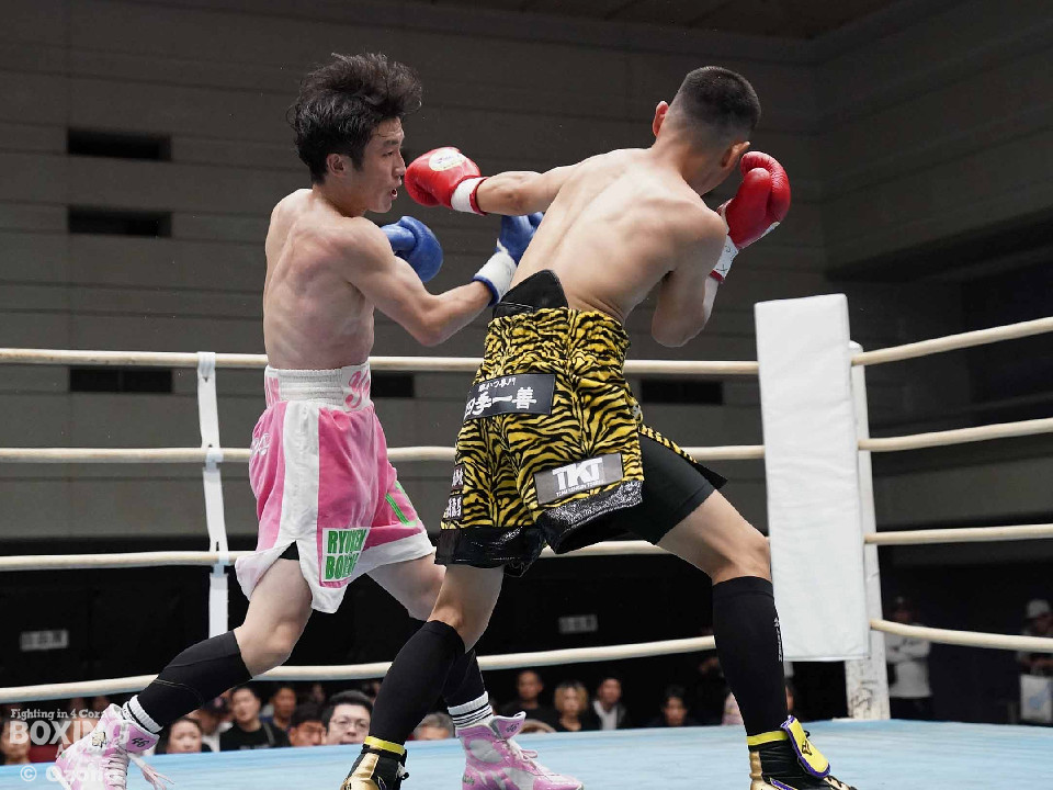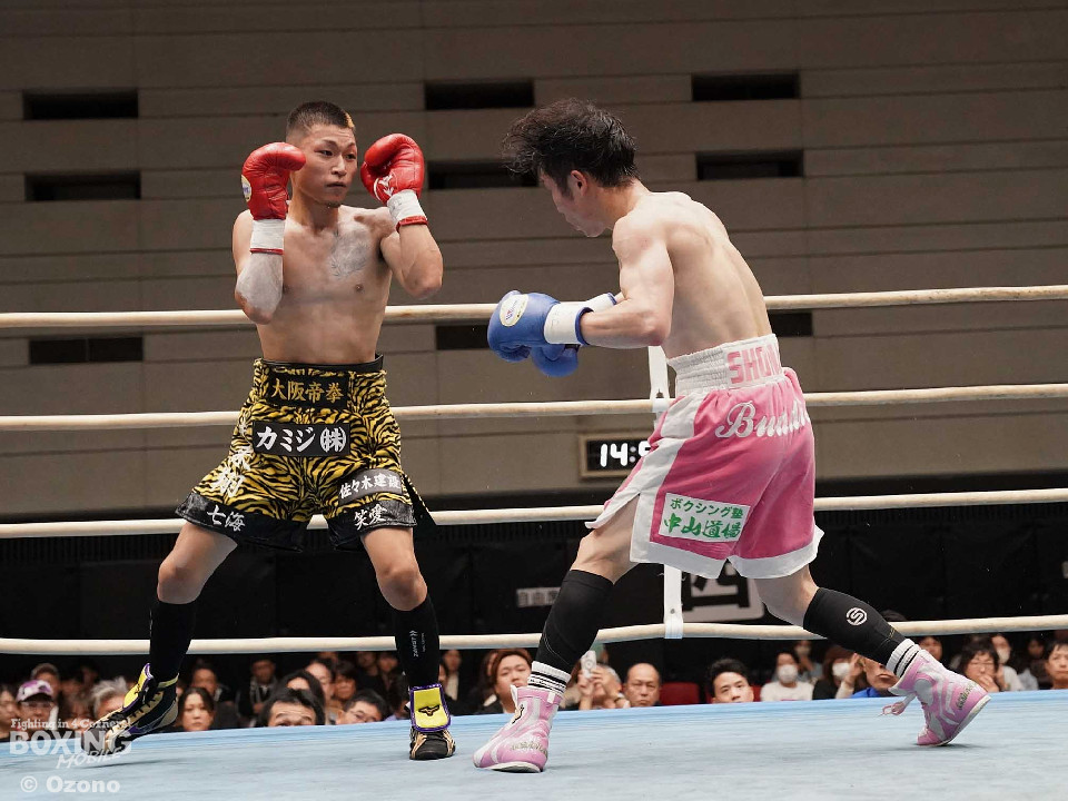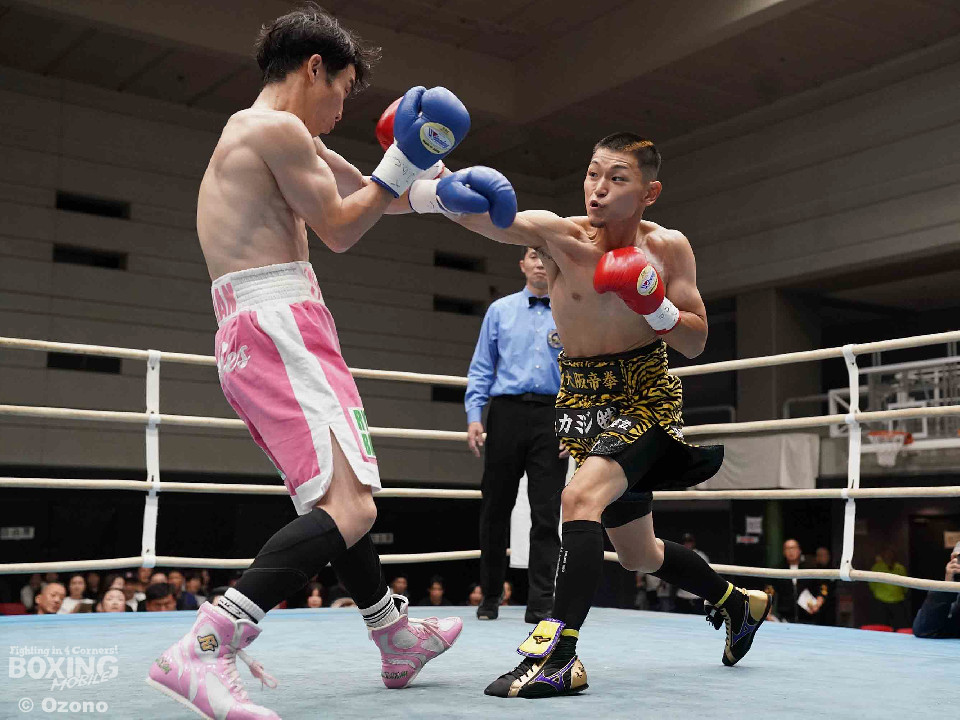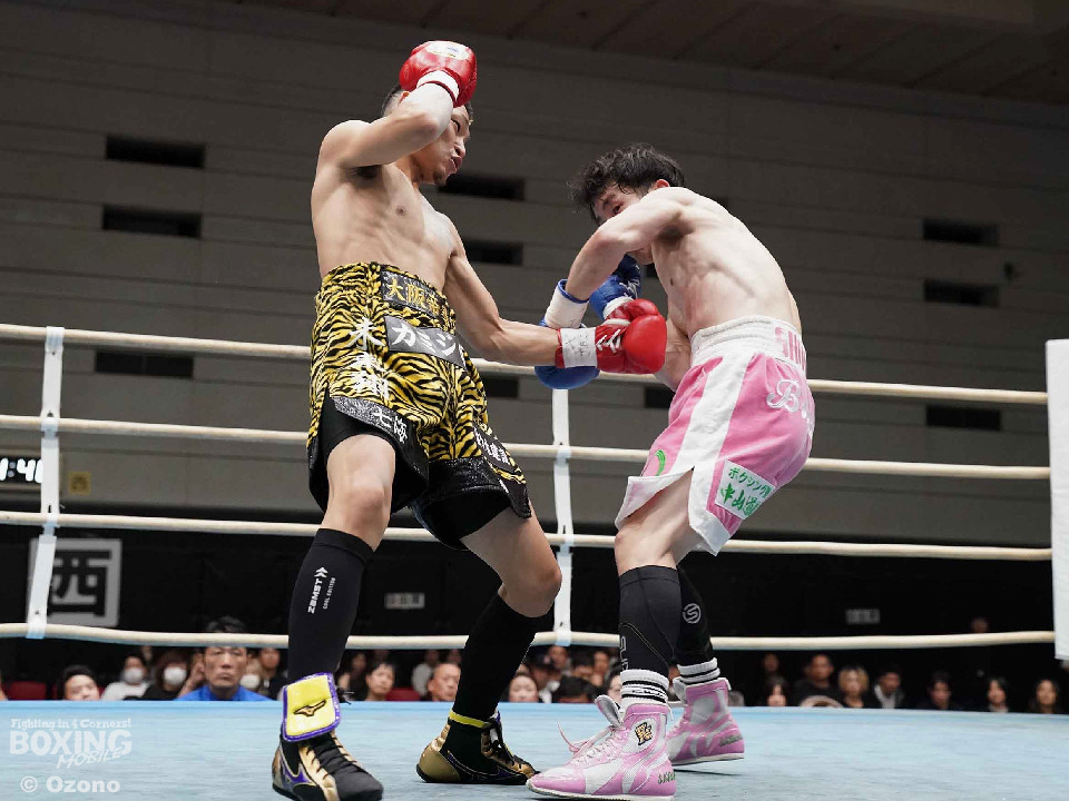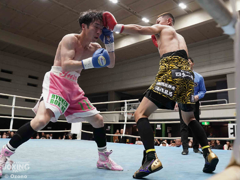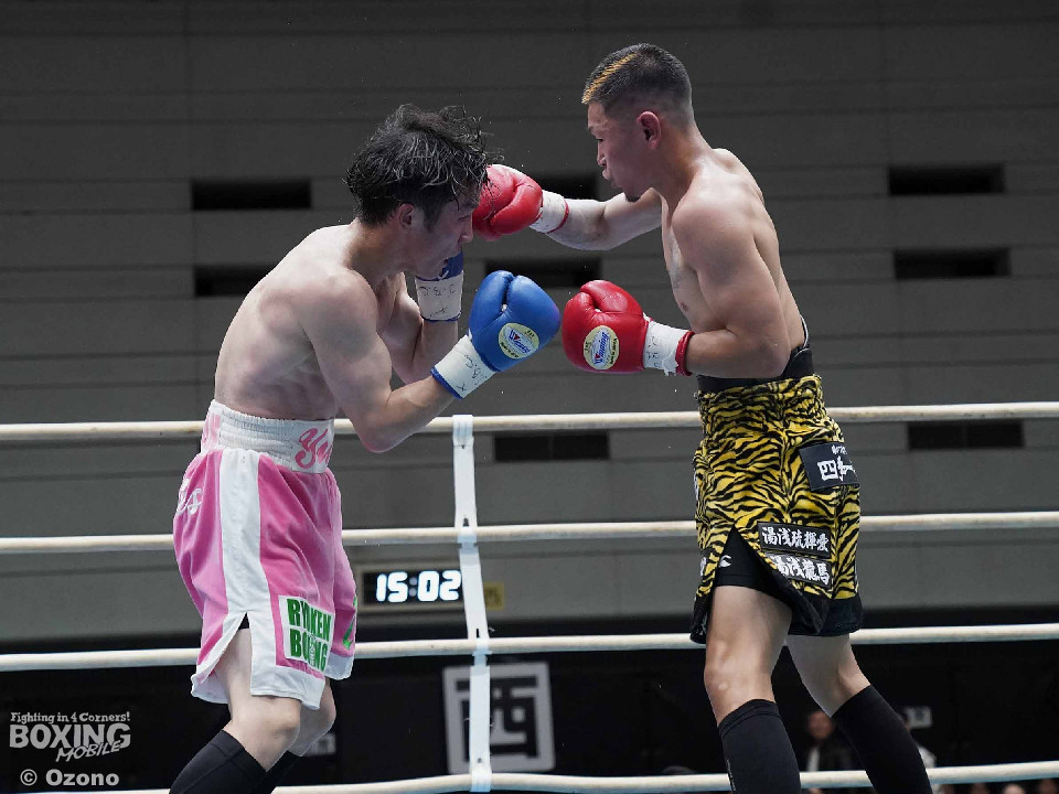 試合:湯浅がジャブで迎え撃つと単発の右ストレートをヒット。ワンツーを返した沖吉だが、やや動きが硬いか。2回、沖吉はジリジリと距離を詰めてワンツーで積極的な攻撃。3回、沖吉はプレスをかけて右ショート、ボディにコツコツと当てて優勢をアピール。4回、後手に回っていた湯浅だが、ラウンド終盤にワンツーで突き放し挽回。5回、至近距離でパンチを交錯させて互角の展開。6回、細かくパンチを集める沖吉に対し、湯浅は要所でワンツーを決めた。採点は割れたが沖吉に軍配が上がった。
