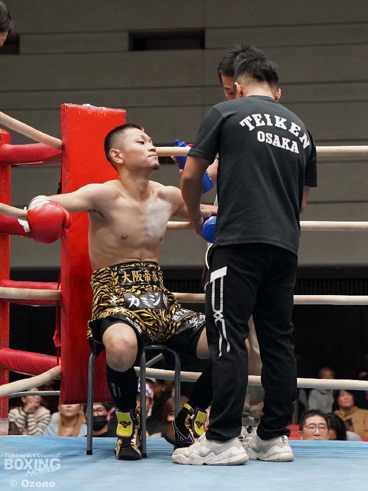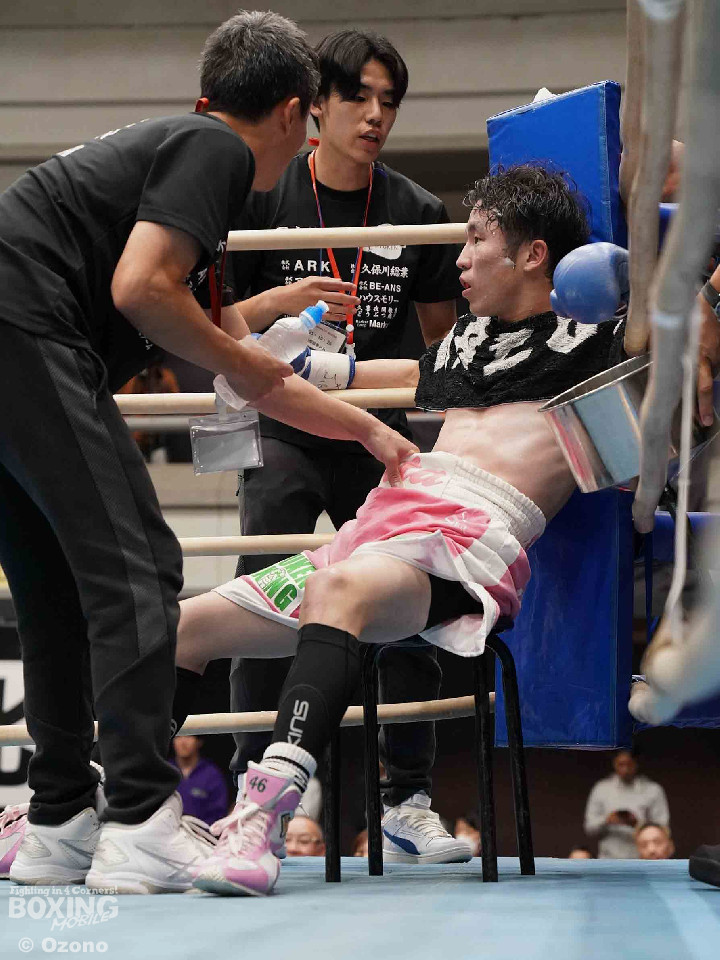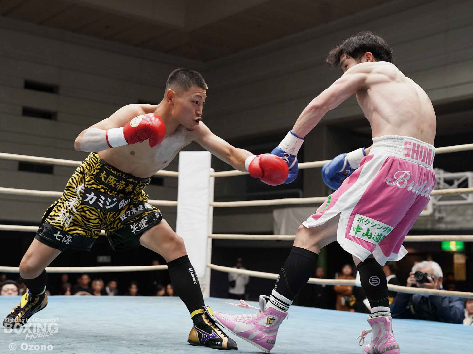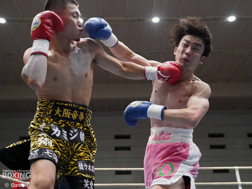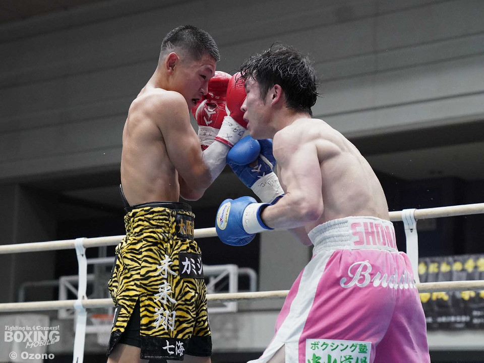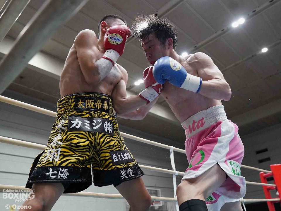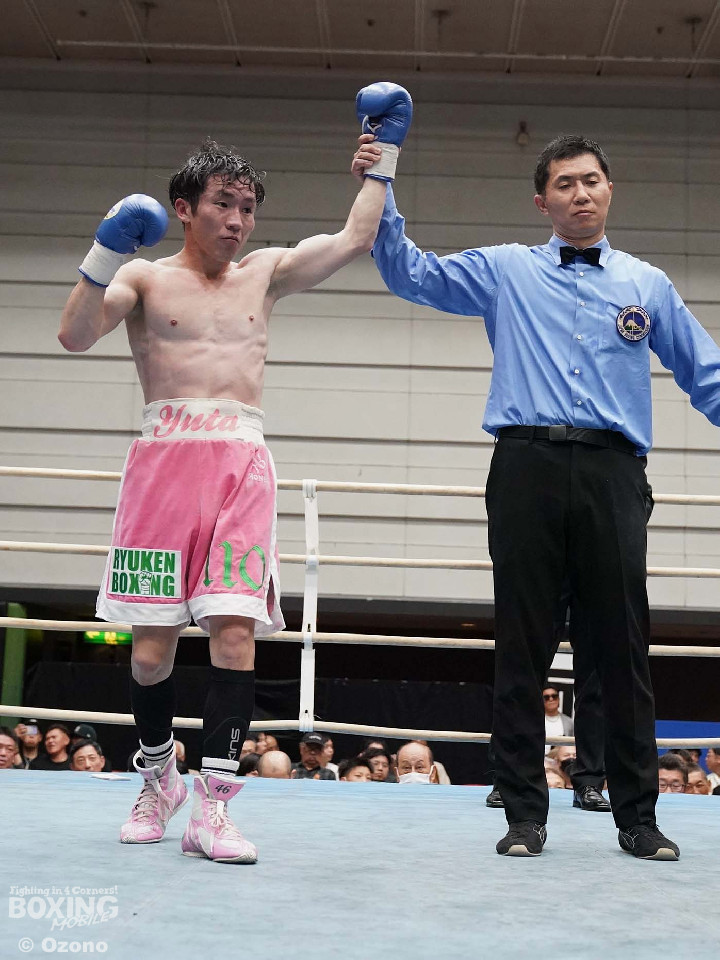 試合:湯浅がジャブで迎え撃つと単発の右ストレートをヒット。ワンツーを返した沖吉だが、やや動きが硬いか。2回、沖吉はジリジリと距離を詰めてワンツーで積極的な攻撃。3回、沖吉はプレスをかけて右ショート、ボディにコツコツと当てて優勢をアピール。4回、後手に回っていた湯浅だが、ラウンド終盤にワンツーで突き放し挽回。5回、至近距離でパンチを交錯させて互角の展開。6回、細かくパンチを集める沖吉に対し、湯浅は要所でワンツーを決めた。採点は割れたが沖吉に軍配が上がった。
