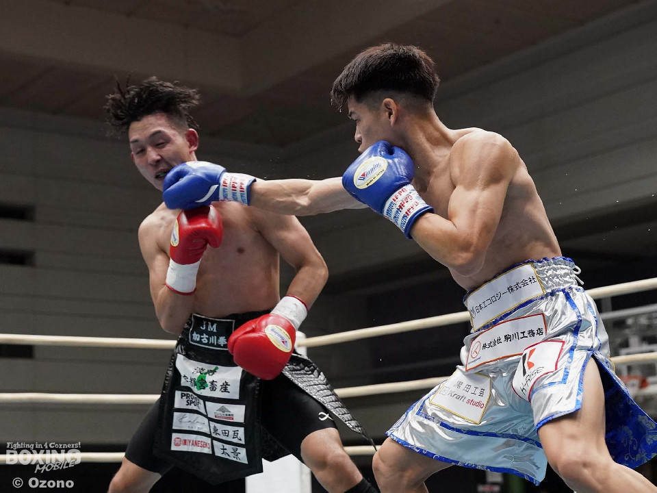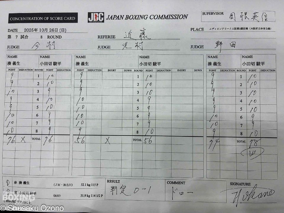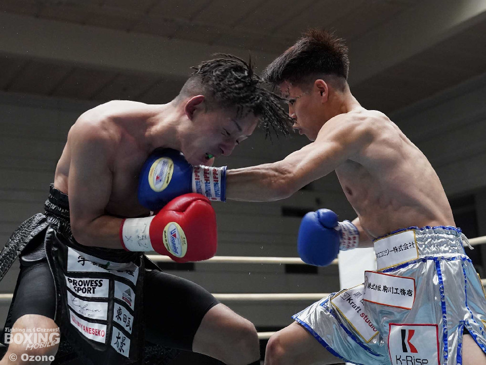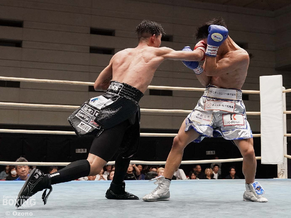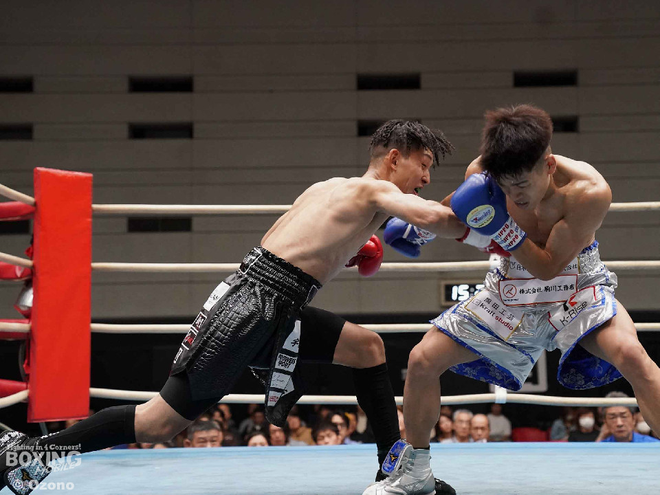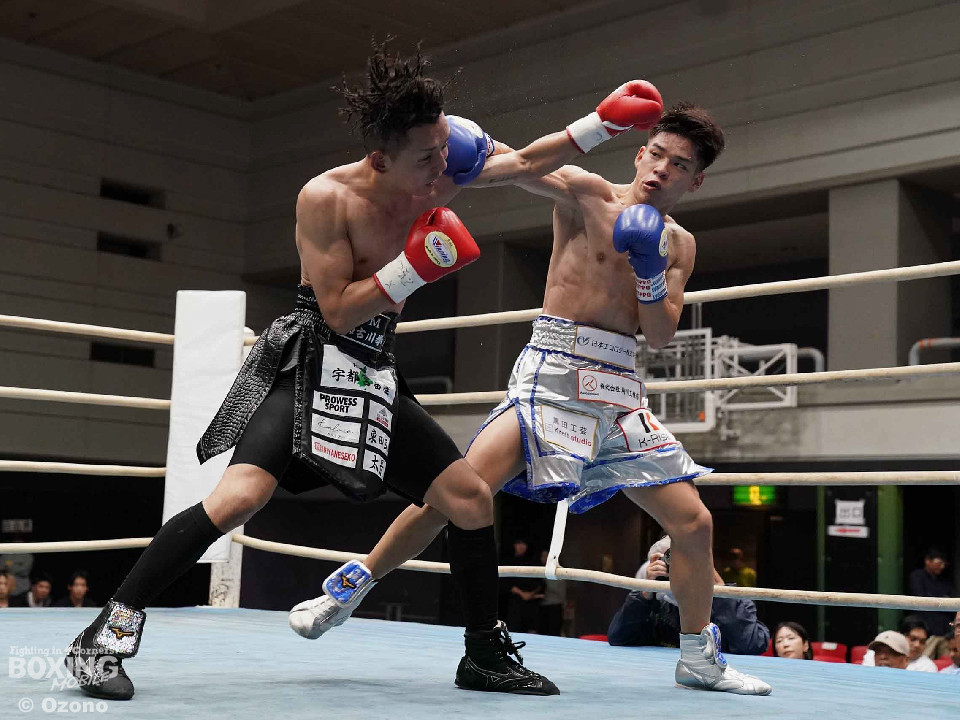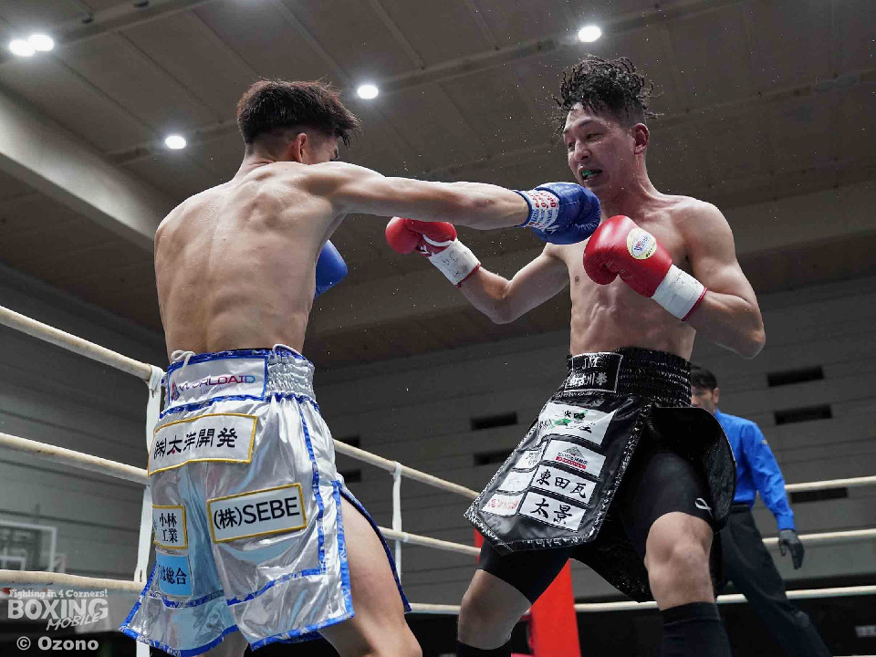 試合:序盤、サウスポー小田切が中間距離をキープしながら右フック、ワンツーをヒットすると打ち合いに付き合わず。3回、湊は強引に前に出て右ボディストレートから切り込むが、小田切は右フックを引っかけてリズムを保った。4回、小田切はスピードを活かした攻撃で的を絞らせず。5回も小田切はリターンの左を決めると距離が詰まるとクリンチで攻撃を遮断。6回、湊はステップインからワンツーをヒットし反撃すると続く回も要所で右ストレートを好打し挽回。8回、湊はプレスをかけて回転力を上げて攻勢をかけた。ジャッジ1者は小田切につけたが残り2者は引き分けとした。