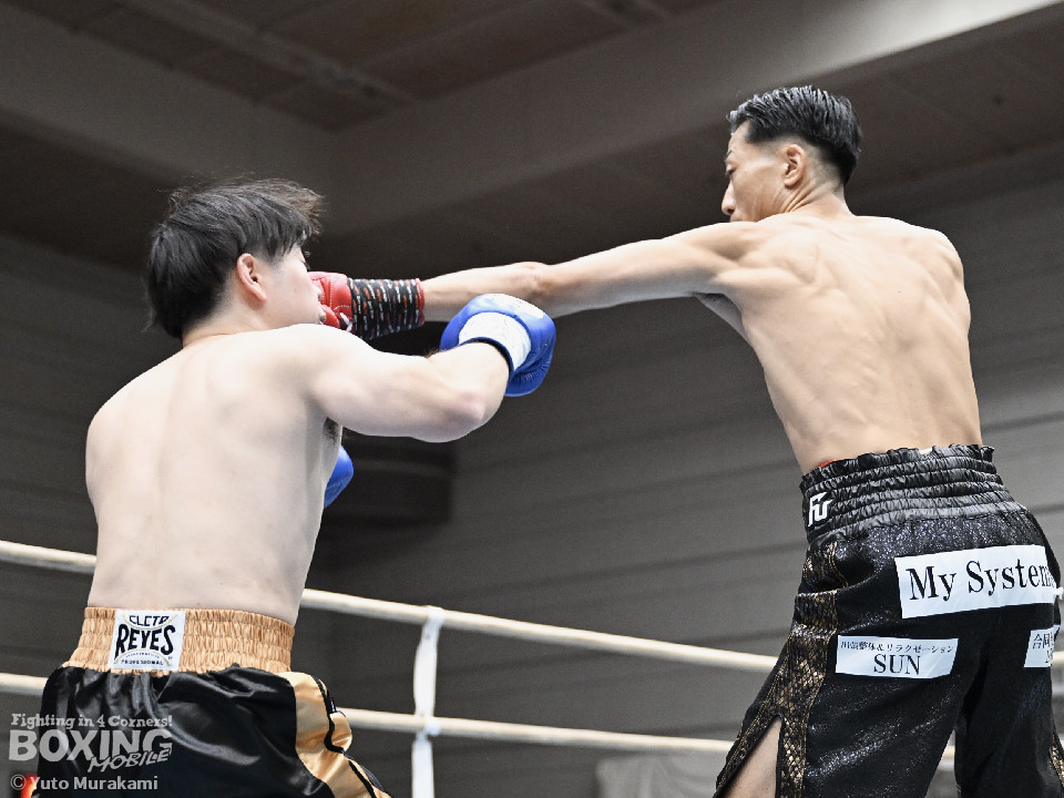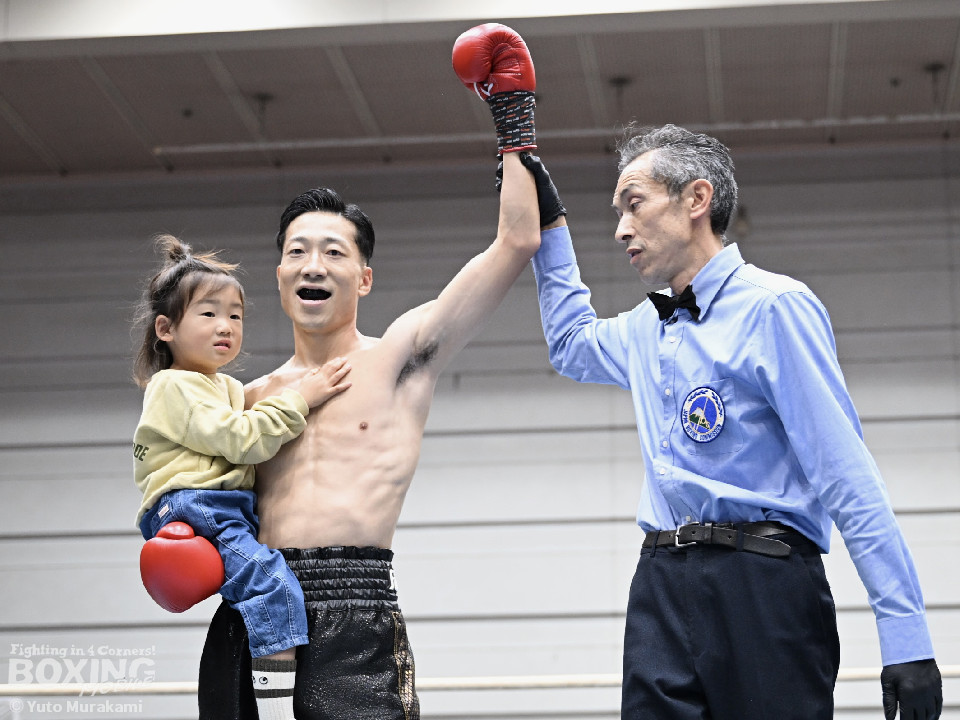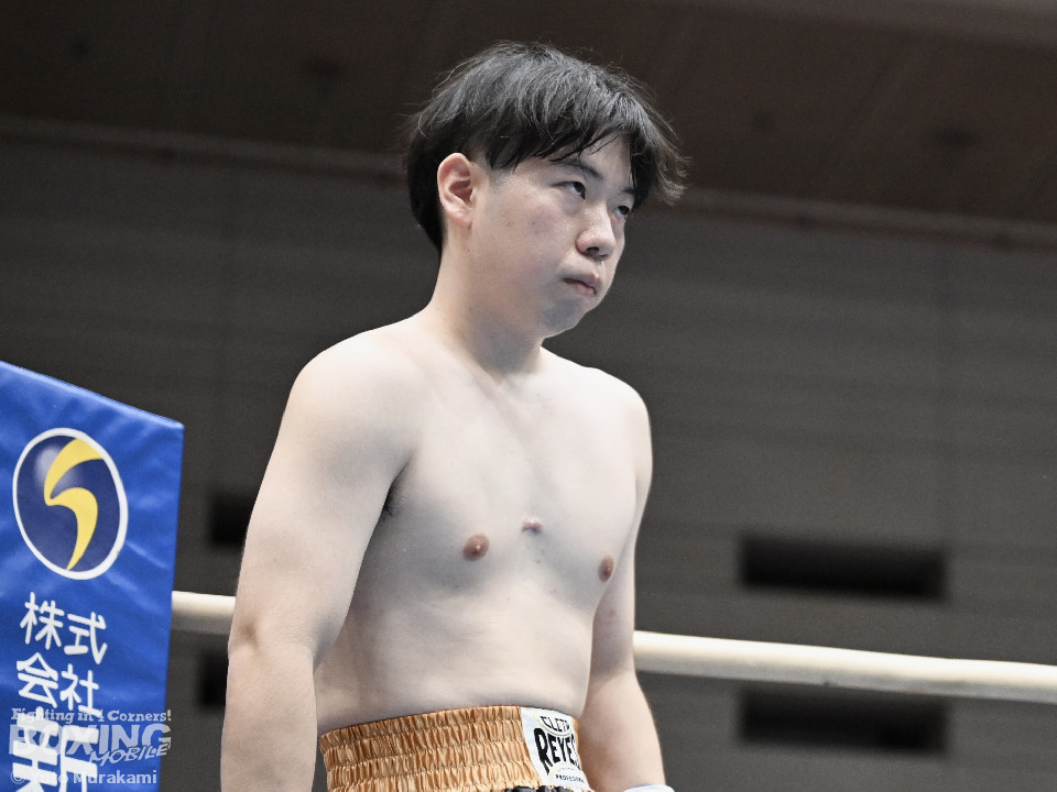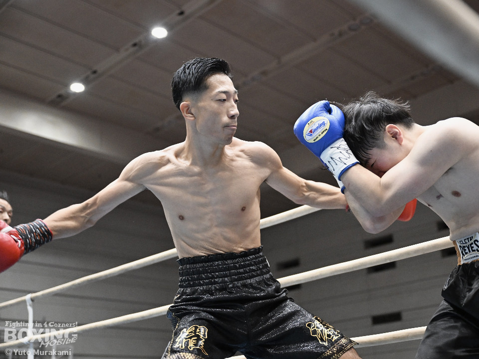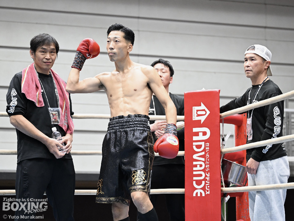 試合:サウスポー古池がサークリングしながらジャブを飛ばすのに対し、田中はジリジリと距離を詰めてタイミングを探る。慎重な立ち上がりとなったがラウンド終了間際、田中がワンツーでコーナーに押し込むと右ボディアッパーを突き刺すと、動きが止まった古池を見てレフェリーがストップした。