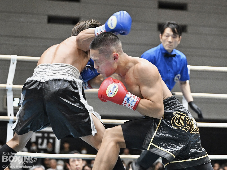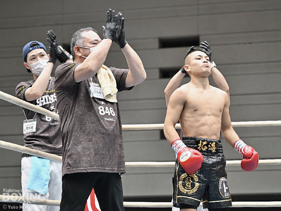 試合:松尾がステップインから右ボディストレートで先制。2回、鶴丸は前の手で揺さぶりをかけながら打っては、サイドに回り込み試合巧者ぶりを発揮。なかなかペースを掴めない松尾だが、左フックをジャストミート!痛烈なダウンを奪った。立ち上った鶴丸だがダメージを重く見たレフェリーがストップした。松尾が見事なKO勝ちを飾った。
