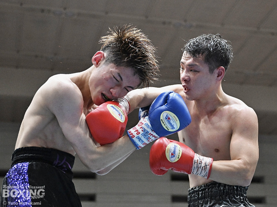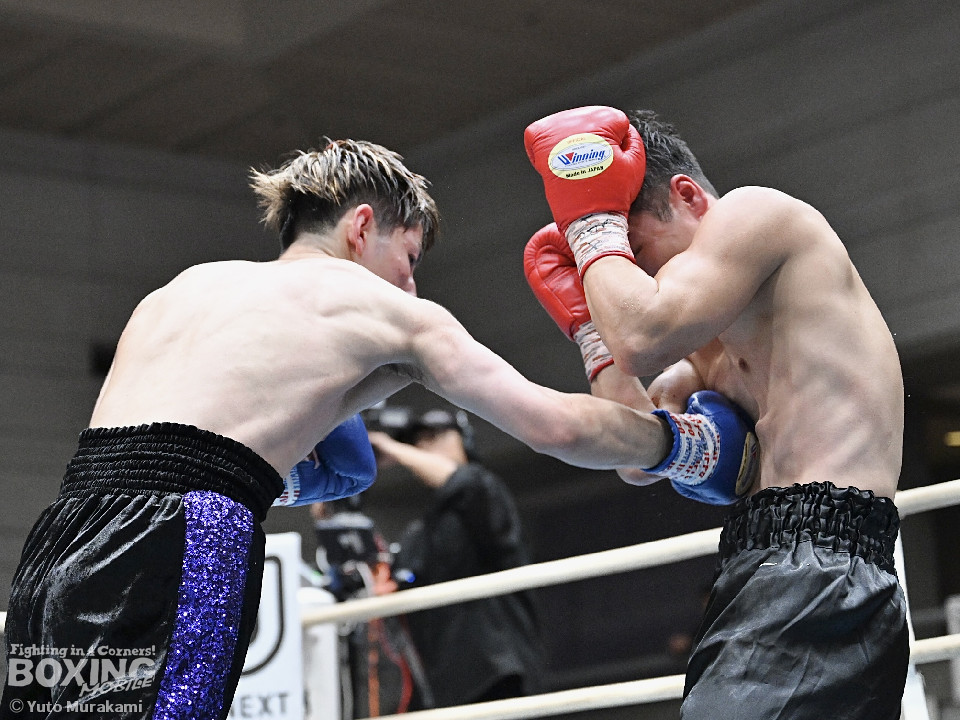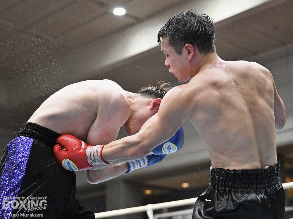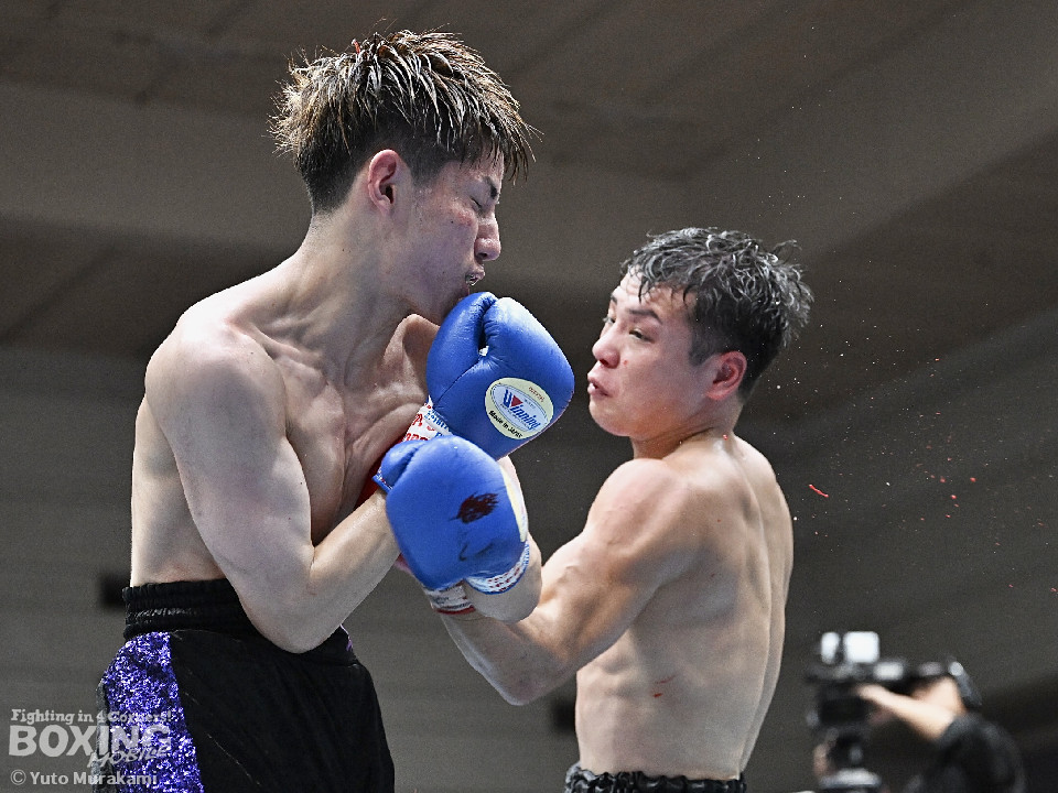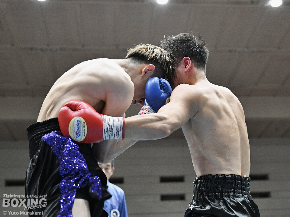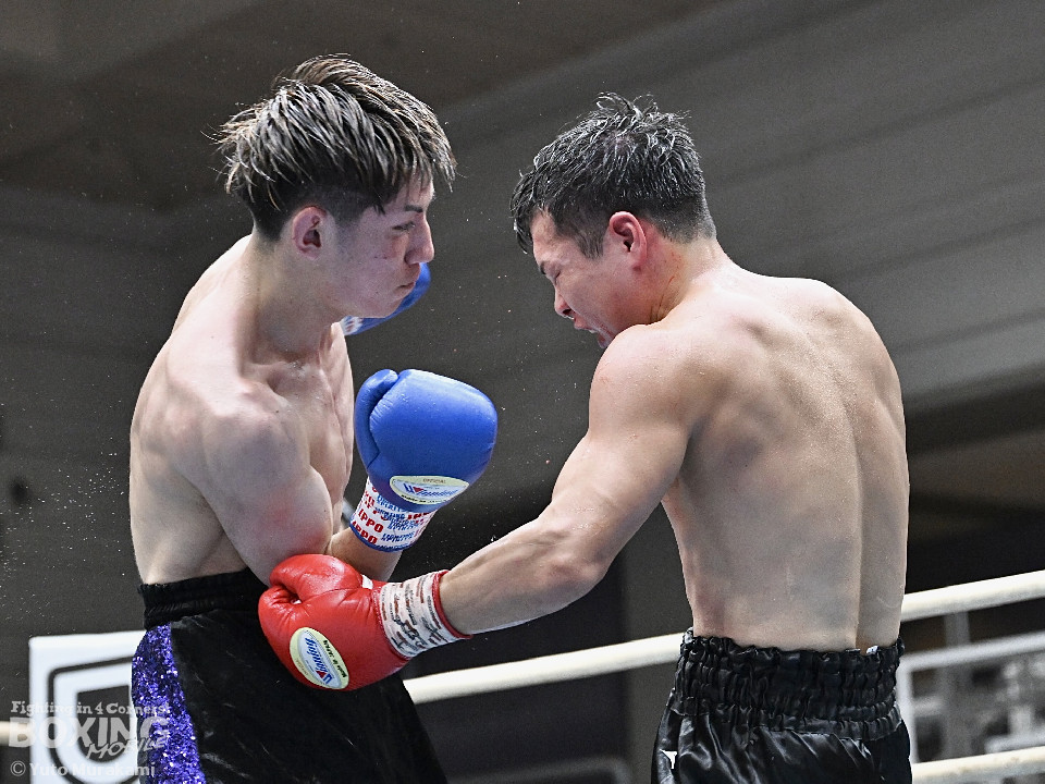 試合:守屋が距離を詰めて左ボディから馬力を活かした攻撃を展開。しかし、山本は左フックで顔を弾くとコンパクトなコンビネーションで倍返し。2回、我慢比べの肉弾戦が続く中、守屋が強烈な左ボディを突き刺した。3回、山本は右フックでグラつかせるとパンチをまとめるが、ここを踏ん張った守屋は必死に返した。4回、守屋は右フックをねじ込むと回転力を上げて攻勢をアピール。5回、打ち合いは激しさを増し、持てる力を出し切っての打ち合い。山本が右アッパー、左ボディを決めれば守屋も手数を繰り出した。ジャッジ2者の支持を得た守屋が激戦を制した。