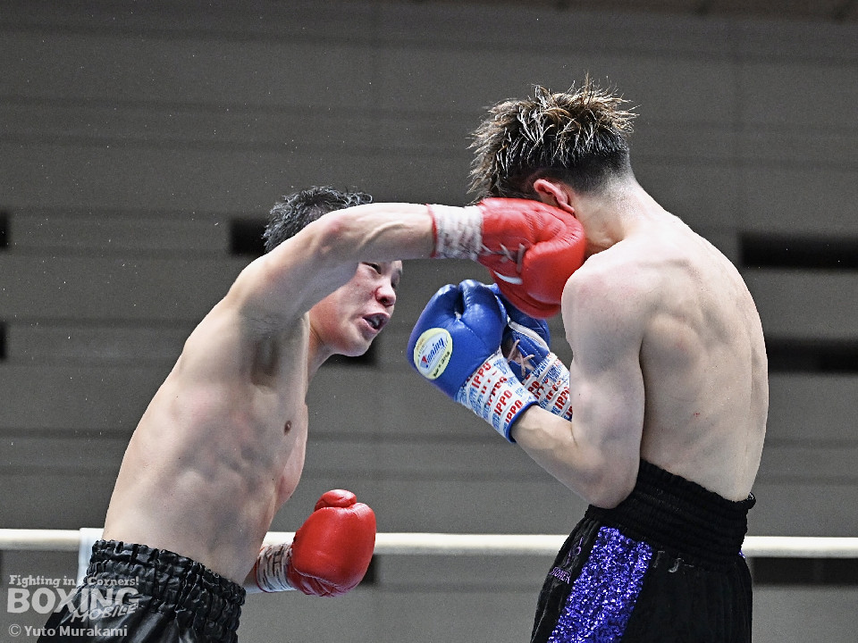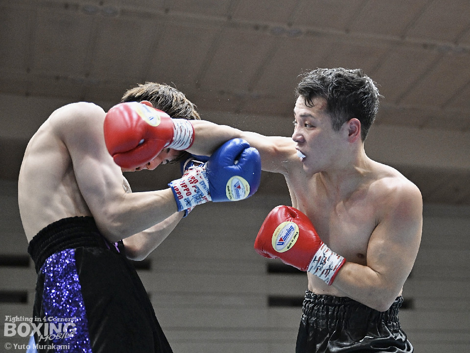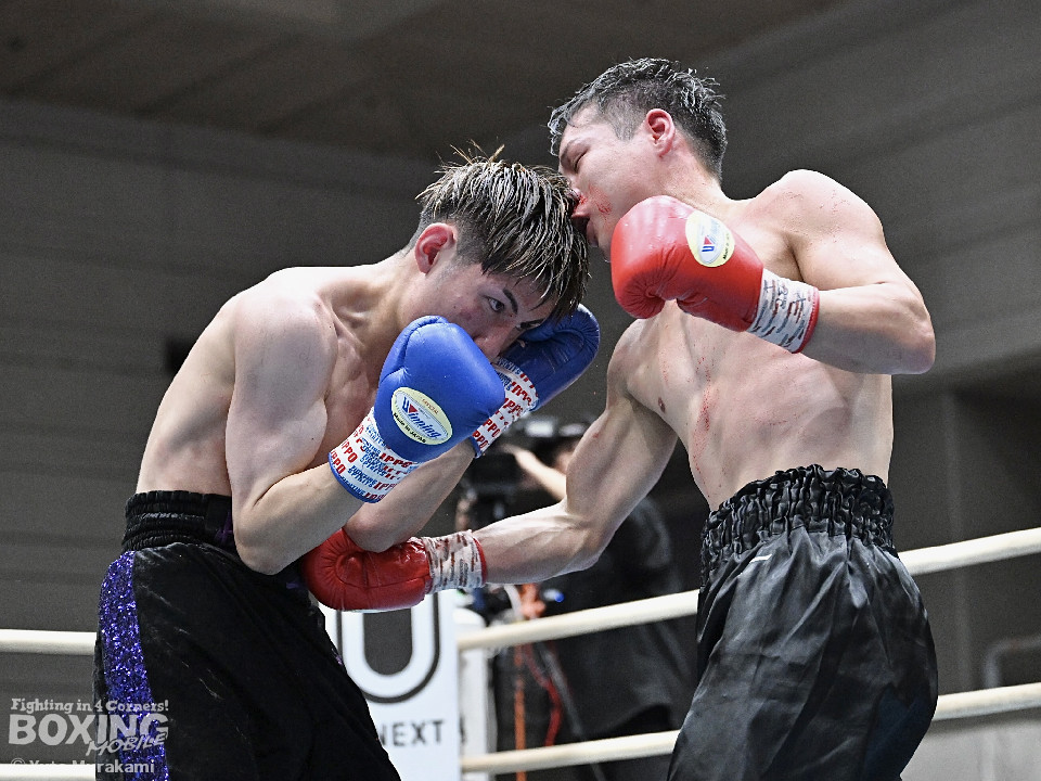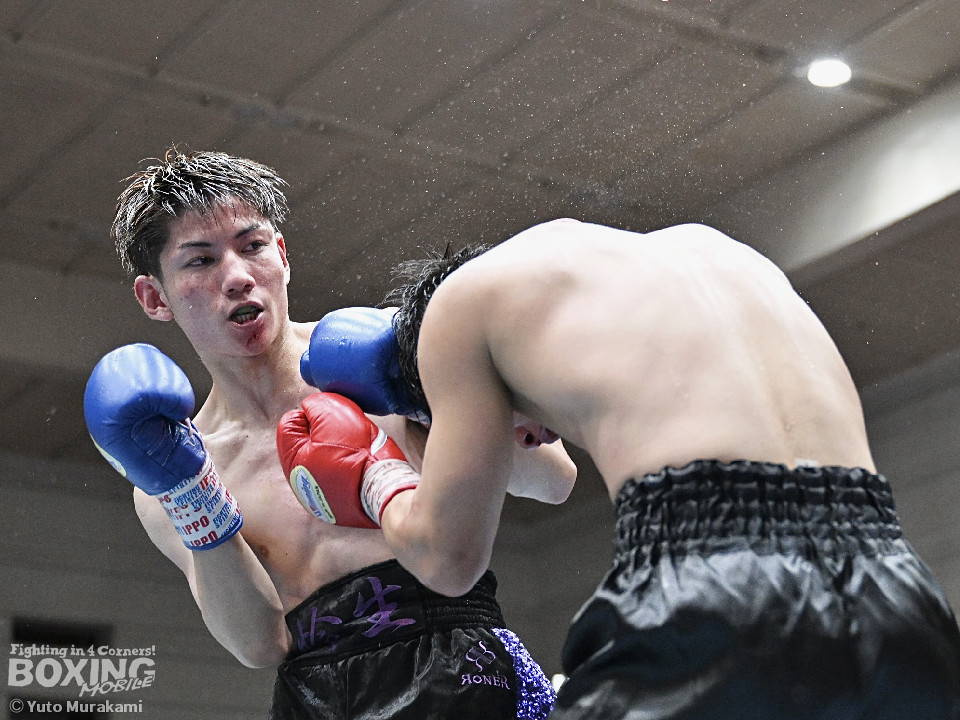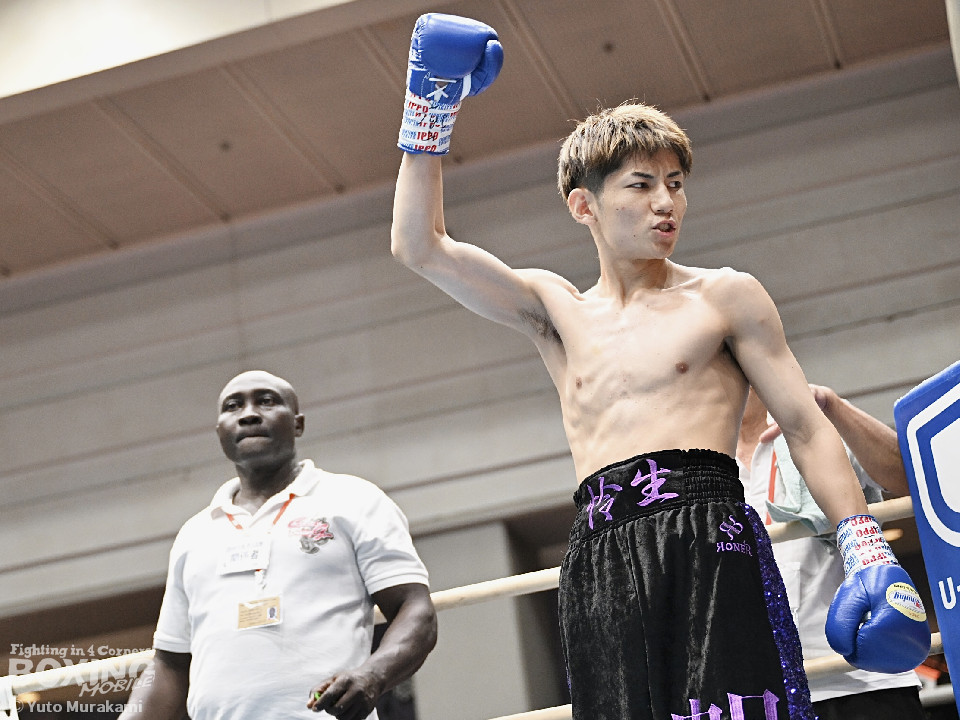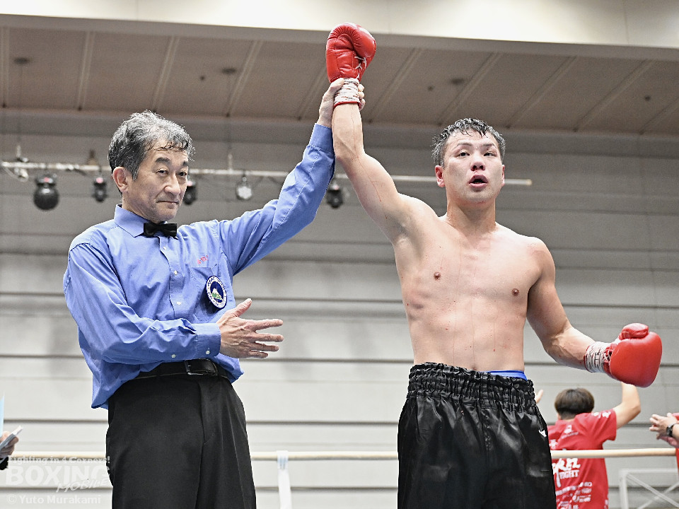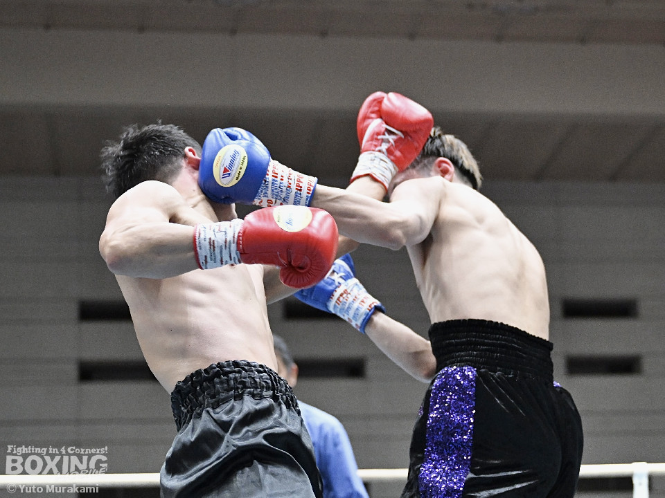 試合:守屋が距離を詰めて左ボディから馬力を活かした攻撃を展開。しかし、山本は左フックで顔を弾くとコンパクトなコンビネーションで倍返し。2回、我慢比べの肉弾戦が続く中、守屋が強烈な左ボディを突き刺した。3回、山本は右フックでグラつかせるとパンチをまとめるが、ここを踏ん張った守屋は必死に返した。4回、守屋は右フックをねじ込むと回転力を上げて攻勢をアピール。5回、打ち合いは激しさを増し、持てる力を出し切っての打ち合い。山本が右アッパー、左ボディを決めれば守屋も手数を繰り出した。ジャッジ2者の支持を得た守屋が激戦を制した。