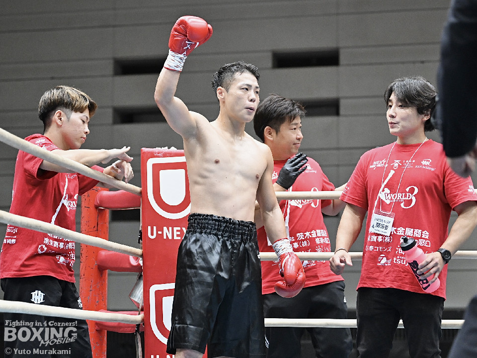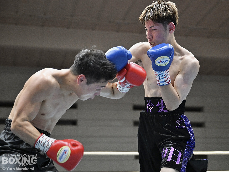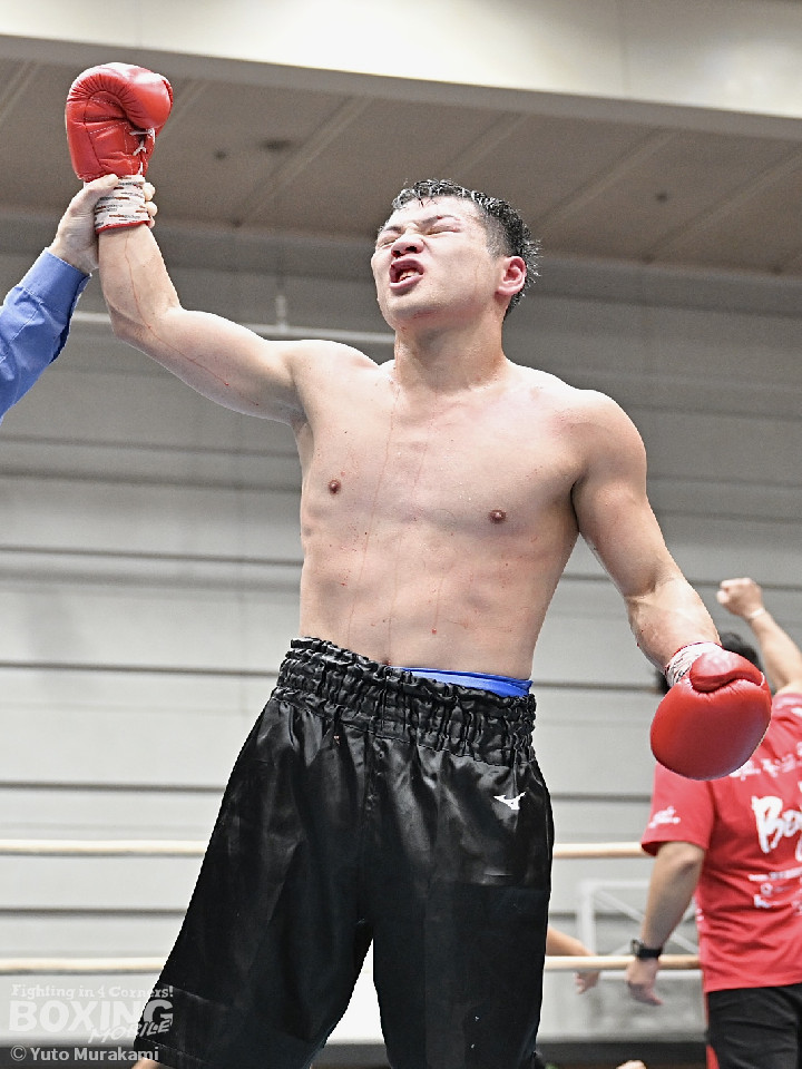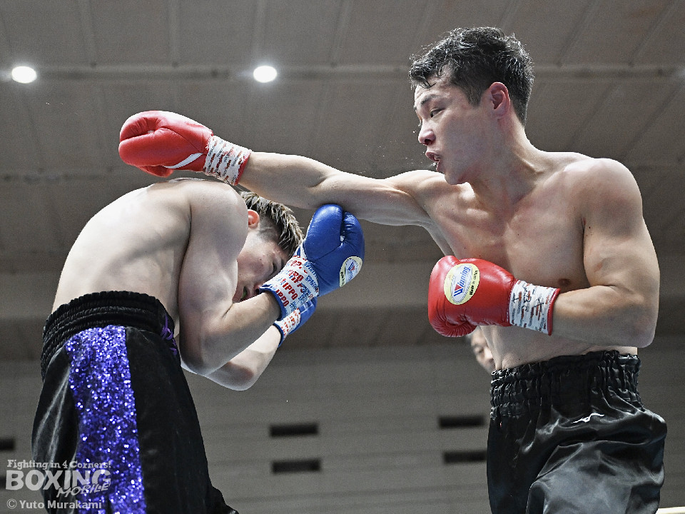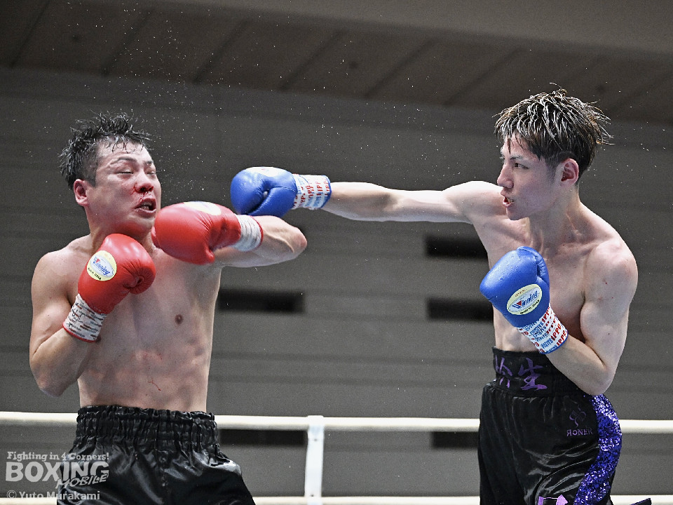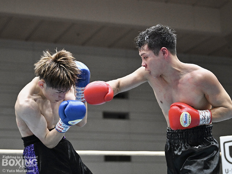 試合:守屋が距離を詰めて左ボディから馬力を活かした攻撃を展開。しかし、山本は左フックで顔を弾くとコンパクトなコンビネーションで倍返し。2回、我慢比べの肉弾戦が続く中、守屋が強烈な左ボディを突き刺した。3回、山本は右フックでグラつかせるとパンチをまとめるが、ここを踏ん張った守屋は必死に返した。4回、守屋は右フックをねじ込むと回転力を上げて攻勢をアピール。5回、打ち合いは激しさを増し、持てる力を出し切っての打ち合い。山本が右アッパー、左ボディを決めれば守屋も手数を繰り出した。ジャッジ2者の支持を得た守屋が激戦を制した。