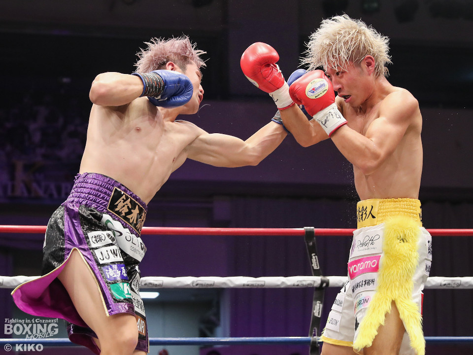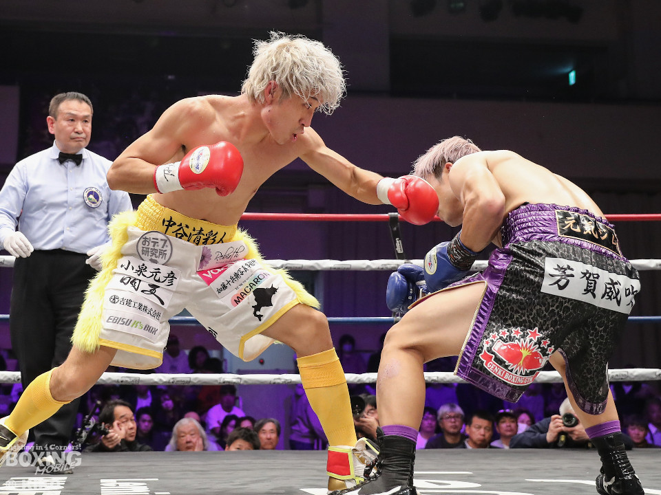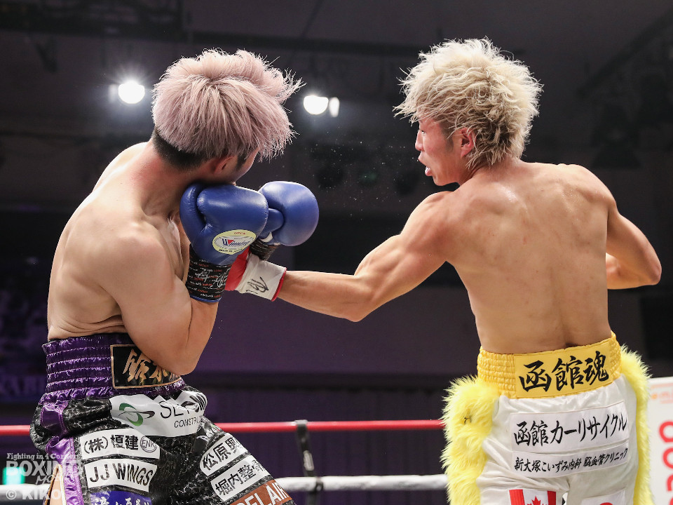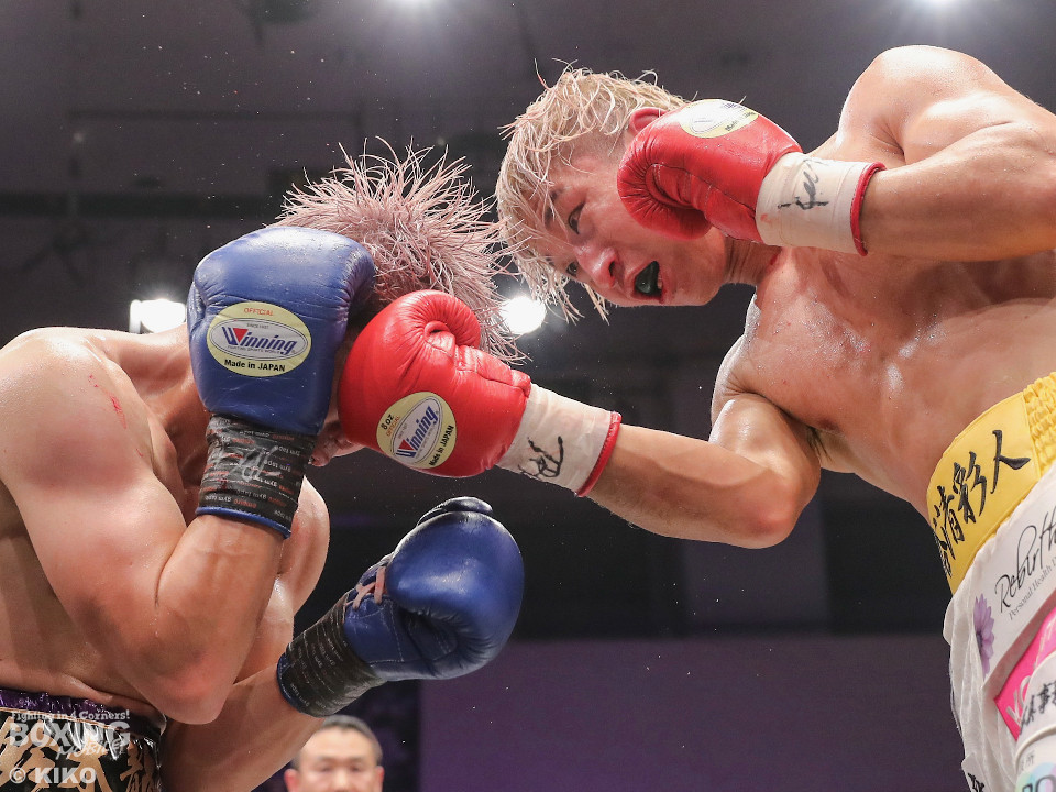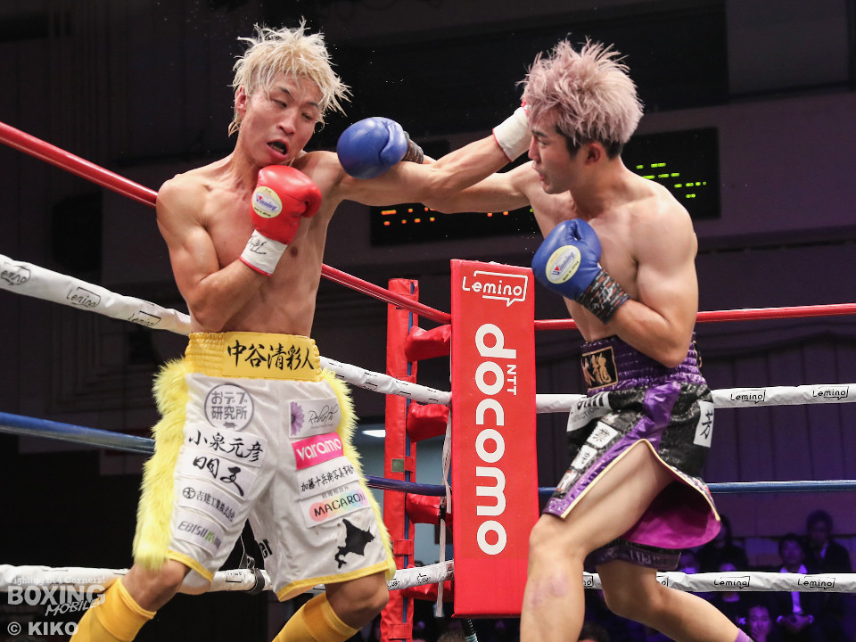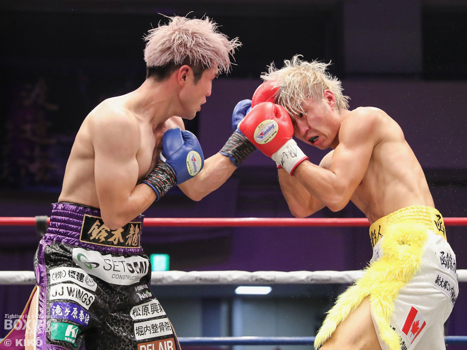 試合:約3年10ヶ月ぶりの再戦は、鈴木が右フックをねじ込むと上下に打ち分け先制。2回、鈴木はコンパクトな左フック、右アッパーを叩き込むと中谷も真っ向から応戦。3回、中谷は打ち下ろしの右ストレートから左ボディを突き刺し反撃。鈴木も負けじとゴリッと前に出て激しい打ち合いに発展。4回も我慢比べの肉弾戦が続きジャッジを悩ませた。5回、鈴木は回転力を活かした連打でグイグイと攻め立ててわずかに抜け出した印象。しかし、ヒッティングで左目上をカット。6回、鈴木はフィジカルの強さを活かし豊富な手数で攻め立てて、粘る中谷を振り切った。激戦を制した鈴木がリベンジに成功した。