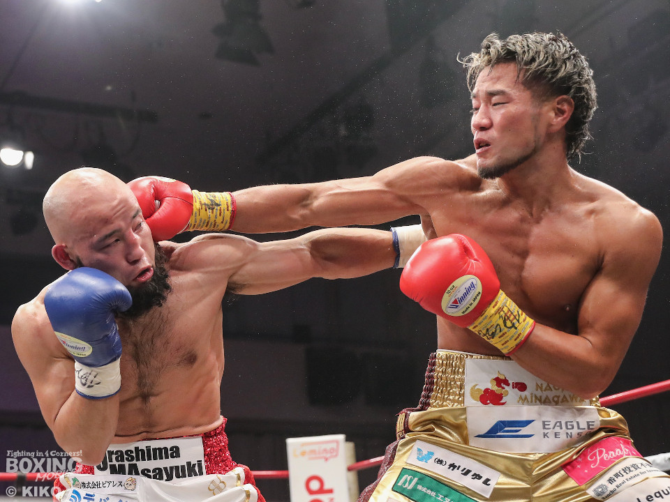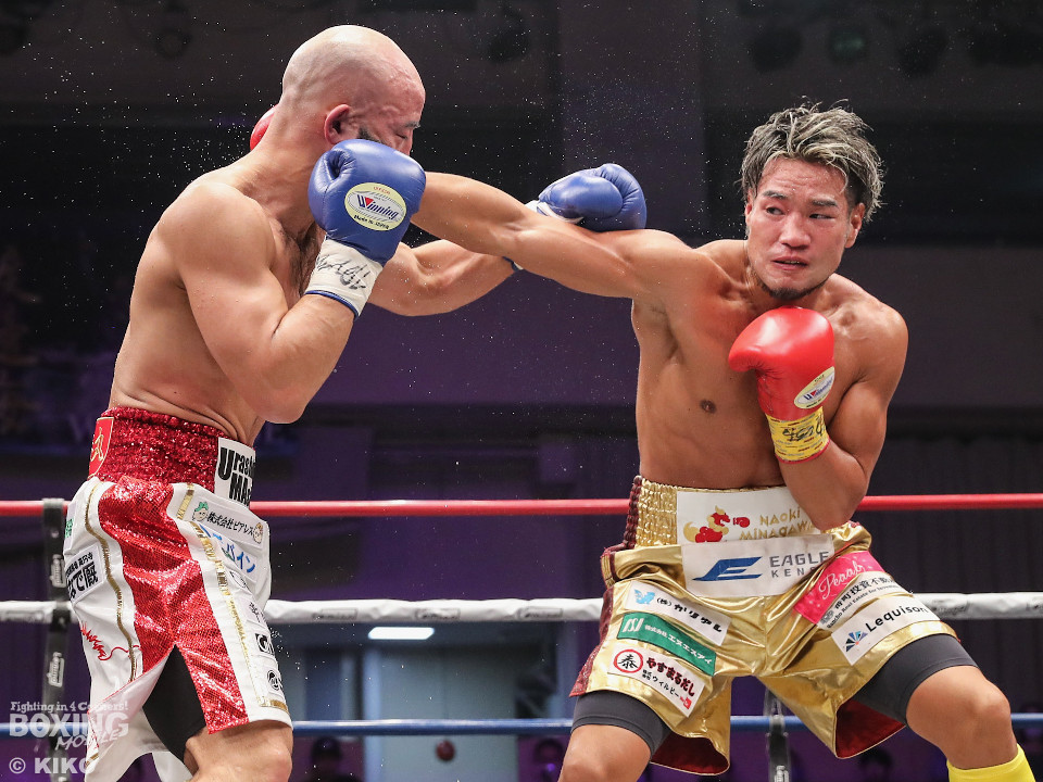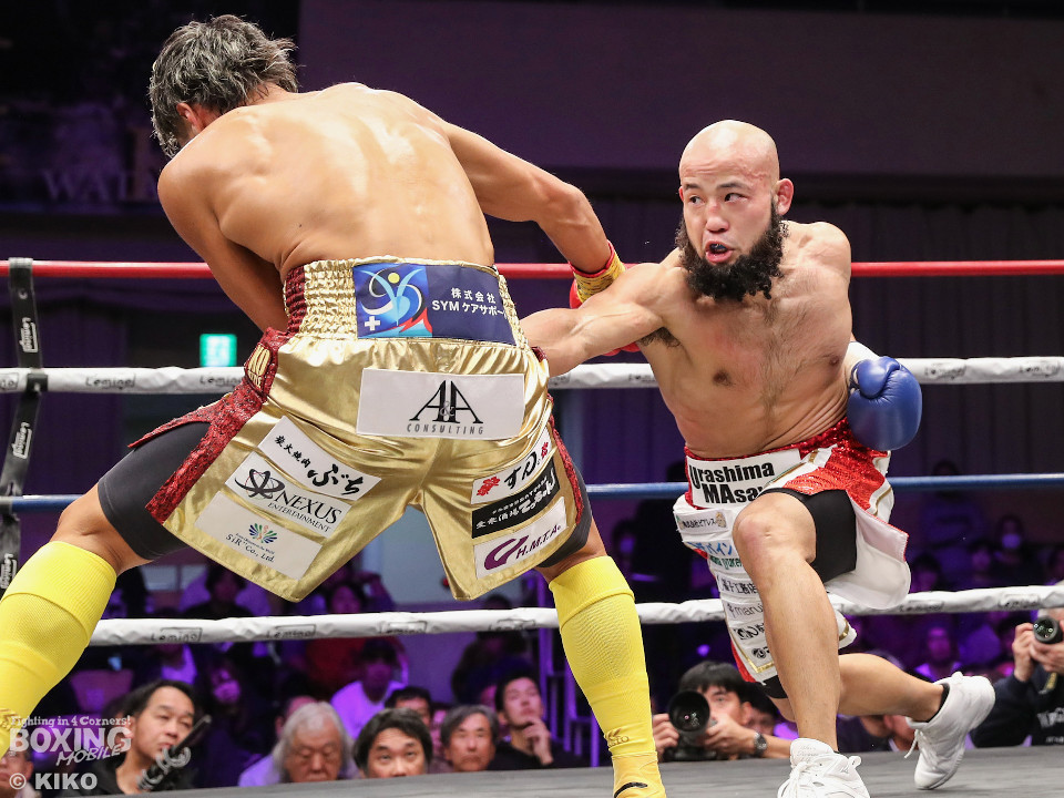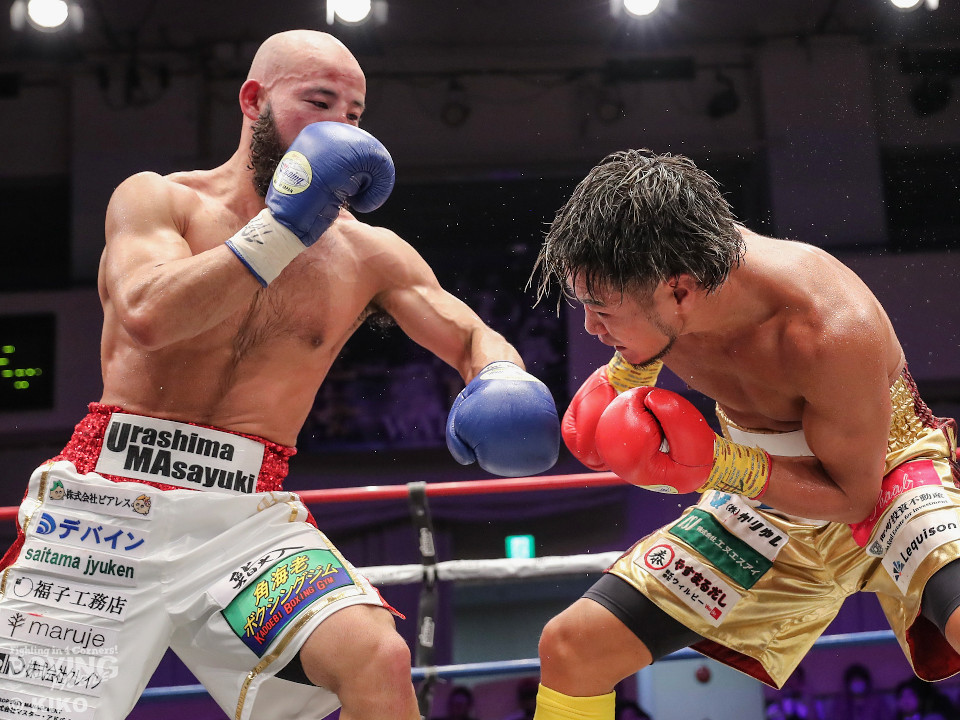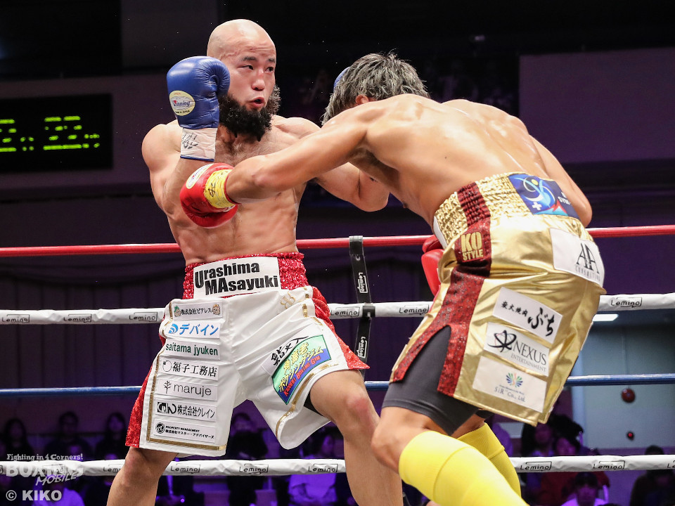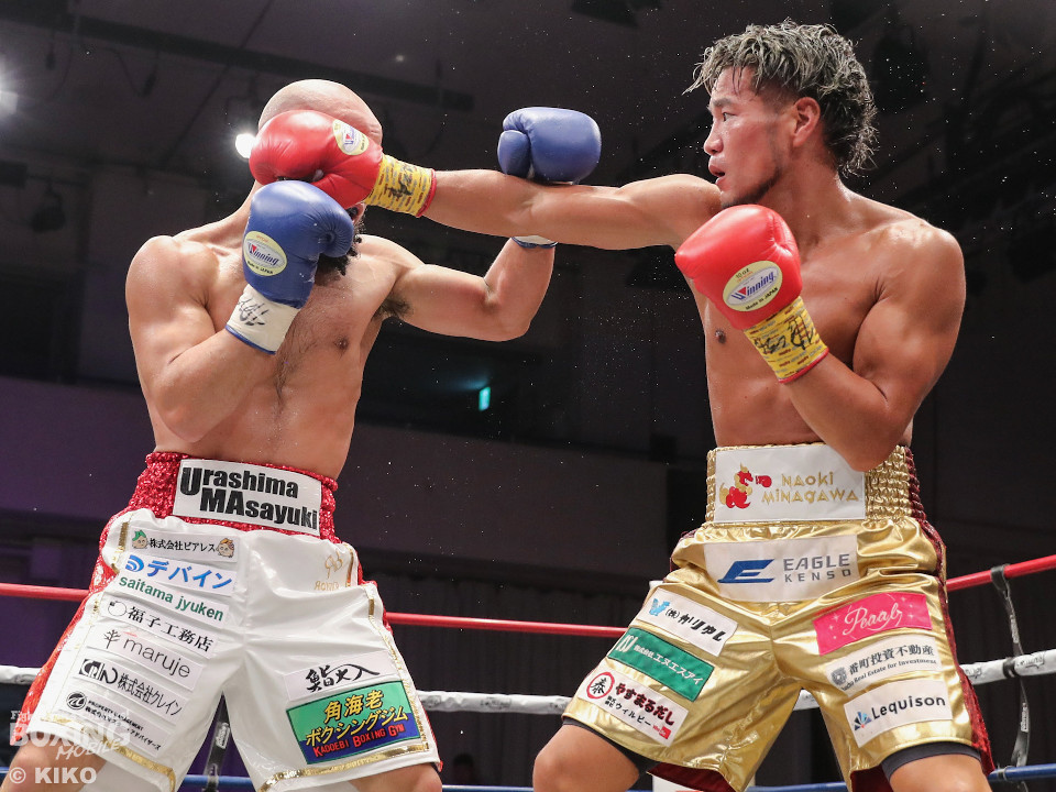 試合:日本ウェルター級最強挑戦者決定戦、浦嶋と皆川が拳を交えた。サウスポー皆川がサークリングしながら折を見て左オーバーハンドをヒット。2回、皆川は左アッパーで迎え撃つと左ストレートで顔を弾き攻勢。ボディで動きを止めたい浦嶋だが、距離が遠い。3回、浦嶋は強引に前に出て右ストレートをヒット。4回、浦嶋はジリジリと距離を詰めて左ボディを好打。5~6回、アグレッシブに攻める浦嶋に対し、皆川は足を使いながら決定打を回避。これがジャッジはどう捉えるか。7回、浦嶋はプレスをかけて右ストレートを打ち分けジャッジに攻勢をアピール。8回、今度は一転、皆川がプレスをかけて左フックから切り込むと浦嶋は距離を取りながら要所で左フックを合わせた。ジャッジ2者の支持を得た浦嶋が来年のチャンピオンカーニバル出場を決めた。