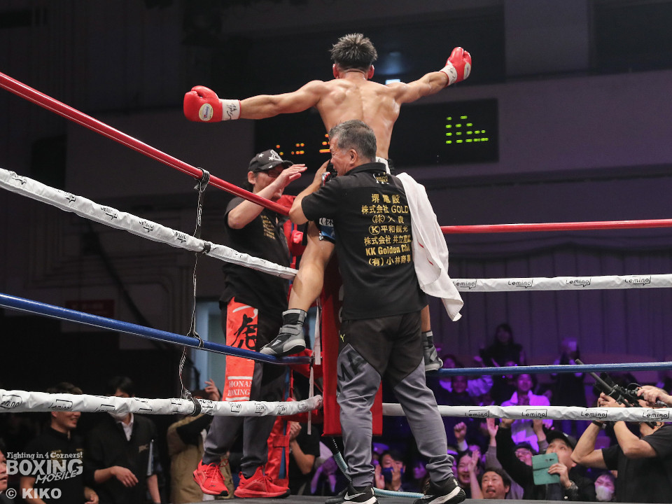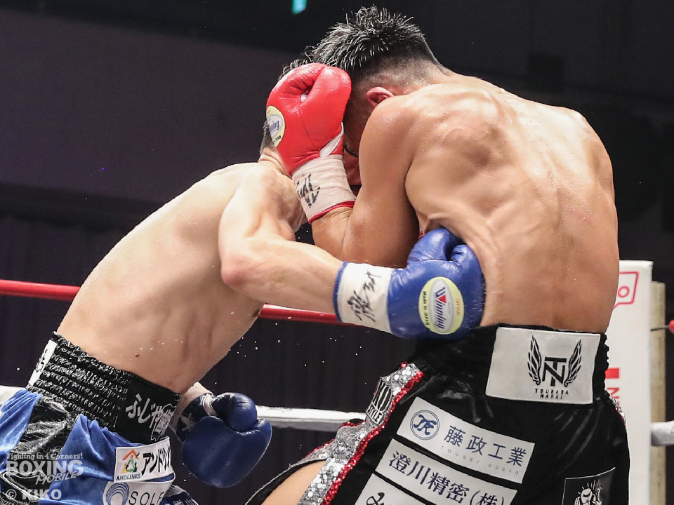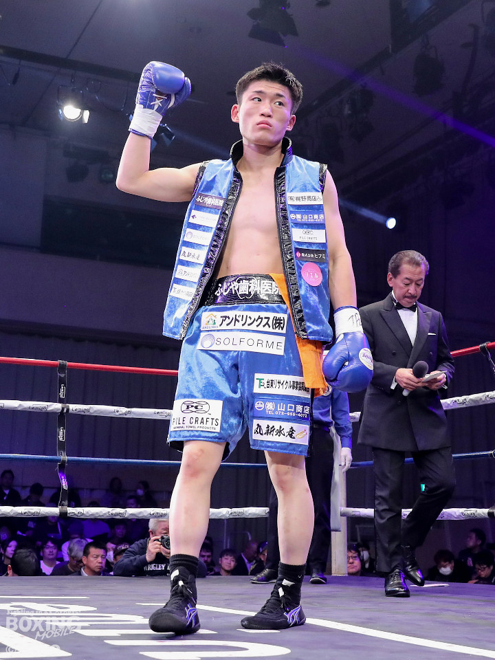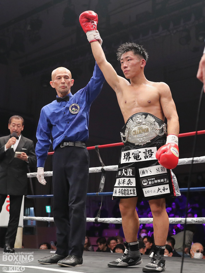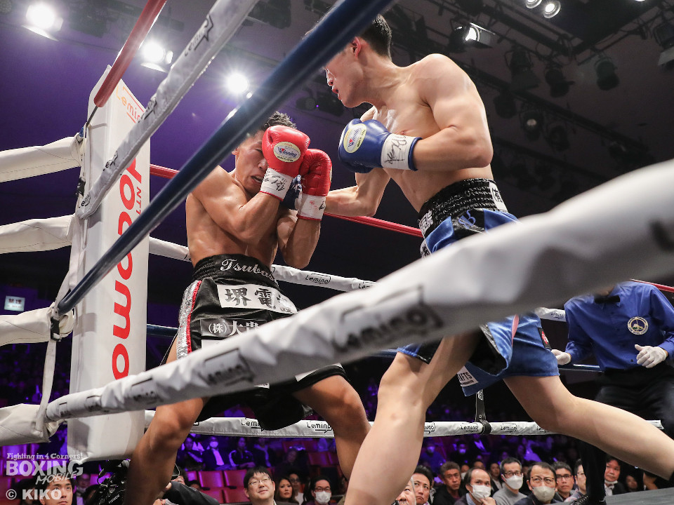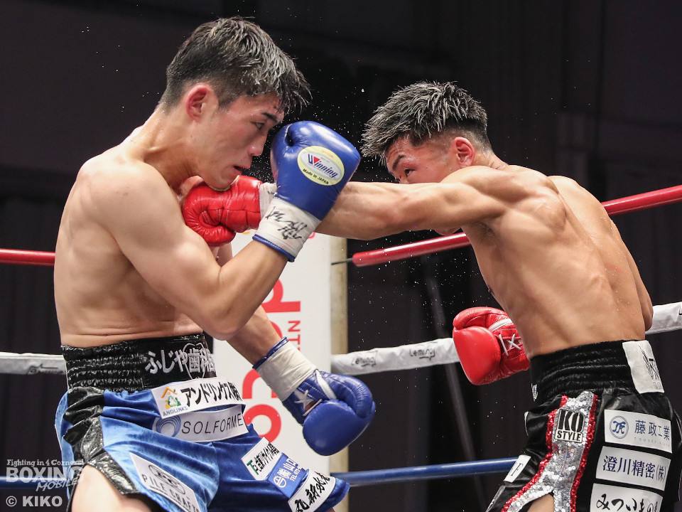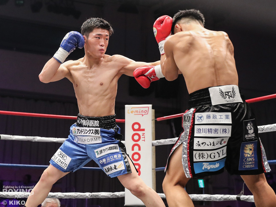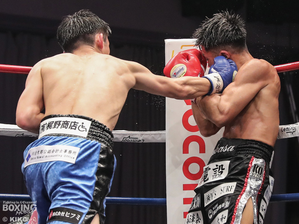 試合:日本スーパーフェザー級王者の奈良井が日本ユース王者の梶野を迎え撃った。奈良井が丁寧にジャブから組み立てるが、梶野は距離を潰して右フックを叩き込むと奈良井も真っ向から応戦。梶野はフィジカルの強さを活かし右フックで左目上を切り裂いた。2回、奈良井は左ボディ、左フックで迎え撃つが梶野はグイグイと前に出て打ち合いを選択。3回、奈良井は足を使いながらカウンターを狙う。このラウンドはお互いに決定打に恵まれず。4回、梶野は右フックをねじ込むとコーナーに詰めて連打で攻勢、しかし、ここで奈良井の左フックがジャストミート!痛烈なダウンを奪った。ファイティングポーズを取った梶野だが足元がふらついたのを見たレフェリーが10カウントを数え上げた。奈良井がKO勝ちで3度目の防衛に成功した。大事を取って担架で運ばれた梶野だが、挑戦者らしく勇敢に戦った姿に会場から拍手が送られた。