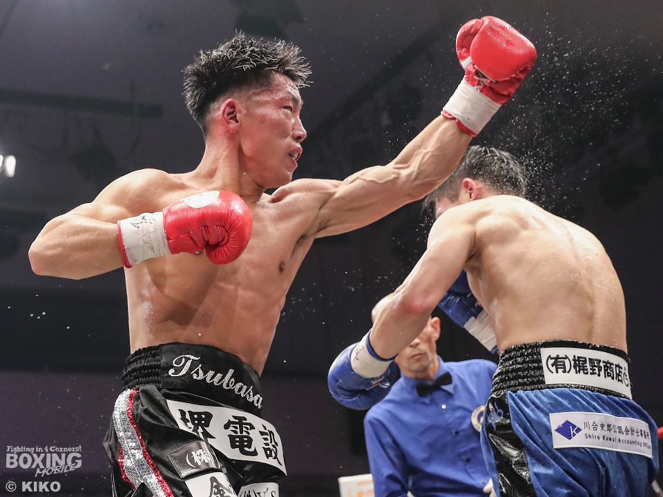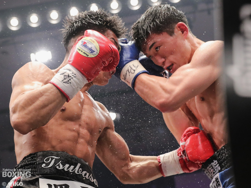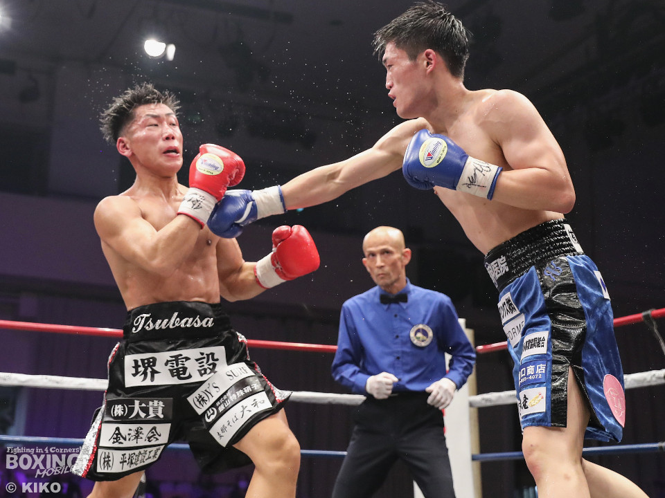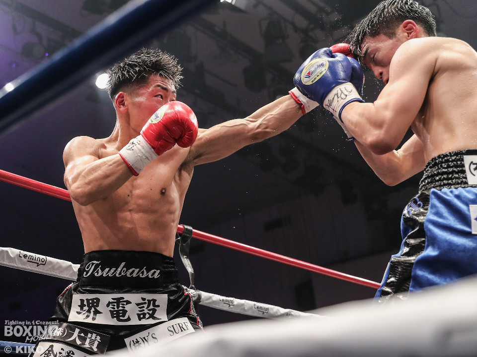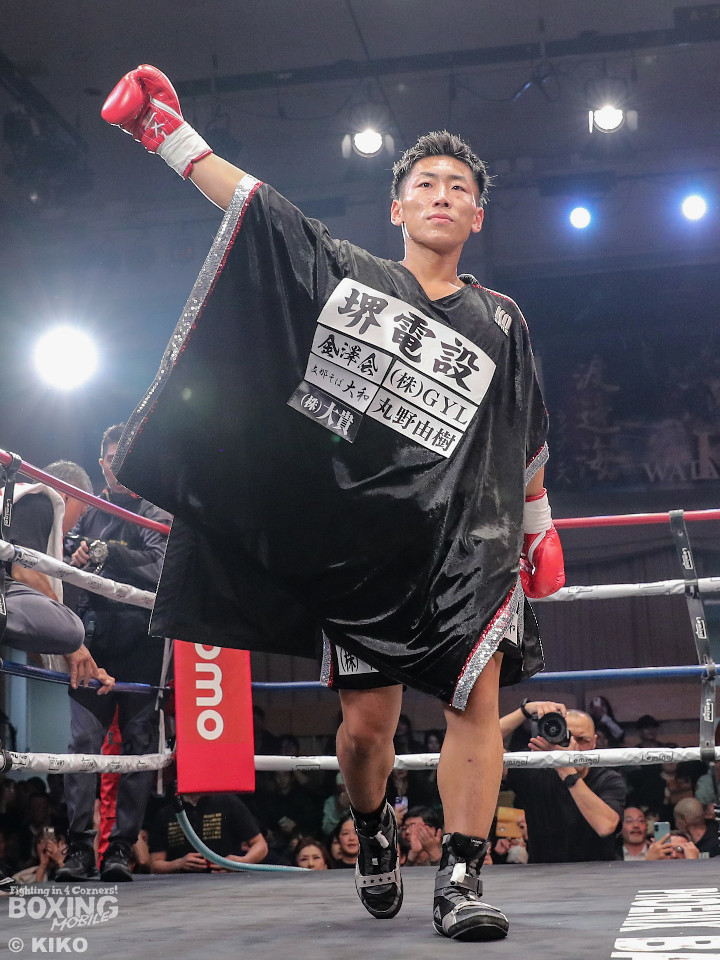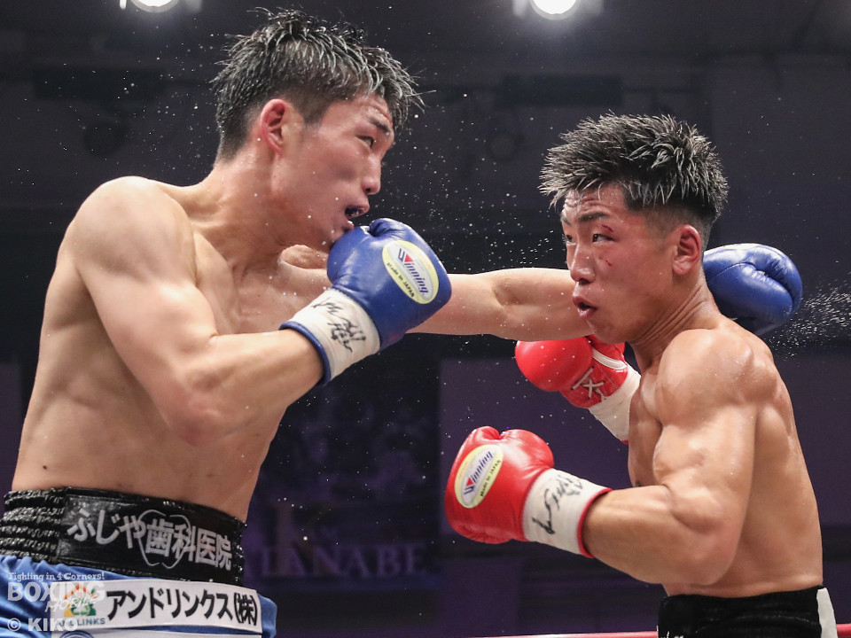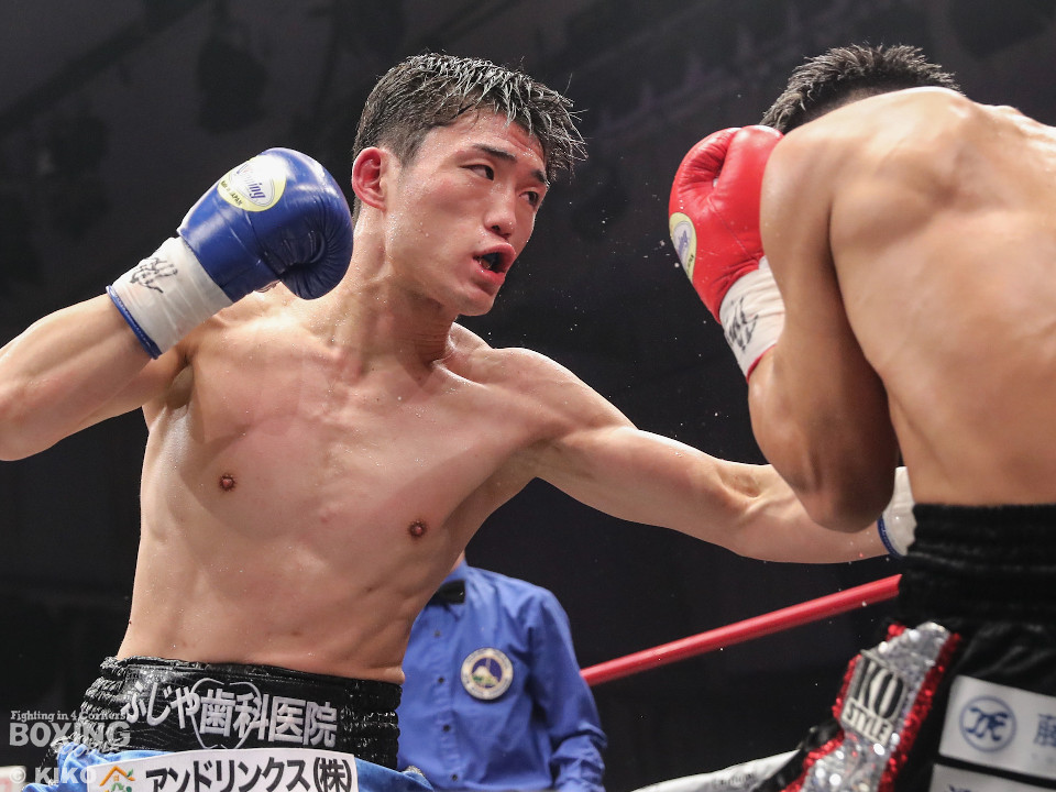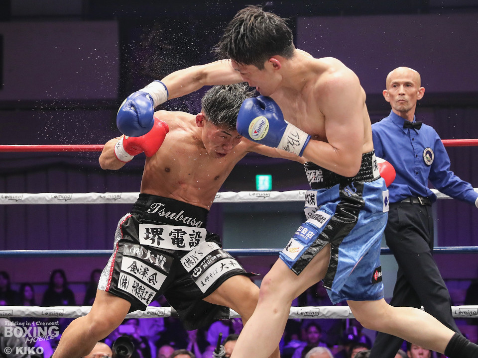 試合:日本スーパーフェザー級王者の奈良井が日本ユース王者の梶野を迎え撃った。奈良井が丁寧にジャブから組み立てるが、梶野は距離を潰して右フックを叩き込むと奈良井も真っ向から応戦。梶野はフィジカルの強さを活かし右フックで左目上を切り裂いた。2回、奈良井は左ボディ、左フックで迎え撃つが梶野はグイグイと前に出て打ち合いを選択。3回、奈良井は足を使いながらカウンターを狙う。このラウンドはお互いに決定打に恵まれず。4回、梶野は右フックをねじ込むとコーナーに詰めて連打で攻勢、しかし、ここで奈良井の左フックがジャストミート!痛烈なダウンを奪った。ファイティングポーズを取った梶野だが足元がふらついたのを見たレフェリーが10カウントを数え上げた。奈良井がKO勝ちで3度目の防衛に成功した。大事を取って担架で運ばれた梶野だが、挑戦者らしく勇敢に戦った姿に会場から拍手が送られた。