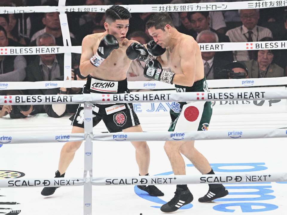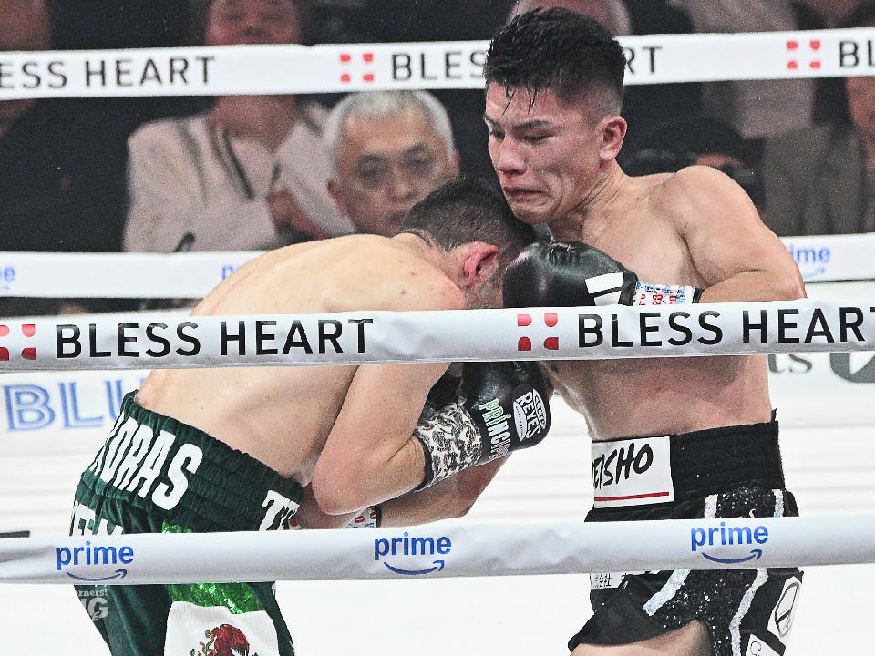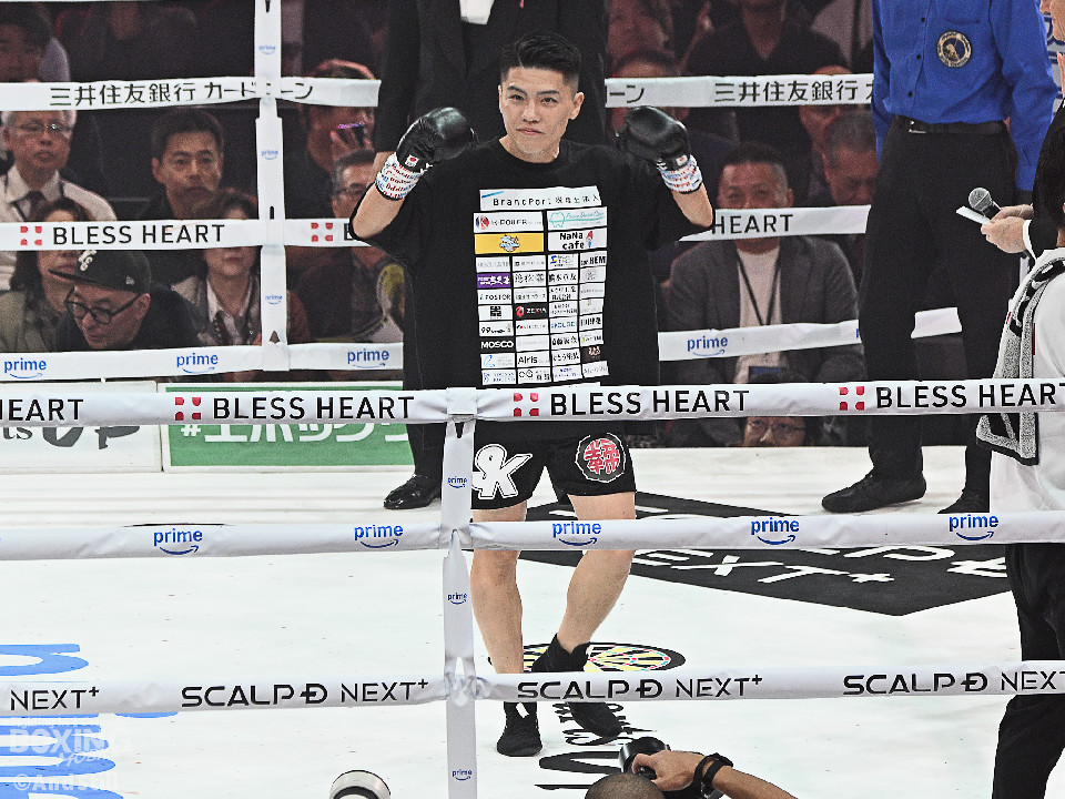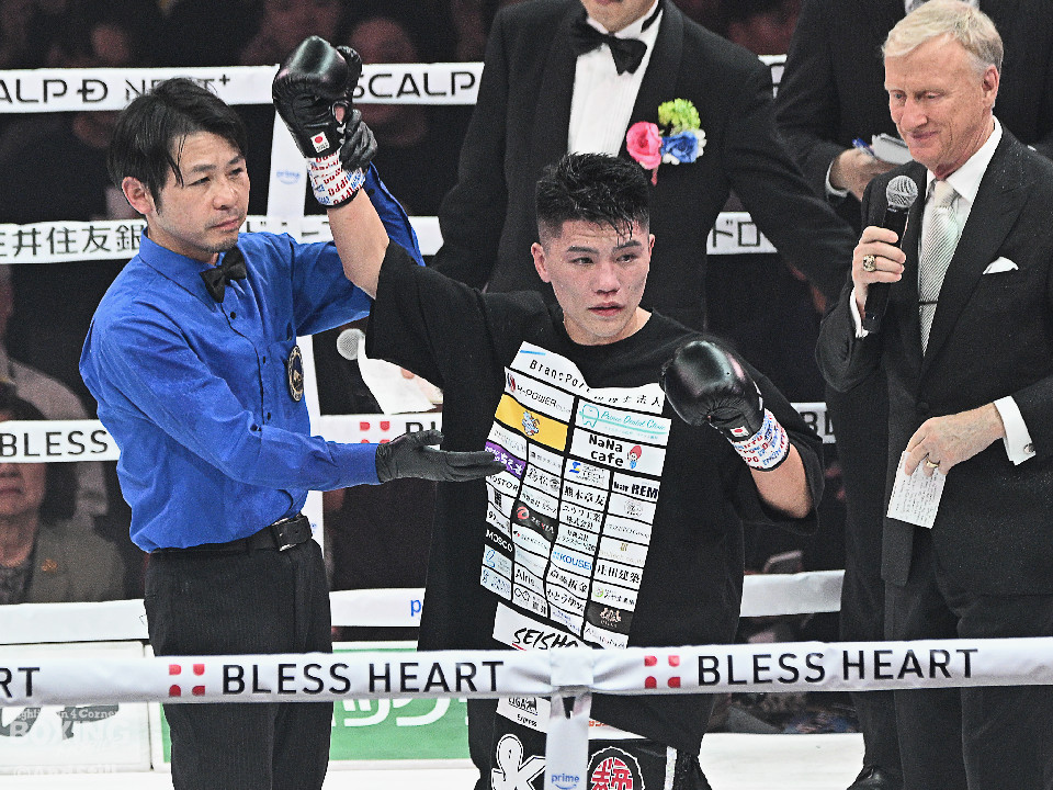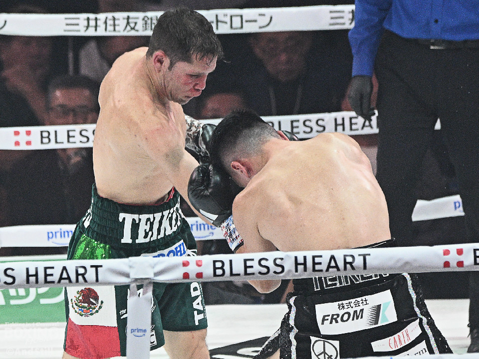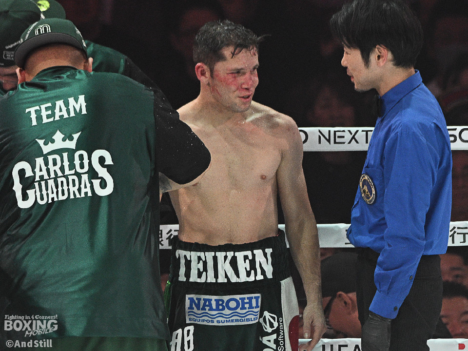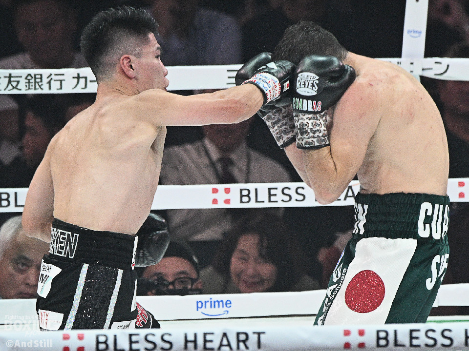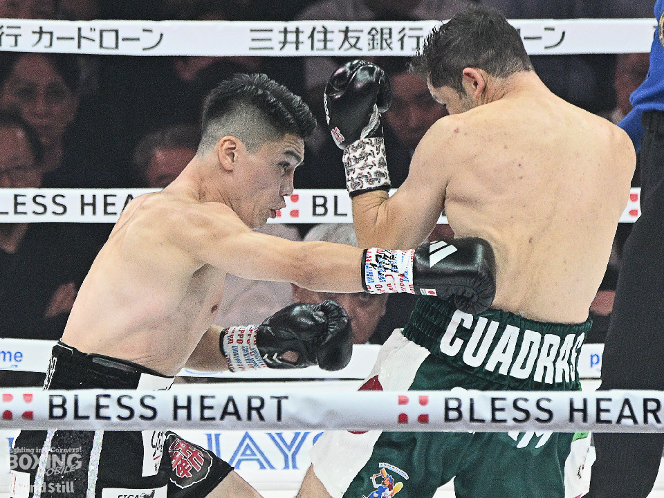 試合:前WBOアジアパシフィック・バンタム級王者の坪井が元WBC世界スーパーフライ級王者で世界1位のクアドラスと拳を交えた。初回、坪井はステップを刻みながらジャブを飛ばしてリズムを作る。2回、坪井は前後の動きを意識しながらワンツーをヒット。3回、クアドラスは左ボディで動きを止めに行くが、坪井はパパっと手数をまとめてペースを渡さず。4回も坪井のラウンド。カウンターの左フックでバランスを崩させるとテンポの良い攻撃でポイントを重ねた。5回、坪井は右ボディアッパーを差し込むと上下に打ち分け攻勢。6回、坪井は左ボディから高速連打でダウン寸前まで追い込んだ。8回、クアドラスは左ボディから左フックを繰り出すが、坪井はブロックとボディワークで回避。連打で攻め立てると右ストレートで顔を弾いたところでレフェリーが割って入った。坪井が世界1位に対し、力の差を見せつけた。