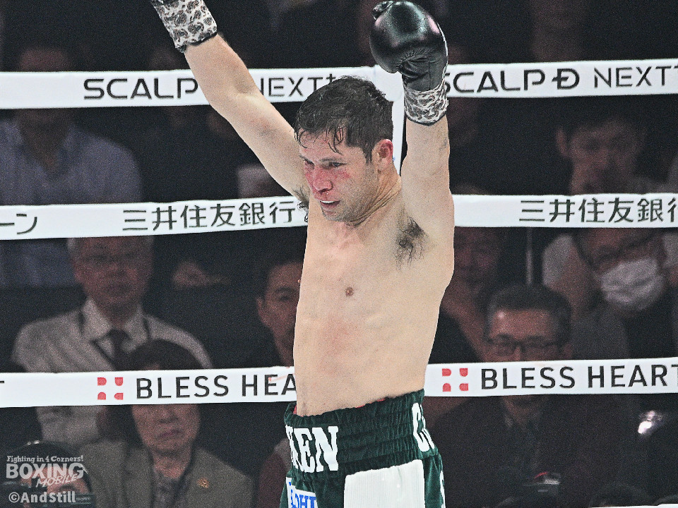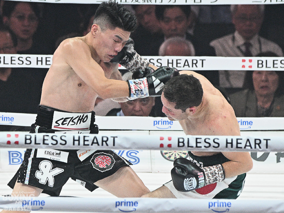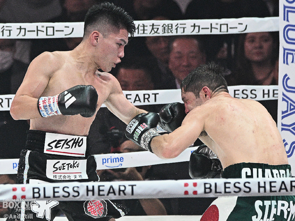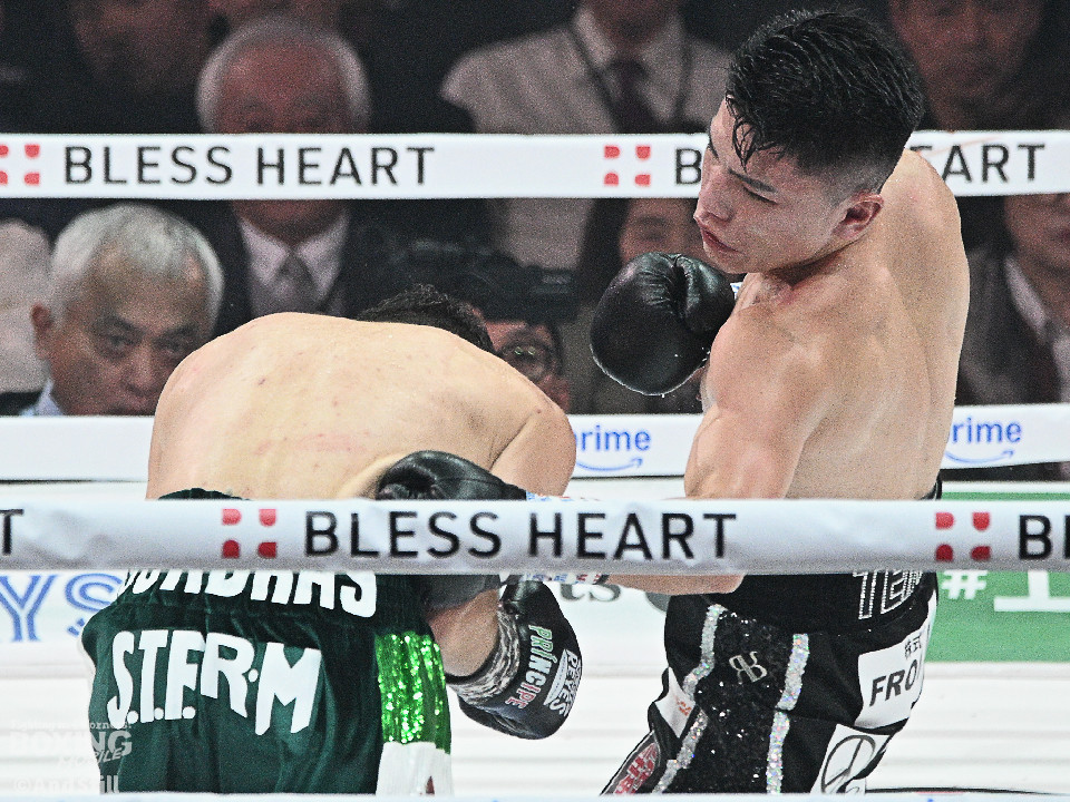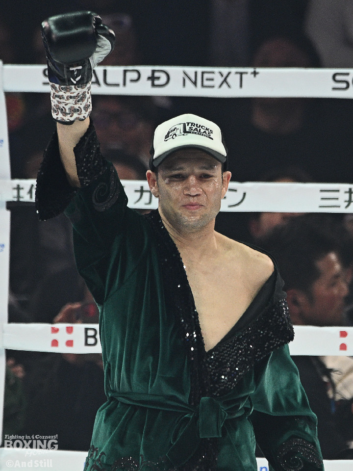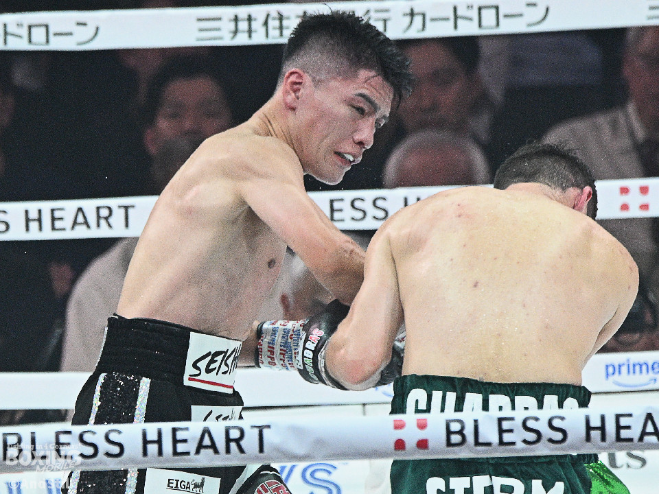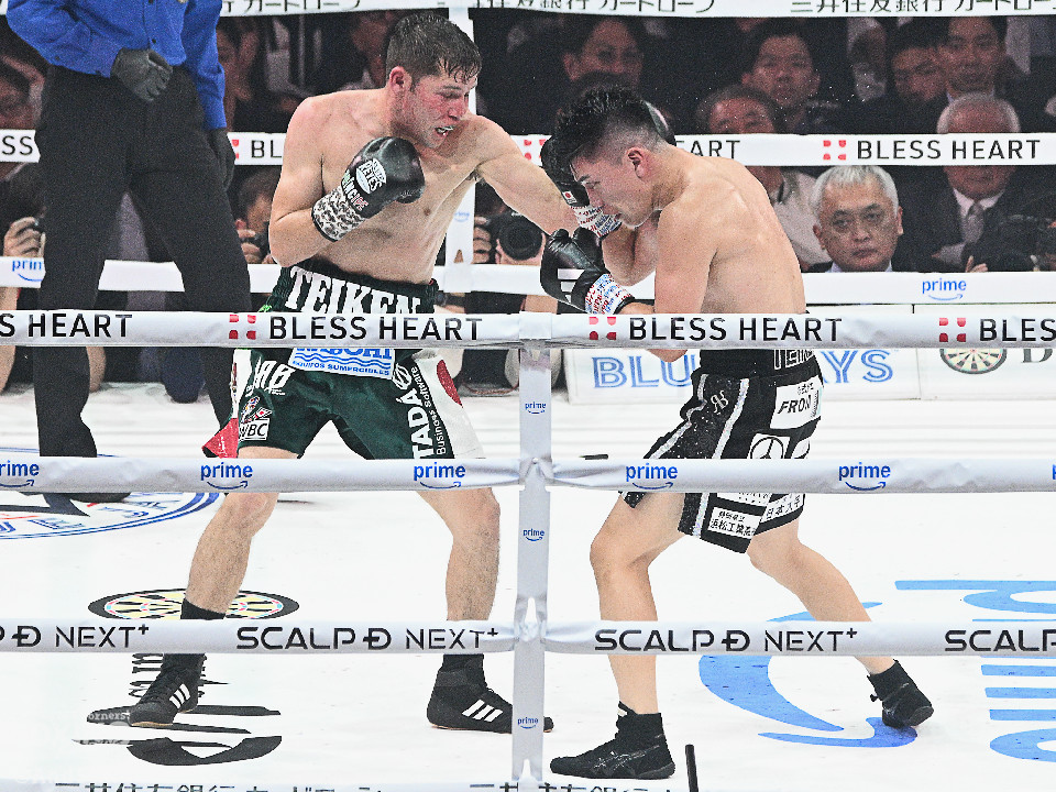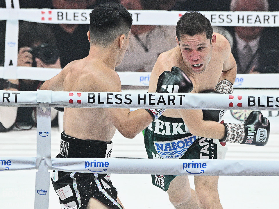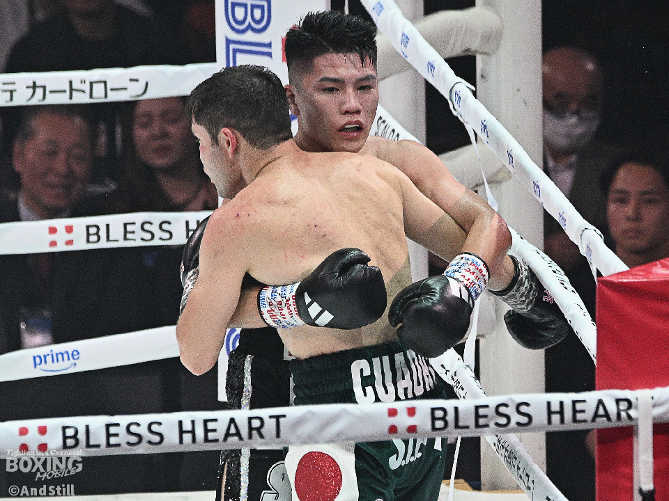 試合:前WBOアジアパシフィック・バンタム級王者の坪井が元WBC世界スーパーフライ級王者で世界1位のクアドラスと拳を交えた。初回、坪井はステップを刻みながらジャブを飛ばしてリズムを作る。2回、坪井は前後の動きを意識しながらワンツーをヒット。3回、クアドラスは左ボディで動きを止めに行くが、坪井はパパっと手数をまとめてペースを渡さず。4回も坪井のラウンド。カウンターの左フックでバランスを崩させるとテンポの良い攻撃でポイントを重ねた。5回、坪井は右ボディアッパーを差し込むと上下に打ち分け攻勢。6回、坪井は左ボディから高速連打でダウン寸前まで追い込んだ。8回、クアドラスは左ボディから左フックを繰り出すが、坪井はブロックとボディワークで回避。連打で攻め立てると右ストレートで顔を弾いたところでレフェリーが割って入った。坪井が世界1位に対し、力の差を見せつけた。