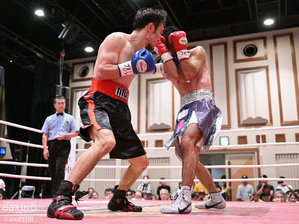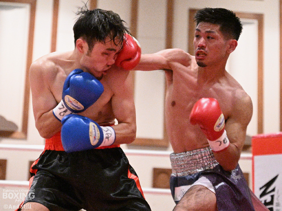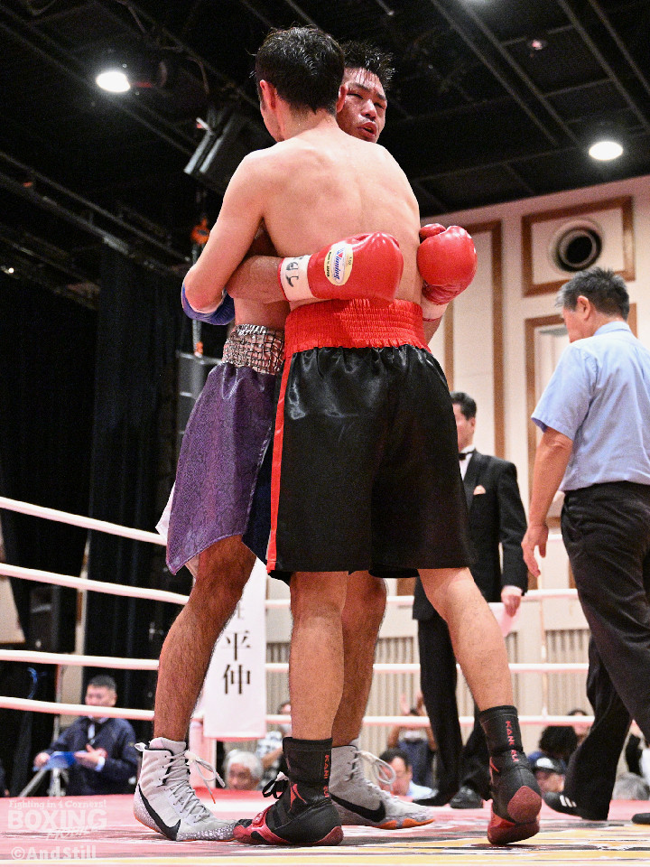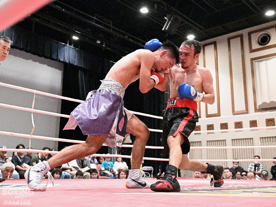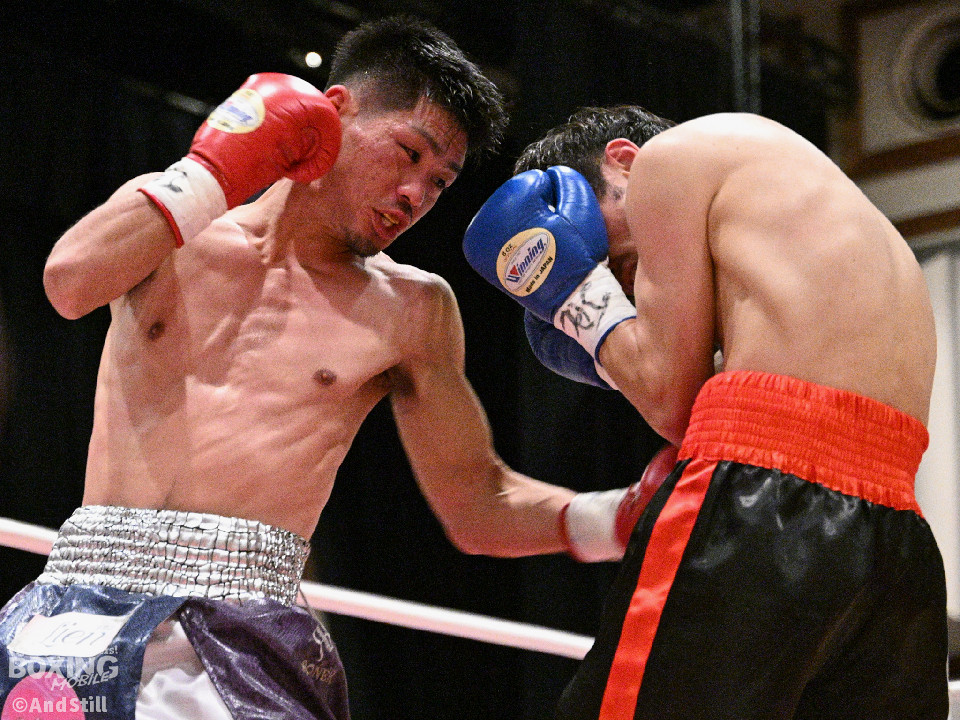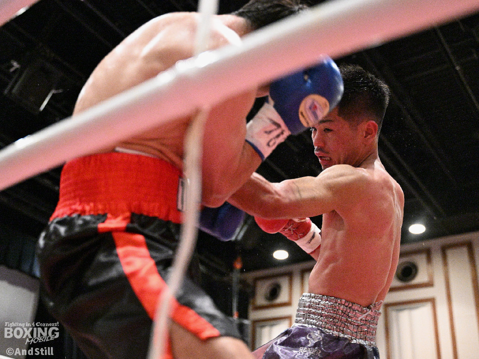 試合:金城は突き刺すような強いジャブで距離をコントロールすると、ショートアッパー、左の上下のコンビネーションで攻勢。チャーターフーはボディにジャブを突き刺すと、フックを振り応戦。2回、金城は丁寧にジャブを軸にガードで被弾を回避すると上下のコンビネーションで効果的に攻勢を印象付ける。3回、チャーターフーは力強いワンツーを繰り出すが、金城は冷静にアッパーからボディと上下への有効打でポイントをピックアップ。4回、金城は右オーバーハンドをヒット。焦らず上下へのパンチで削り、優勢に進めた。5回、金城は冴え渡るジャブから右カウンターを合わせてぐらつかせると攻勢。6回、金城はアッパーから右オーバーハンドを好打。8回、クロスレンジで互いにパンチを交錯させるが、要所で金城のジャブが有効に作用した。金城が2〜8ポイント差で難敵を撃破した。