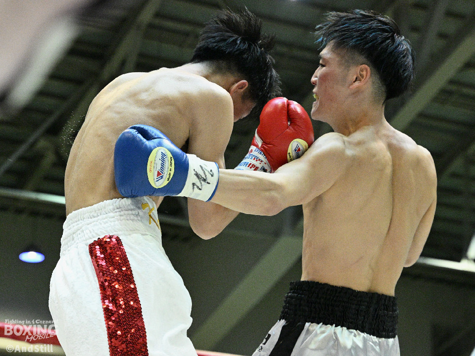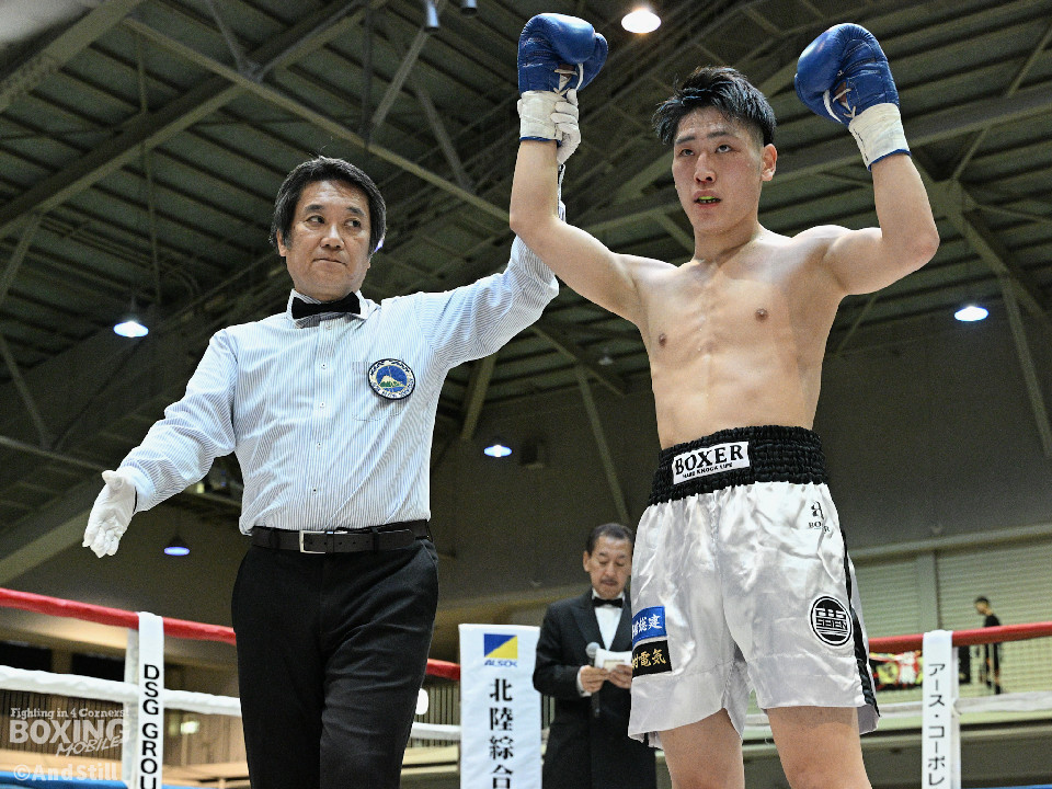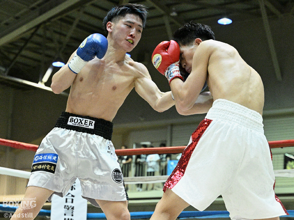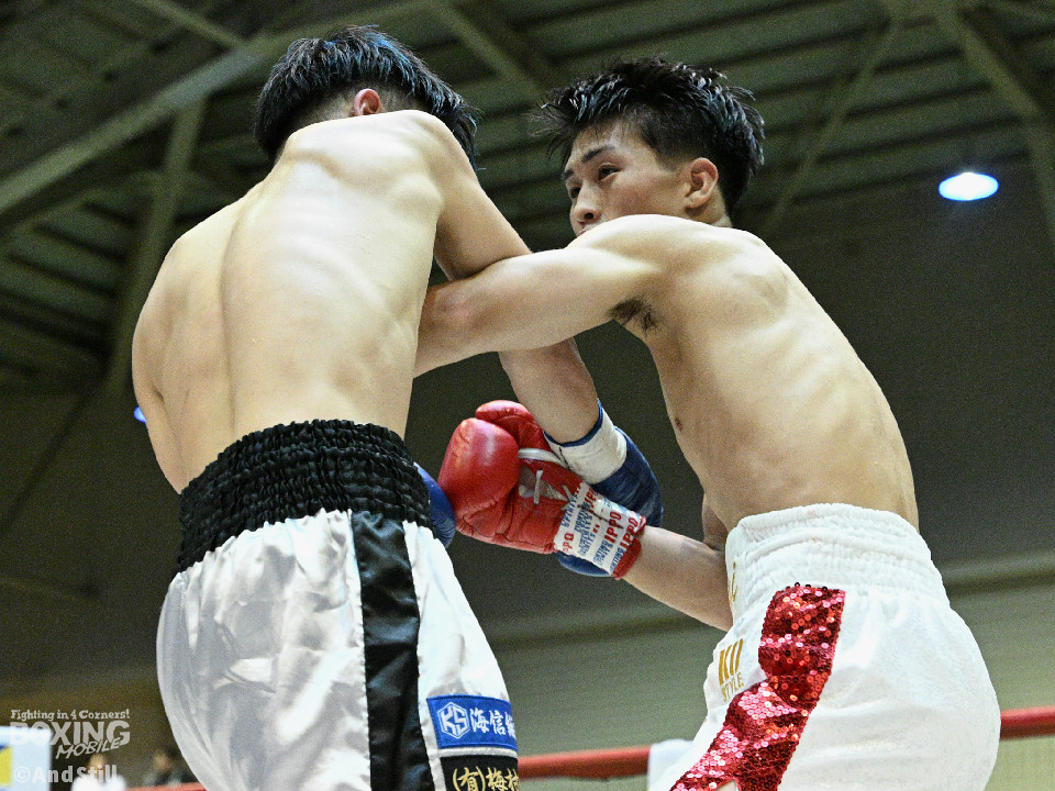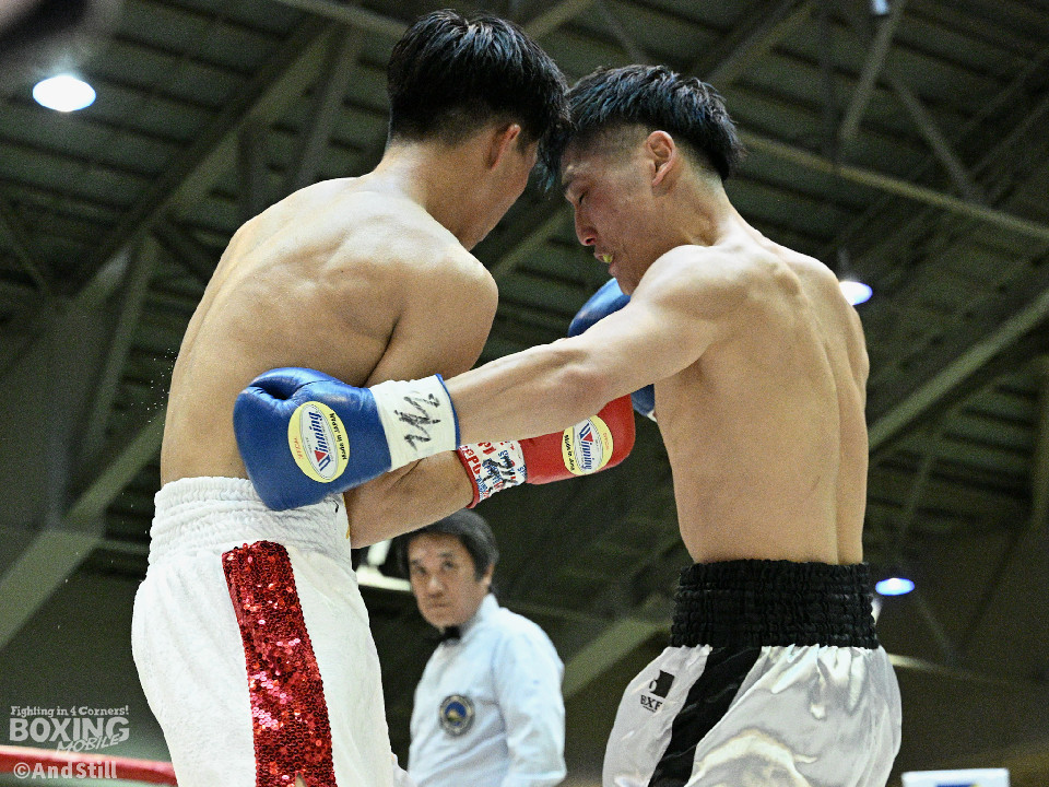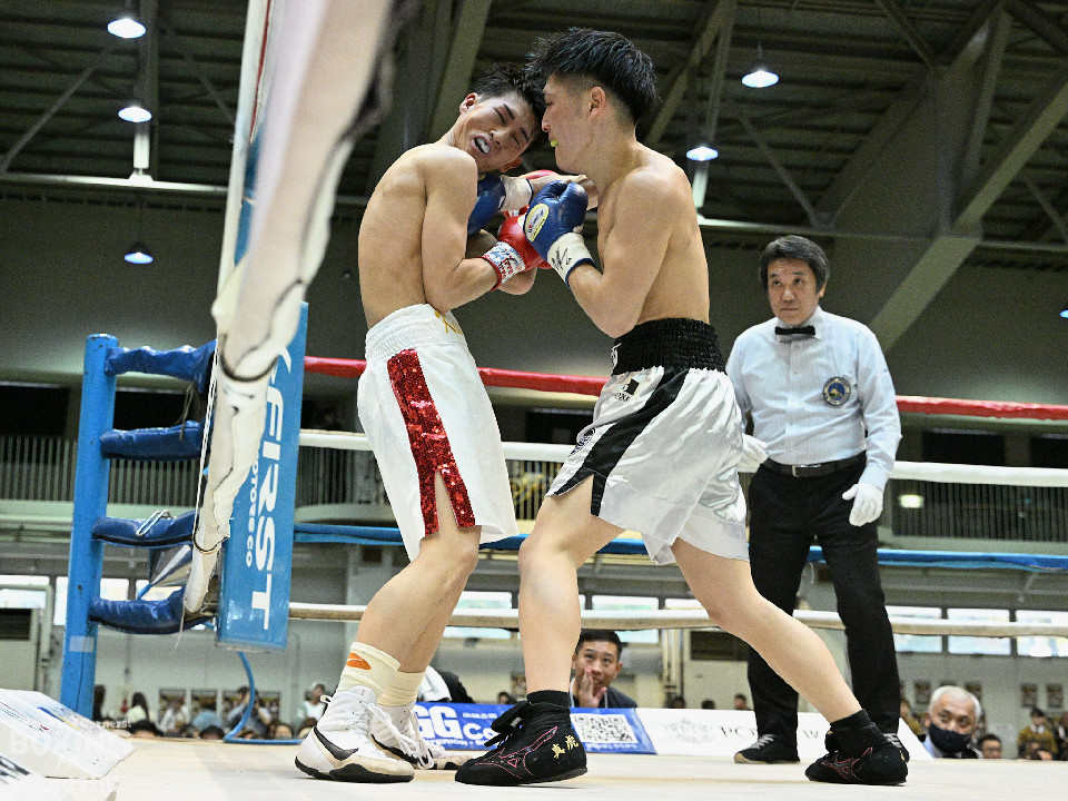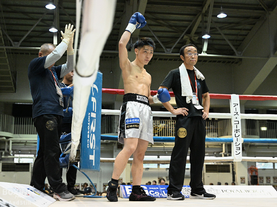 試合:開始から接近戦でショートパンチの応酬の中、吉田がコンパクトな左ボディから左フックを好打。距離を潰してアグレッシブな姿勢。2回、硲はワンツーを繰り出すが、吉田は押し負けず。右フックでグラつかせると好機を逃さず左右をまとめてレフェリーストップに持ち込んだ。浜松から乗り込んだ吉田が勝利をつかんだ。