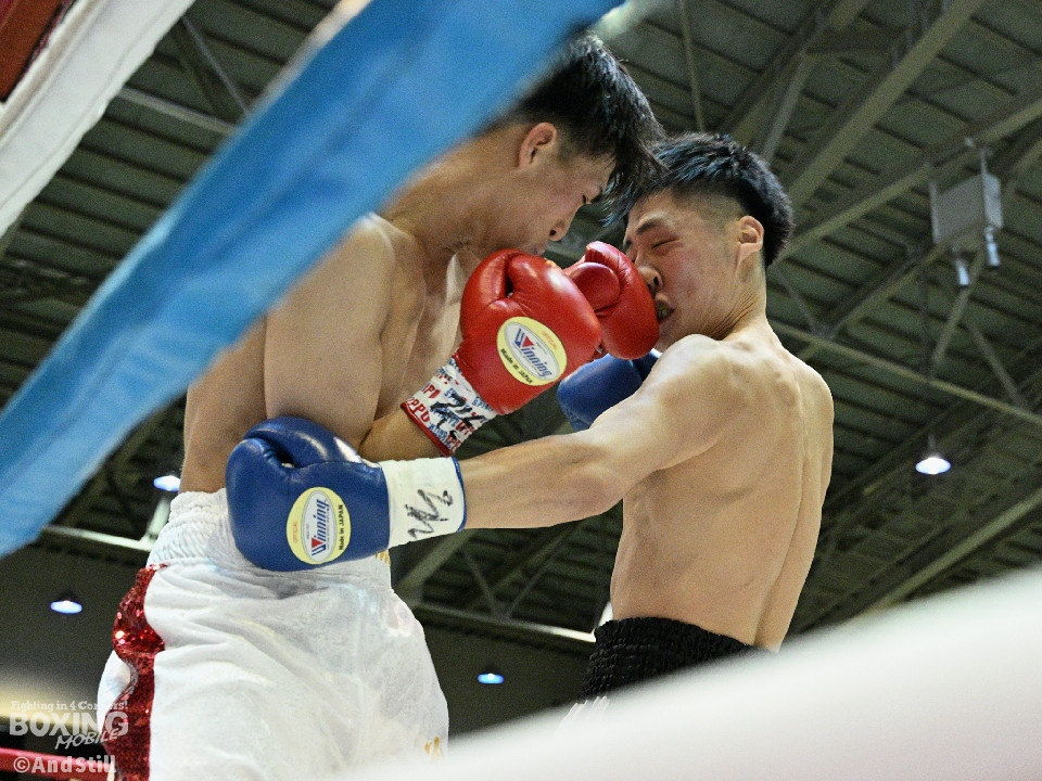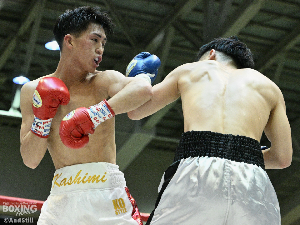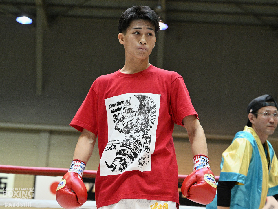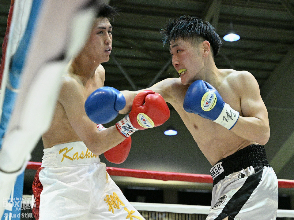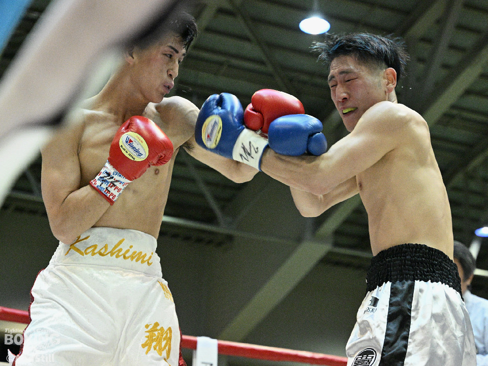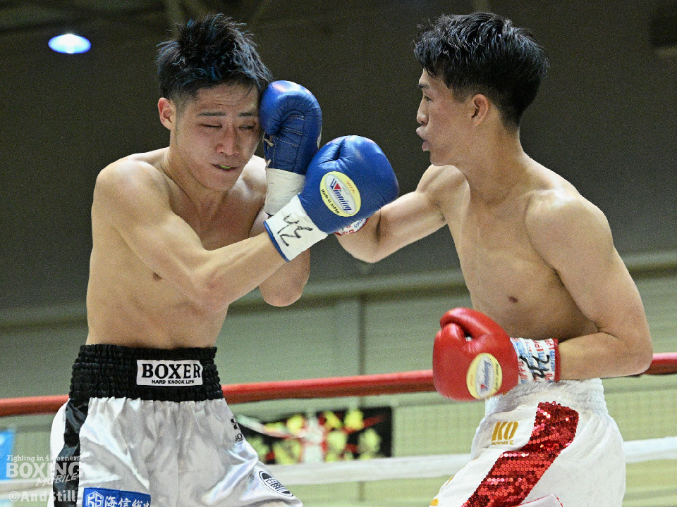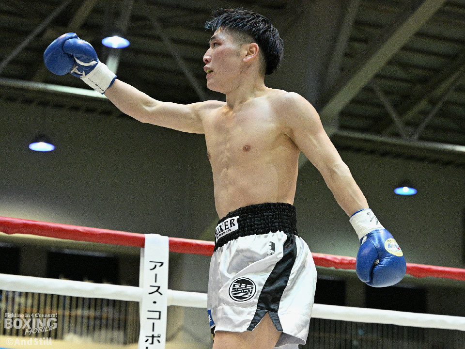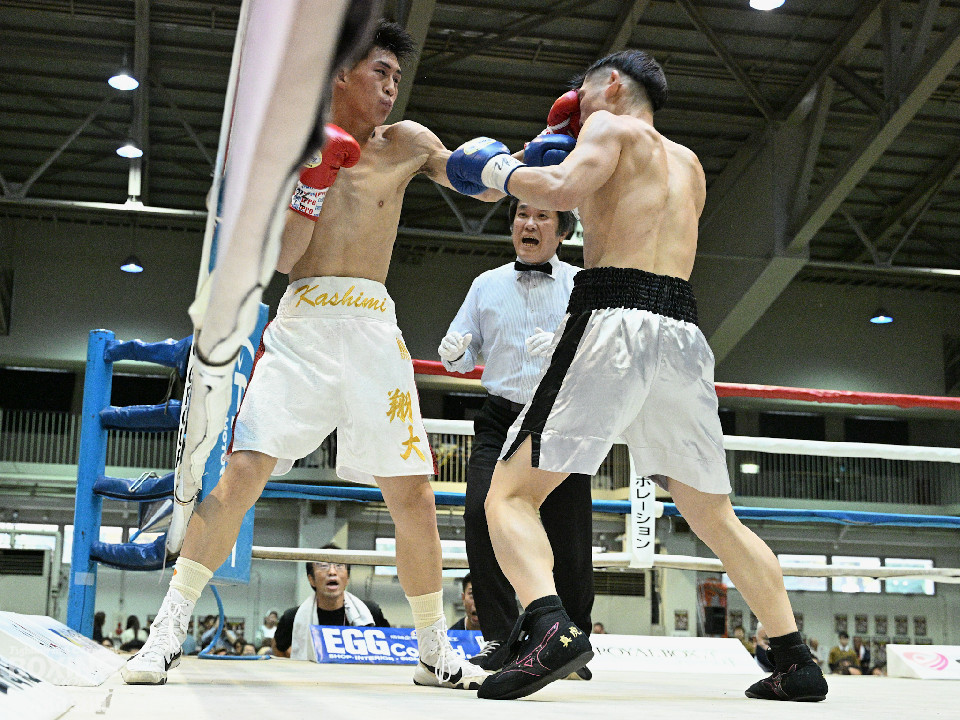 試合:開始から接近戦でショートパンチの応酬の中、吉田がコンパクトな左ボディから左フックを好打。距離を潰してアグレッシブな姿勢。2回、硲はワンツーを繰り出すが、吉田は押し負けず。右フックでグラつかせると好機を逃さず左右をまとめてレフェリーストップに持ち込んだ。浜松から乗り込んだ吉田が勝利をつかんだ。