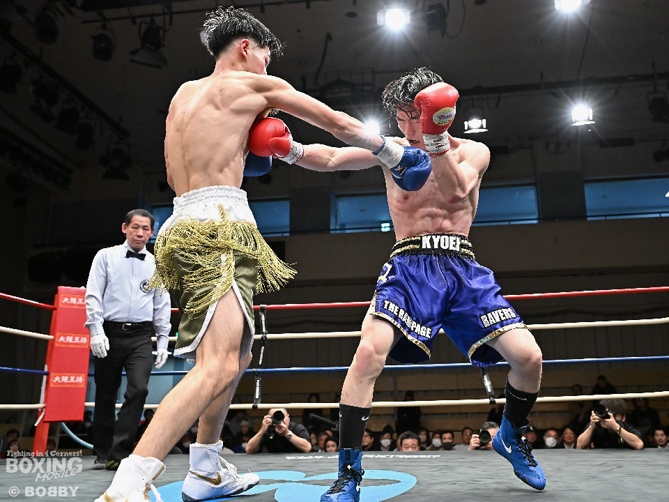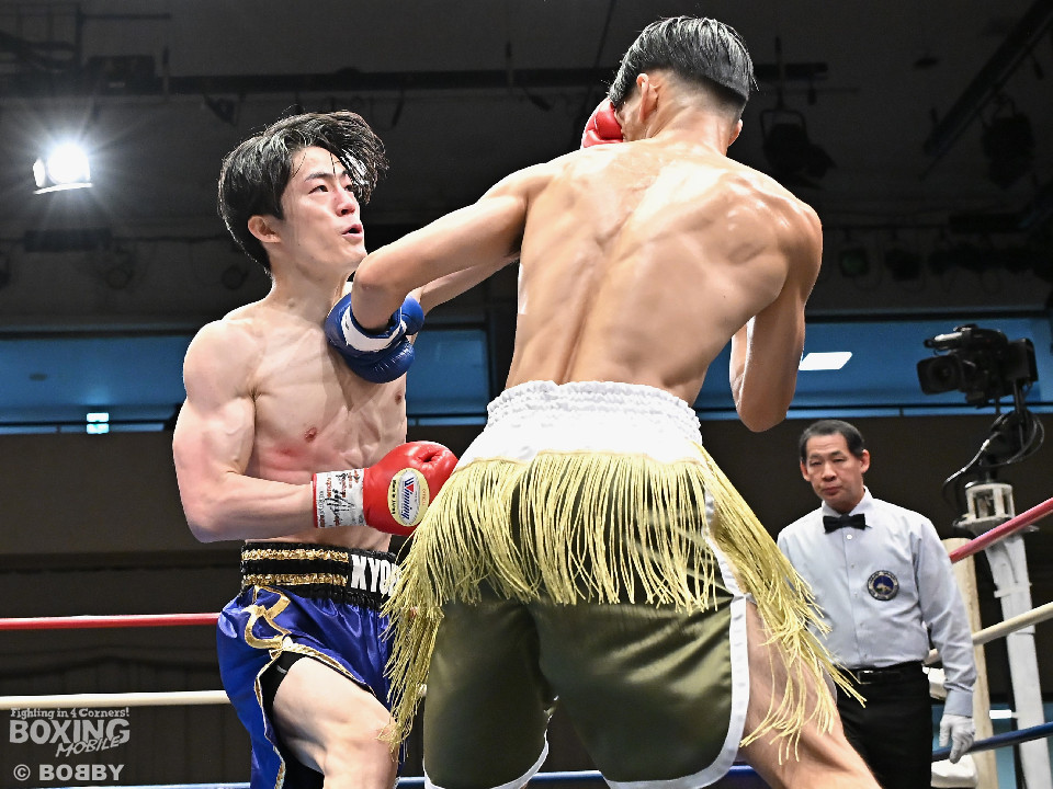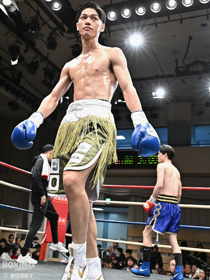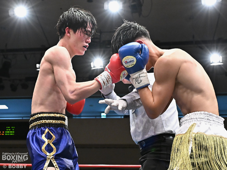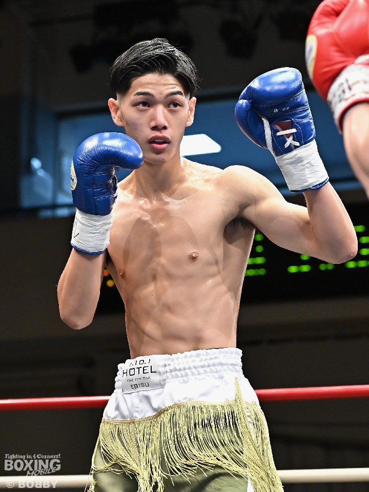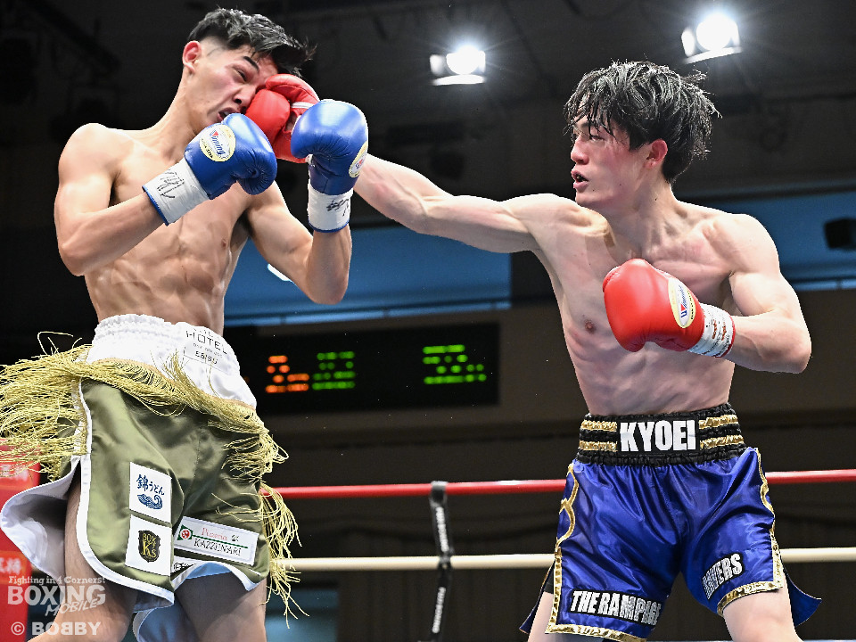 試合:尾川がボディにジャブを伸ばし、踏み込んで右で先制すると、サウスポー松本は右ボディからストレートにつなげ、顔を跳ね上げた。2回、ジャブから左につなげた松本は右アッパーからショートの左をヒット、連打をまとめた。3回、前に出てワンツーをヒットした尾川に対し、松本はジャブから左アッパーにつなげ、アッパーを交えたコンビネーションで優勢をアピールした。4回、ワンツーで仕掛ける尾川に対し、松本は右アッパーを軸にしたコンビネーションでペースを譲らなかった。結果は判定に委ねられ、2者の支持を集めた松本が判定勝利を飾った。