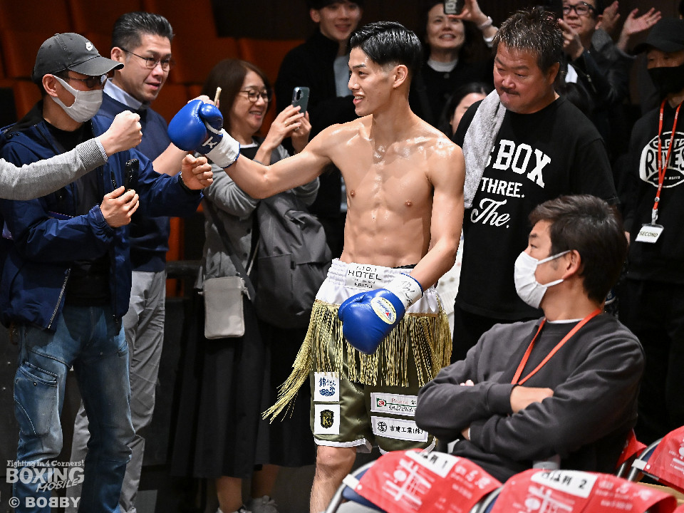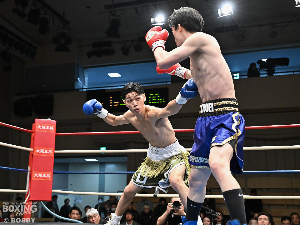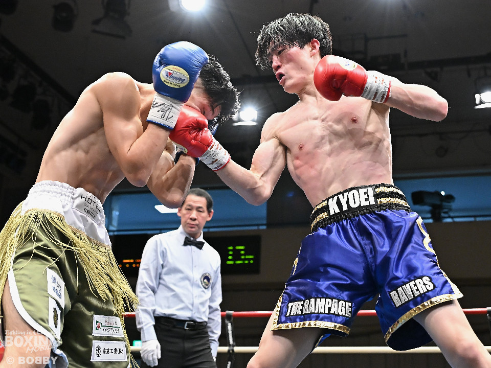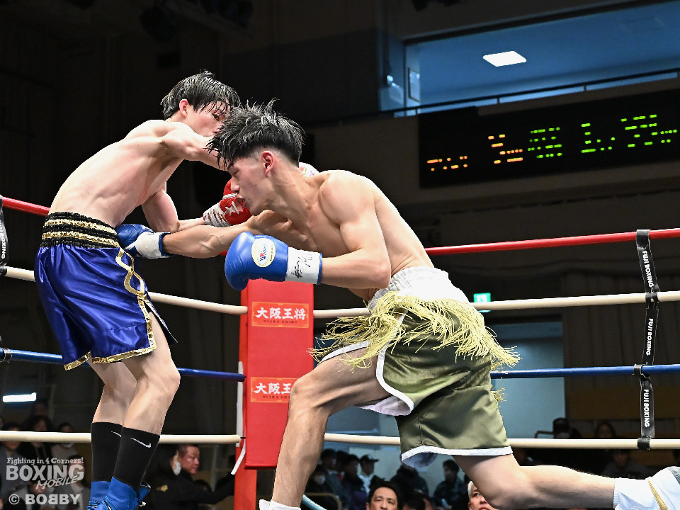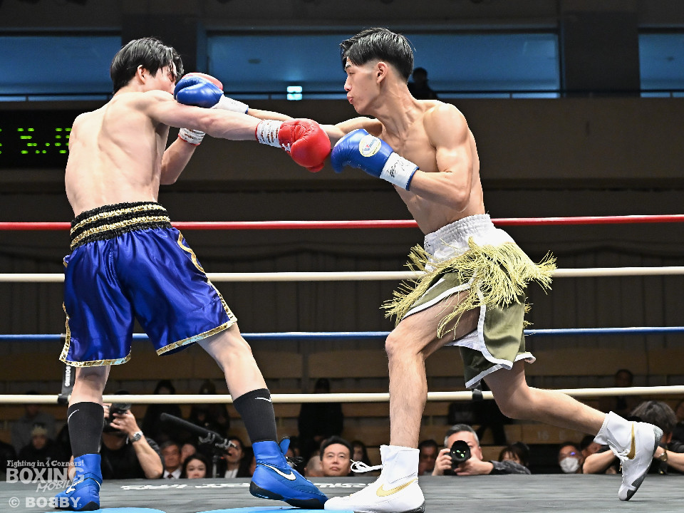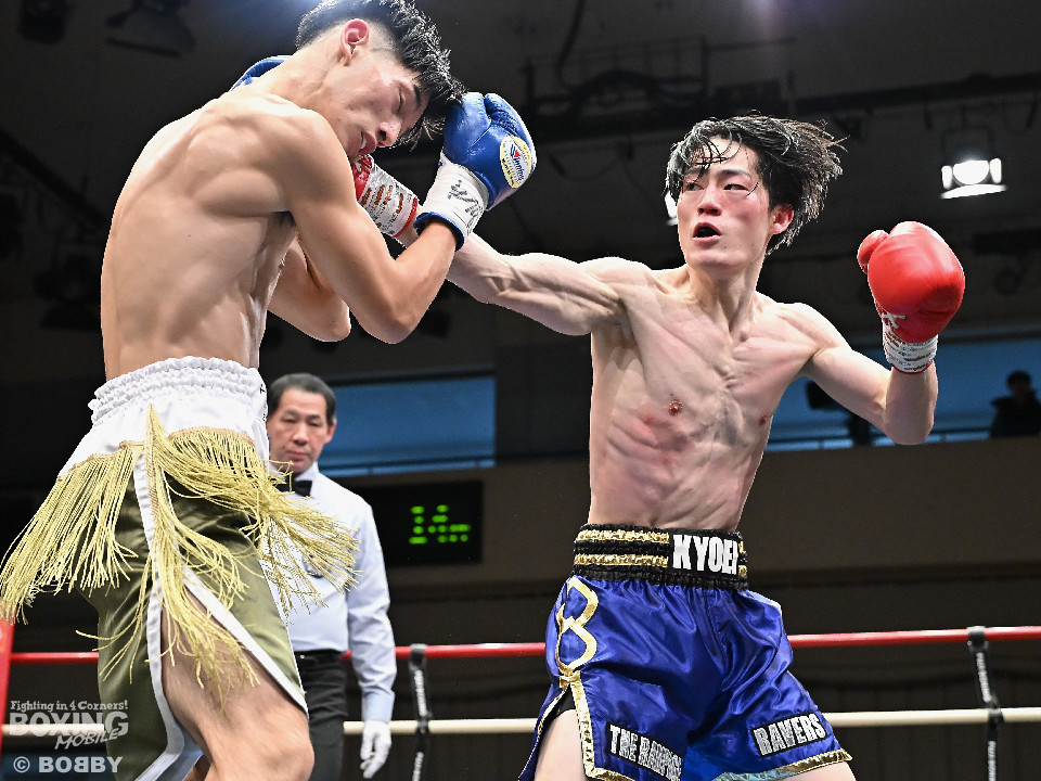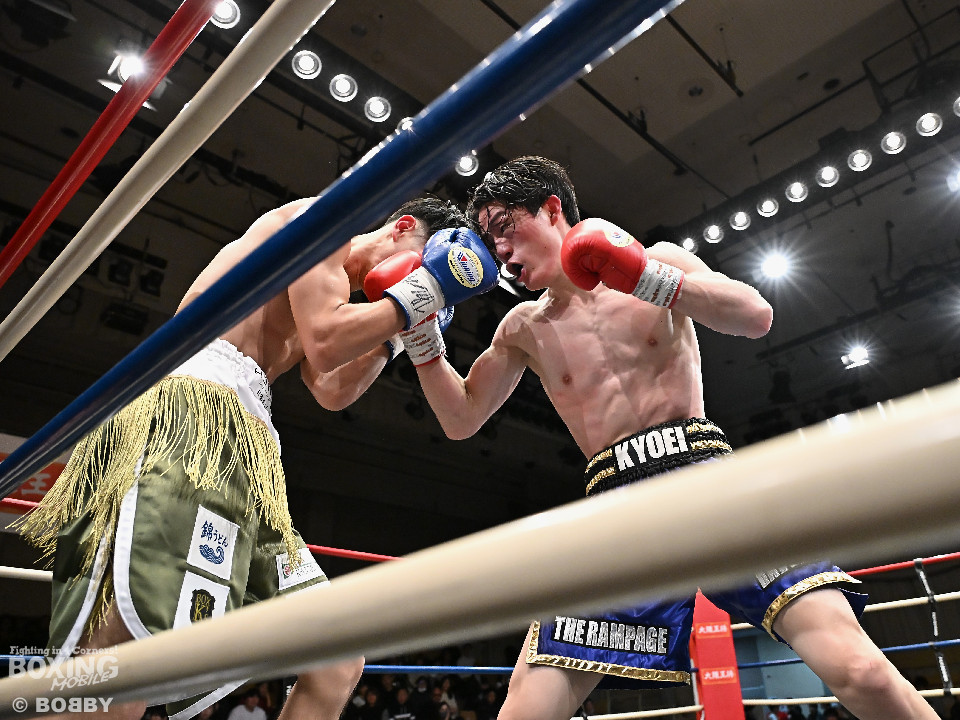 試合:尾川がボディにジャブを伸ばし、踏み込んで右で先制すると、サウスポー松本は右ボディからストレートにつなげ、顔を跳ね上げた。2回、ジャブから左につなげた松本は右アッパーからショートの左をヒット、連打をまとめた。3回、前に出てワンツーをヒットした尾川に対し、松本はジャブから左アッパーにつなげ、アッパーを交えたコンビネーションで優勢をアピールした。4回、ワンツーで仕掛ける尾川に対し、松本は右アッパーを軸にしたコンビネーションでペースを譲らなかった。結果は判定に委ねられ、2者の支持を集めた松本が判定勝利を飾った。