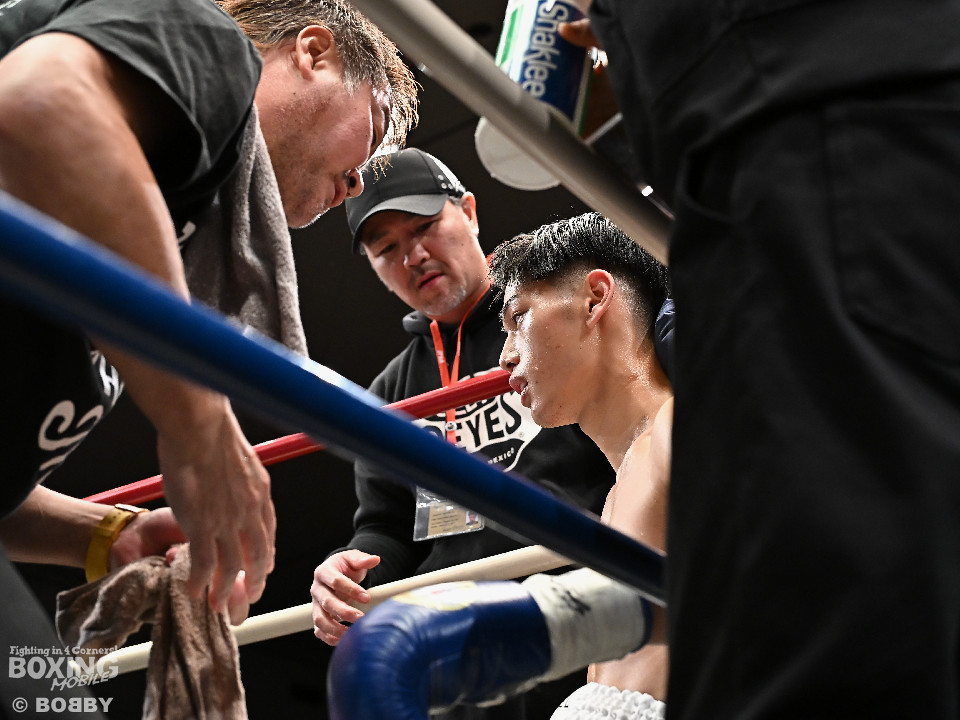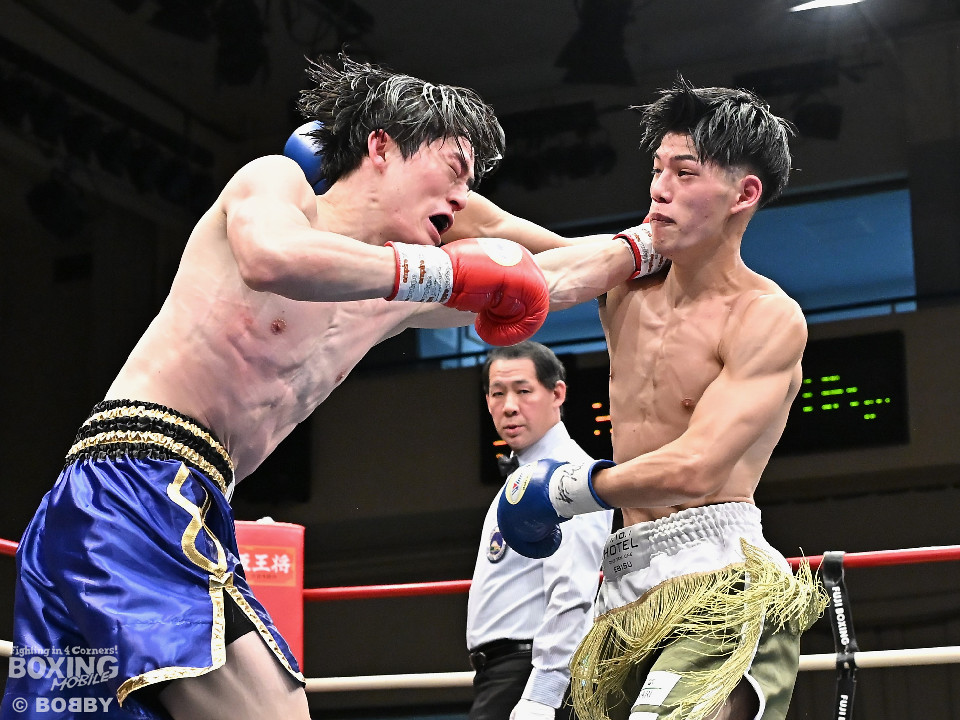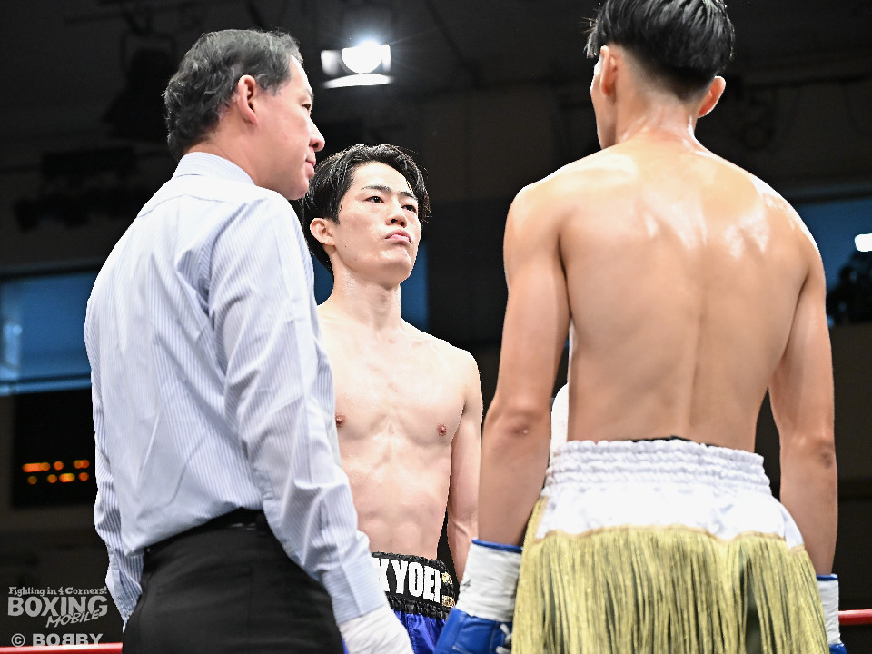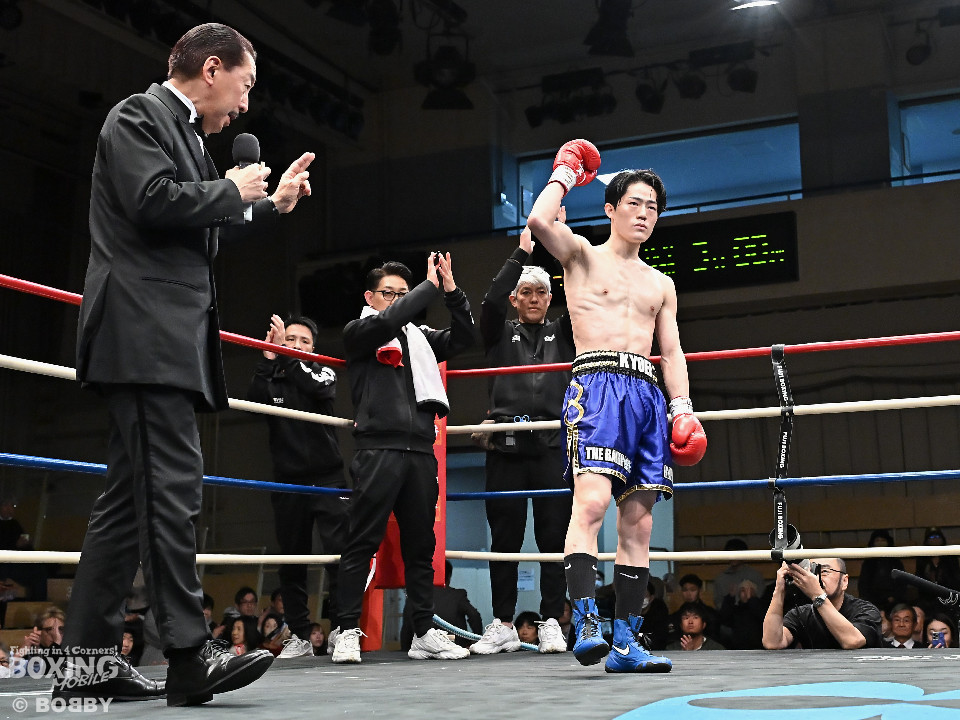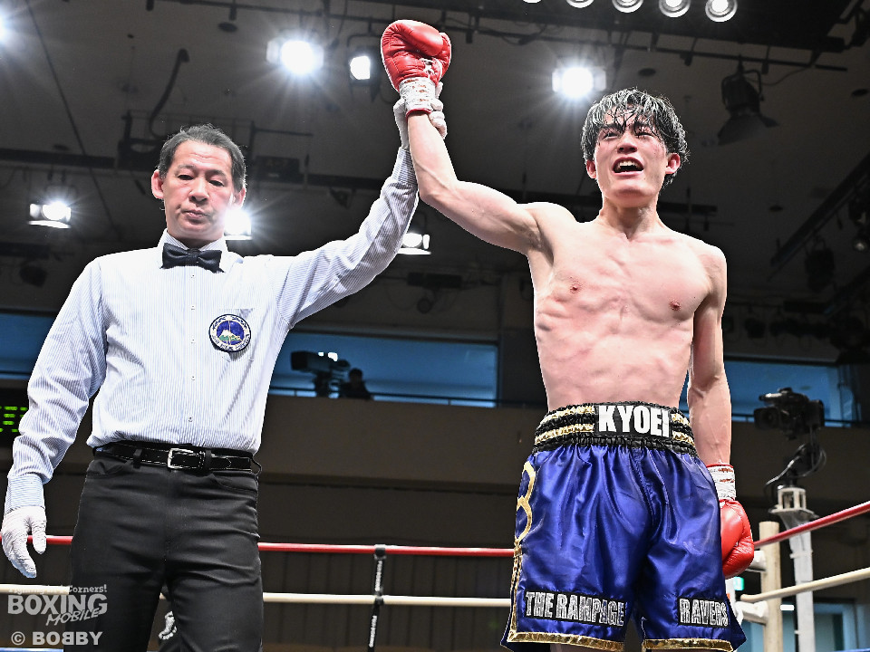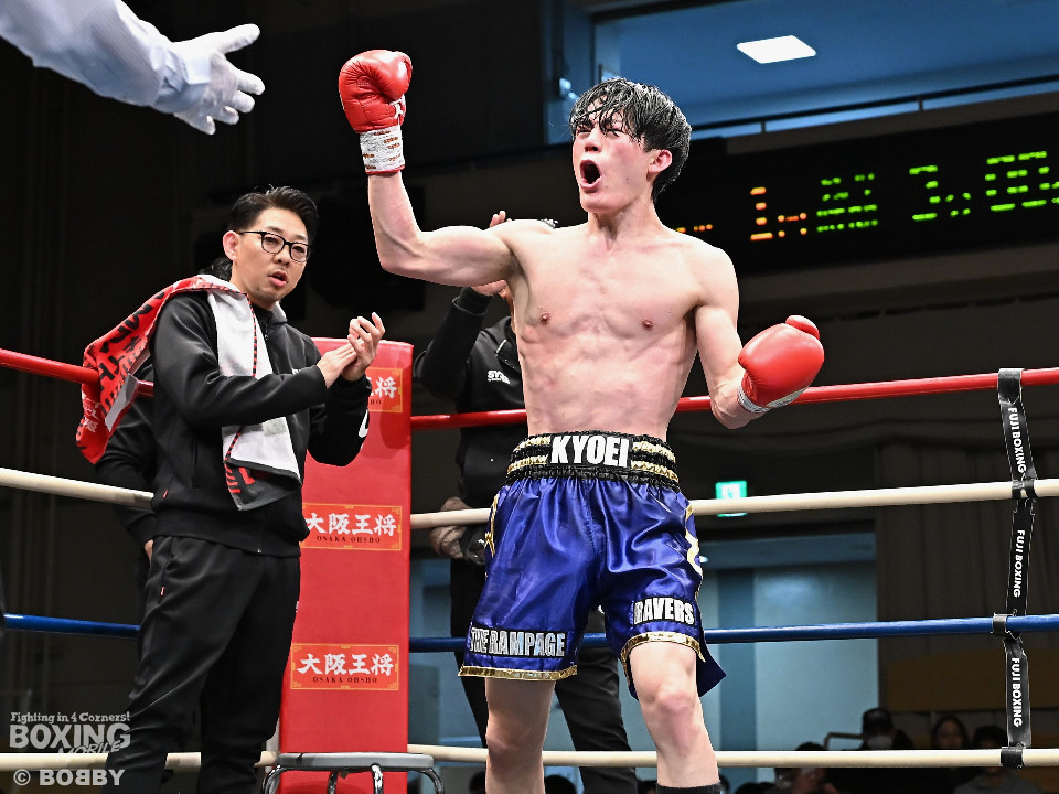 試合:尾川がボディにジャブを伸ばし、踏み込んで右で先制すると、サウスポー松本は右ボディからストレートにつなげ、顔を跳ね上げた。2回、ジャブから左につなげた松本は右アッパーからショートの左をヒット、連打をまとめた。3回、前に出てワンツーをヒットした尾川に対し、松本はジャブから左アッパーにつなげ、アッパーを交えたコンビネーションで優勢をアピールした。4回、ワンツーで仕掛ける尾川に対し、松本は右アッパーを軸にしたコンビネーションでペースを譲らなかった。結果は判定に委ねられ、2者の支持を集めた松本が判定勝利を飾った。