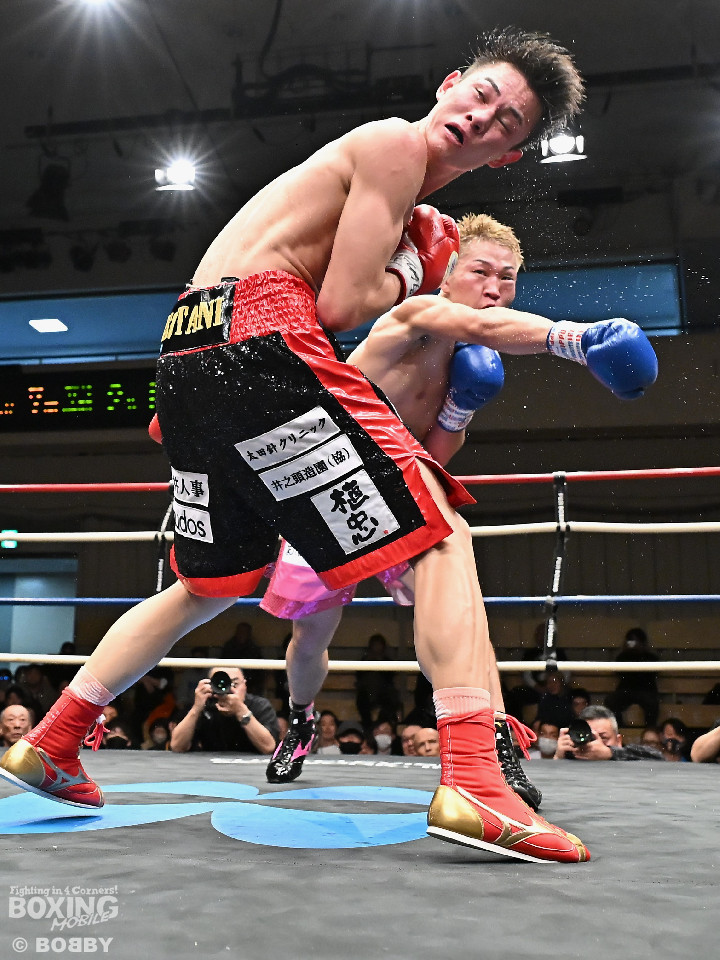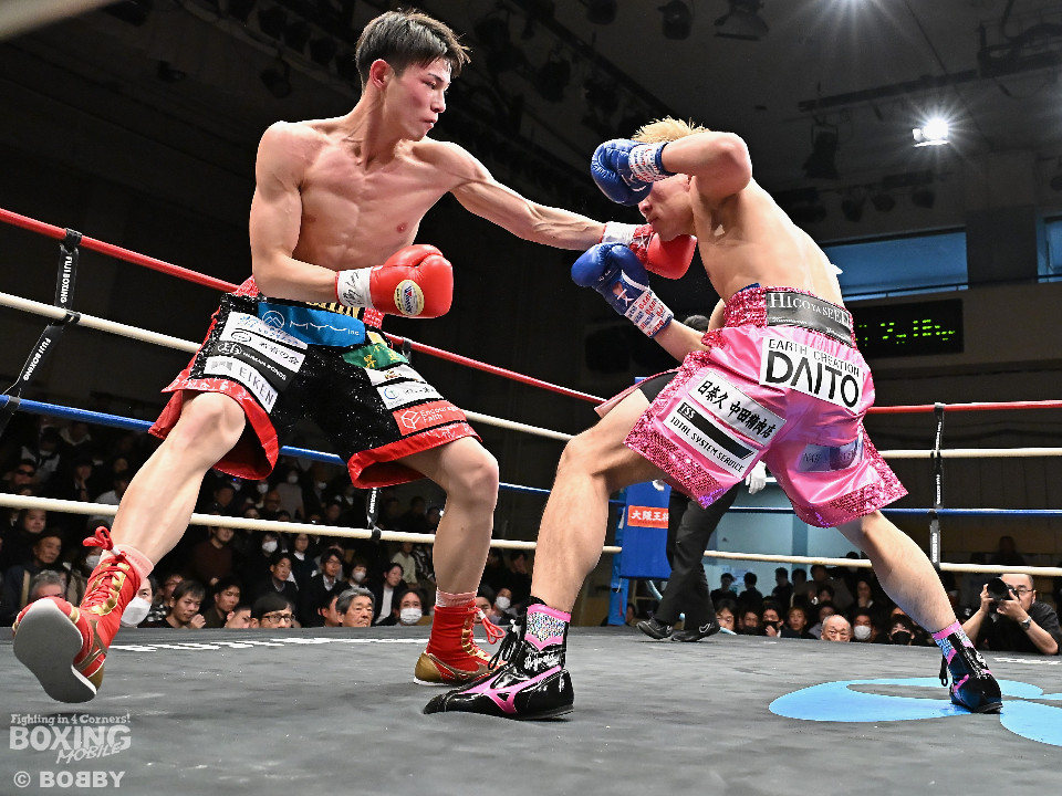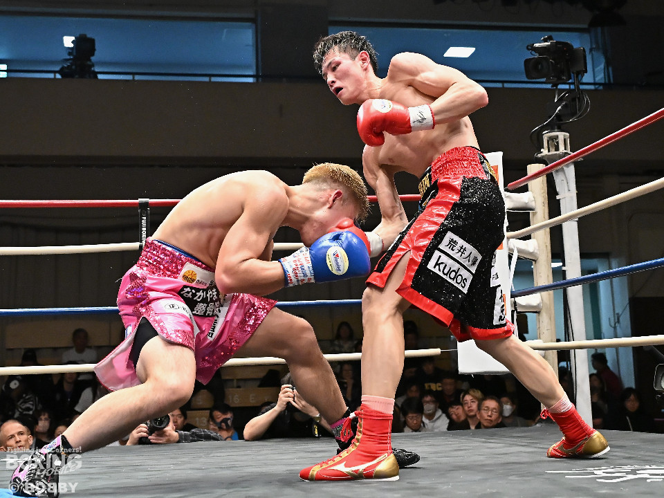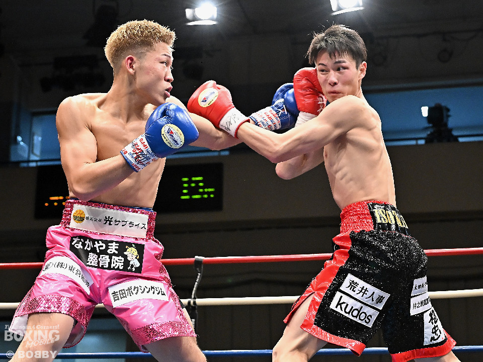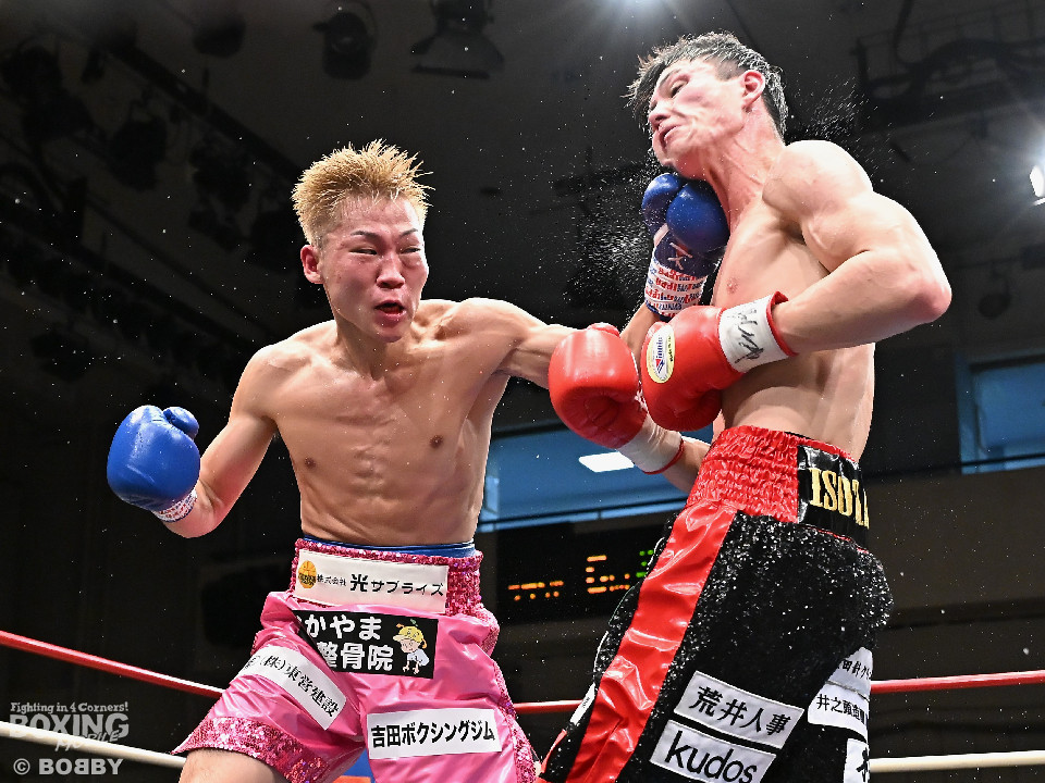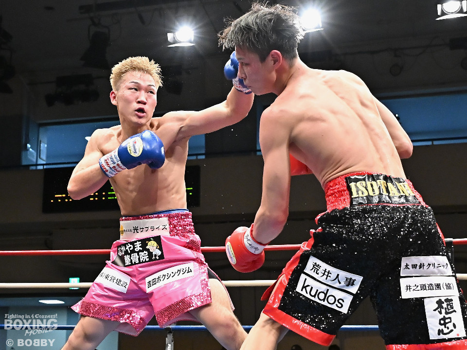 試合:日本ユース・ウェルター級王者の磯谷V2戦。挑戦者はA級初戦でチャンスをつかんだ山本。初回、磯谷がロングレンジをキープしながらジャブを飛ばすのに対し、山本は単発の左フックで対抗。2回、磯谷は長いリーチを活かした左で組み立てるとワンツーをヒット。続く回も磯谷が距離を保った。4回、山本はプレスをかけてワンツーを好打し見栄えの良さをアピール。このラウンド、磯谷は手数が少ない。前半終了時の公開採点は、39-37×3で磯谷がリード。5回、磯谷はジャブを軸に丁寧な組み立て。6回、磯谷はジャブで顔を弾くと山本の左目下が腫れてきた。8回、逆転を狙う山本は積極的に攻め立てたが決定打を打ち込むことができなかった。終始、試合をコントロールした磯谷が防衛に成功した。