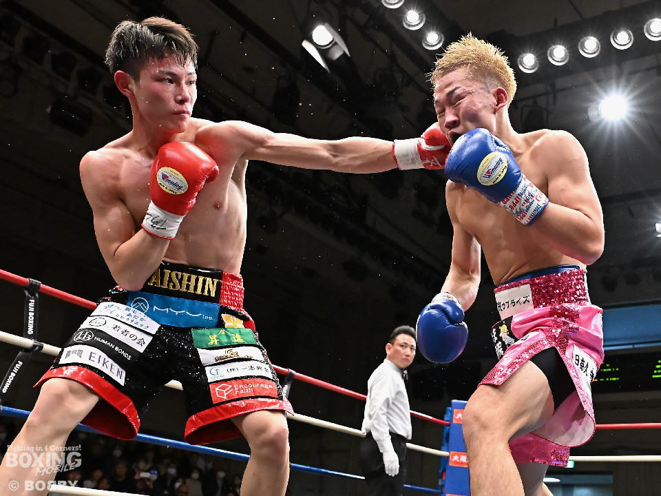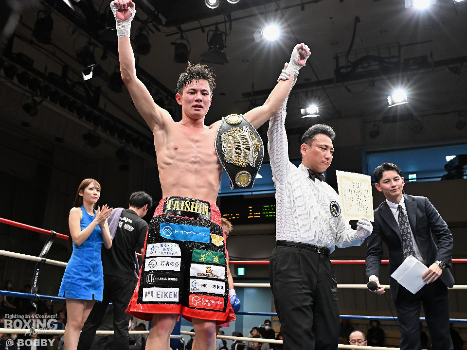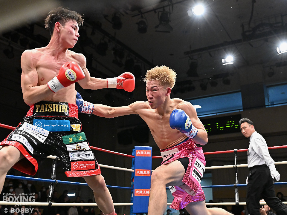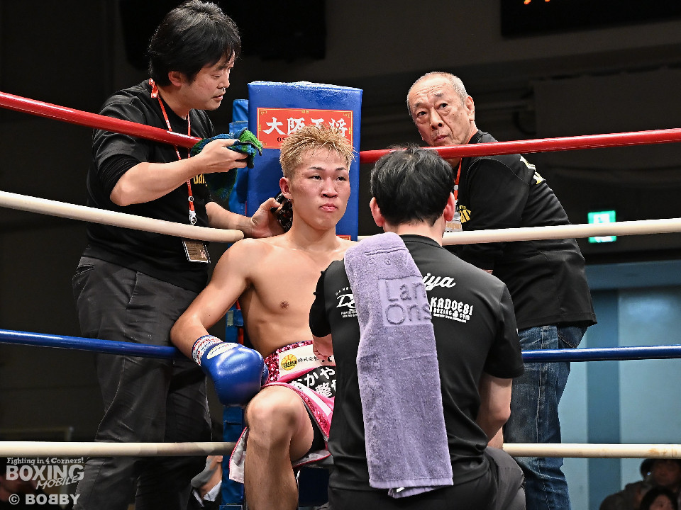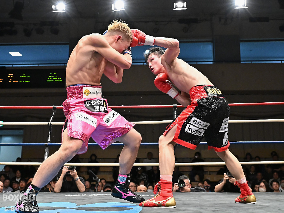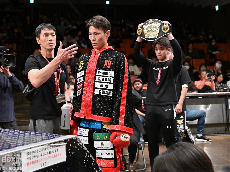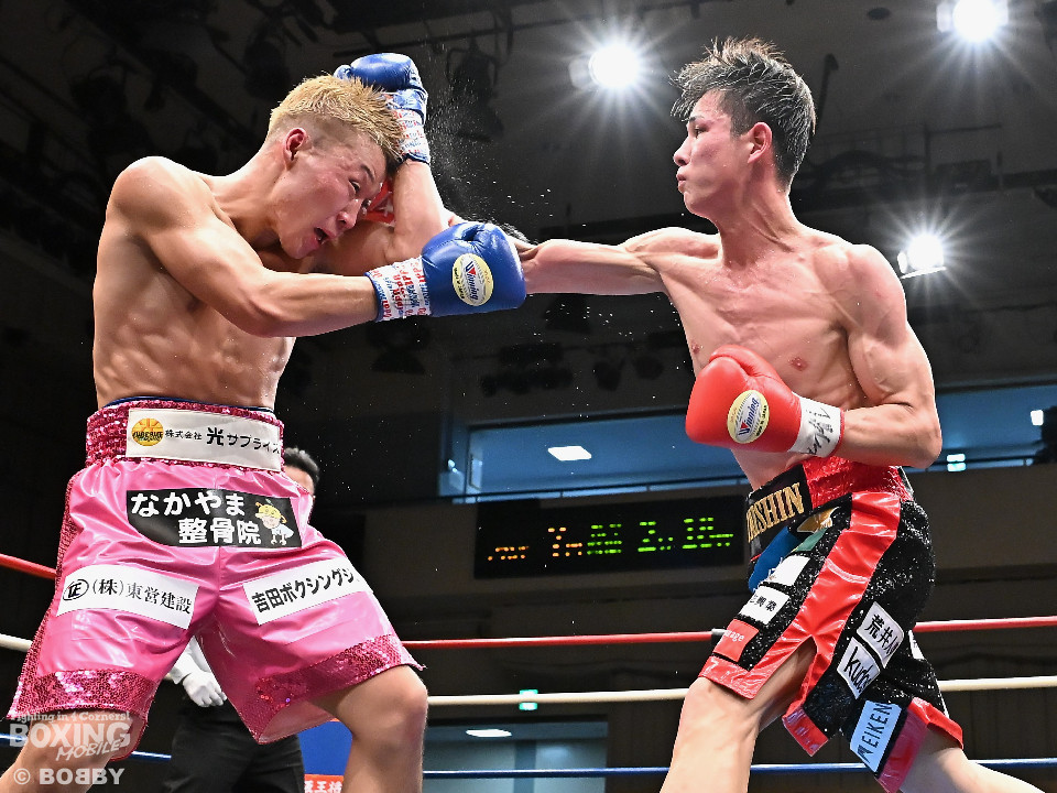 試合:日本ユース・ウェルター級王者の磯谷V2戦。挑戦者はA級初戦でチャンスをつかんだ山本。初回、磯谷がロングレンジをキープしながらジャブを飛ばすのに対し、山本は単発の左フックで対抗。2回、磯谷は長いリーチを活かした左で組み立てるとワンツーをヒット。続く回も磯谷が距離を保った。4回、山本はプレスをかけてワンツーを好打し見栄えの良さをアピール。このラウンド、磯谷は手数が少ない。前半終了時の公開採点は、39-37×3で磯谷がリード。5回、磯谷はジャブを軸に丁寧な組み立て。6回、磯谷はジャブで顔を弾くと山本の左目下が腫れてきた。8回、逆転を狙う山本は積極的に攻め立てたが決定打を打ち込むことができなかった。終始、試合をコントロールした磯谷が防衛に成功した。
