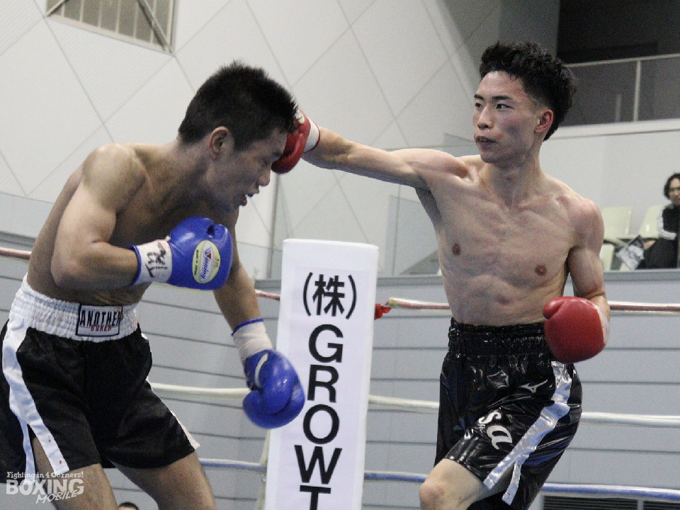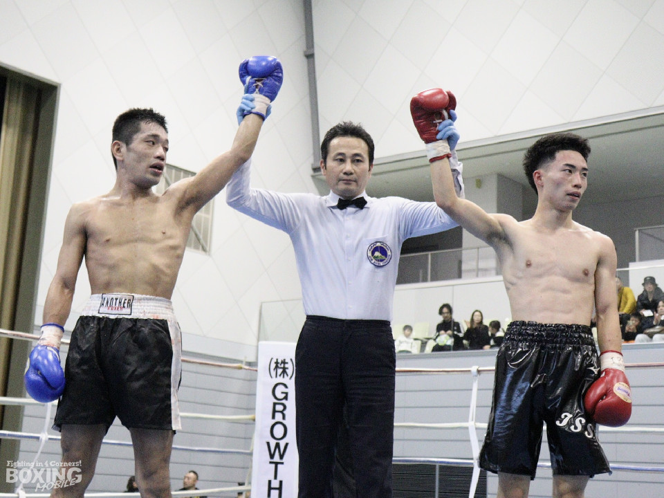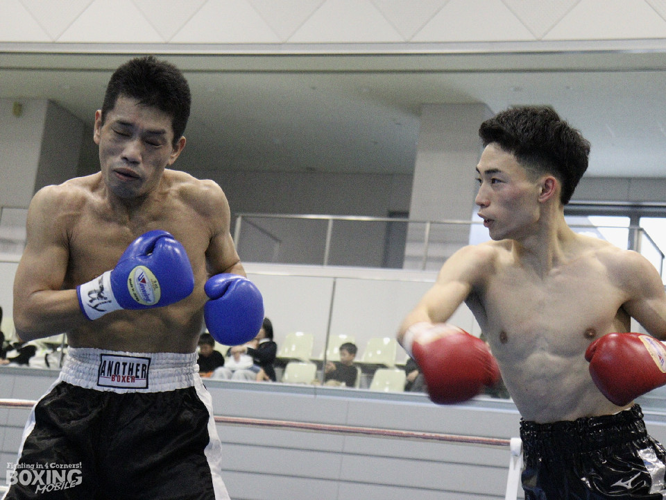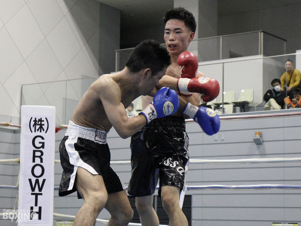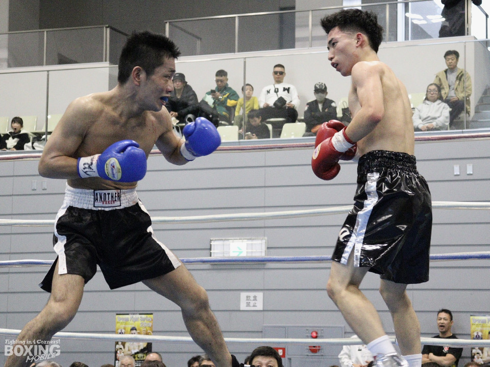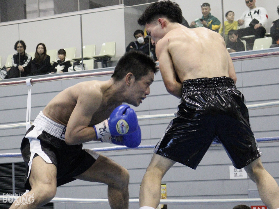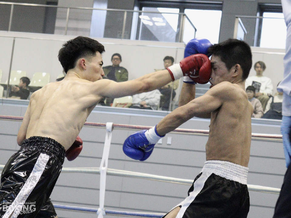 試合:重岡が出入りを意識しながら右カウンターで顔を弾き先制。2回、重岡はフットワークを駆使しながらワンツーをヒット。左ボディで動きを止めに行きたい牧山だが、捕まえきれず。3回、牧山はしつこく前に出て右フックを叩きつけて反撃。偶然のバッティングで牧山は左目上をカット。4回、多少の空振りを気にせずグイグイと攻め立てる牧山と足を使って捌きたい重岡の構図となった。ジャッジに委ねられた採点は三者三様の引き分け。