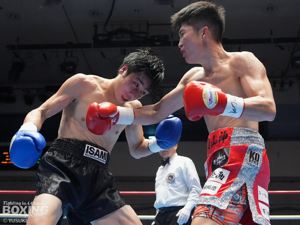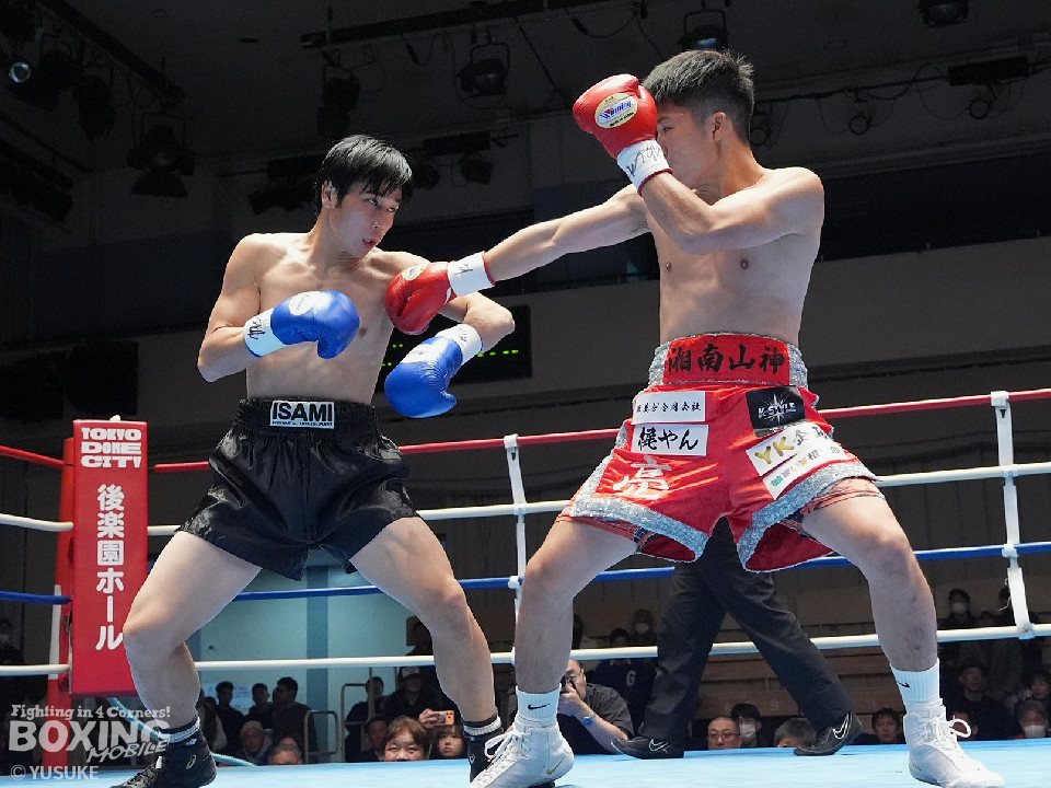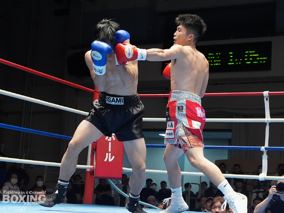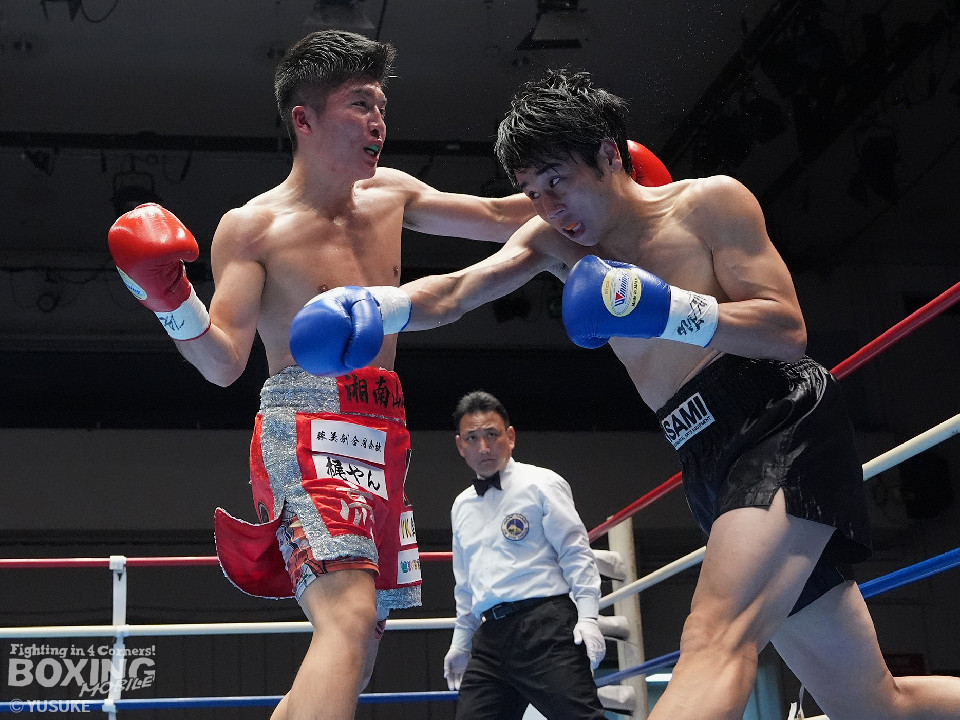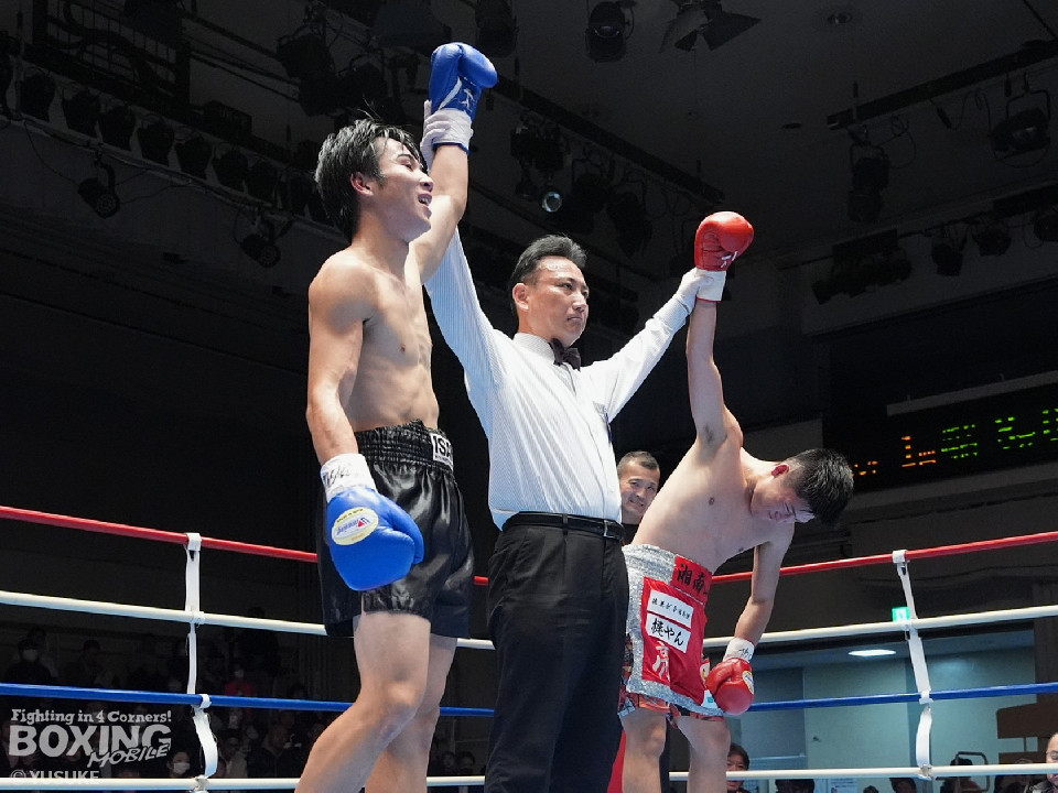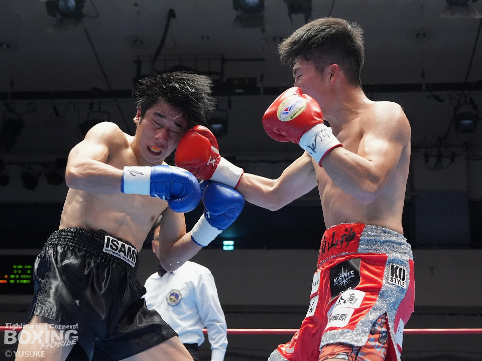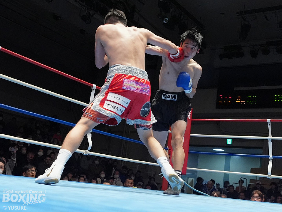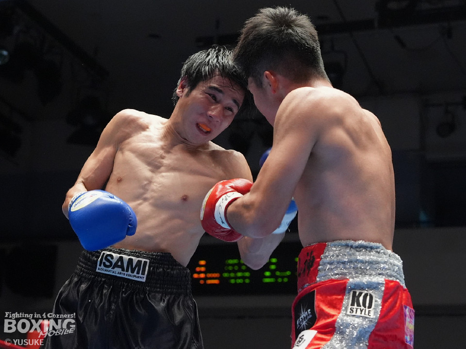試合:今年9月以来のダイレクトリマッチは、サウスポー越前屋が前後の動きを意識しながら左ストレートで切り込み先制攻撃。2回、井野は独特のリズムからの右ストレート、左フックを好打。3回、井野は出どころの分かりにくい左右を振ると、打ち終わりに頭のポジションを意識。左ストレートにつなげたい越前屋だが有効打を決めるまでには至らず。4回、越前屋はプッシュしながらワンツーをヒット。ラスト30秒は残っている力を振り絞り打ち合った。ジャッジに委ねられた採点は三者三様の引き分けとなった。