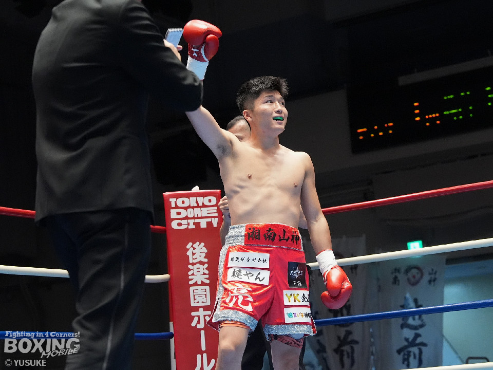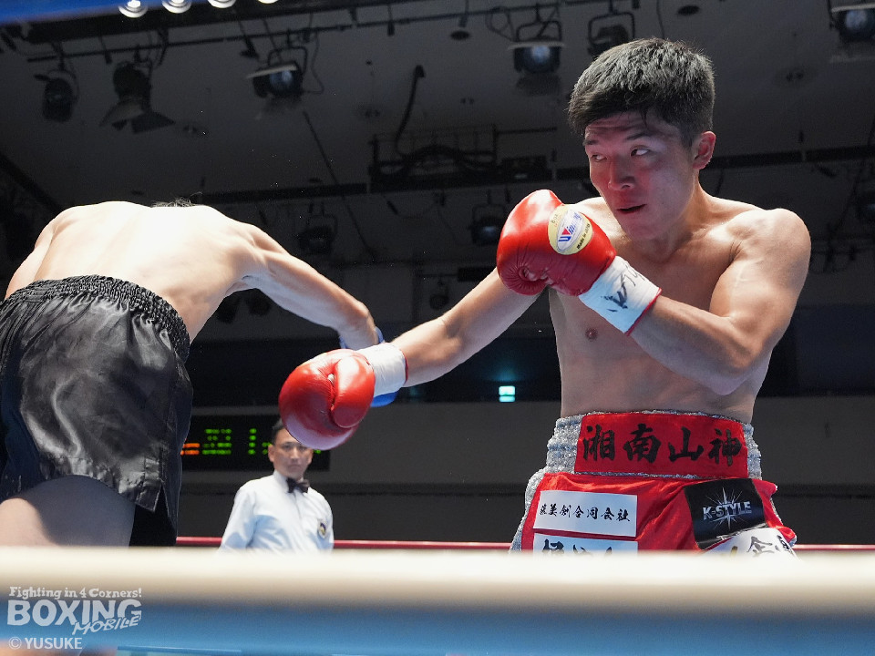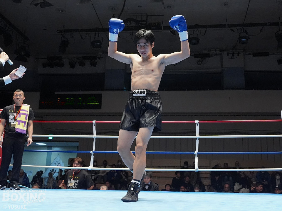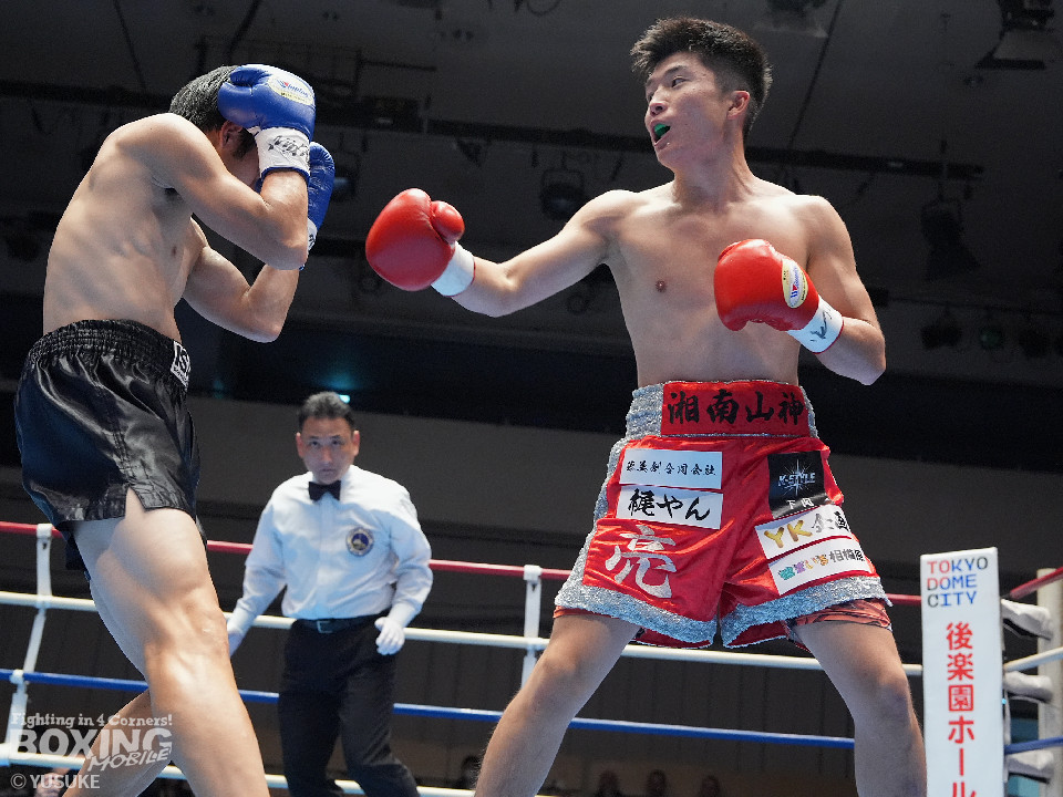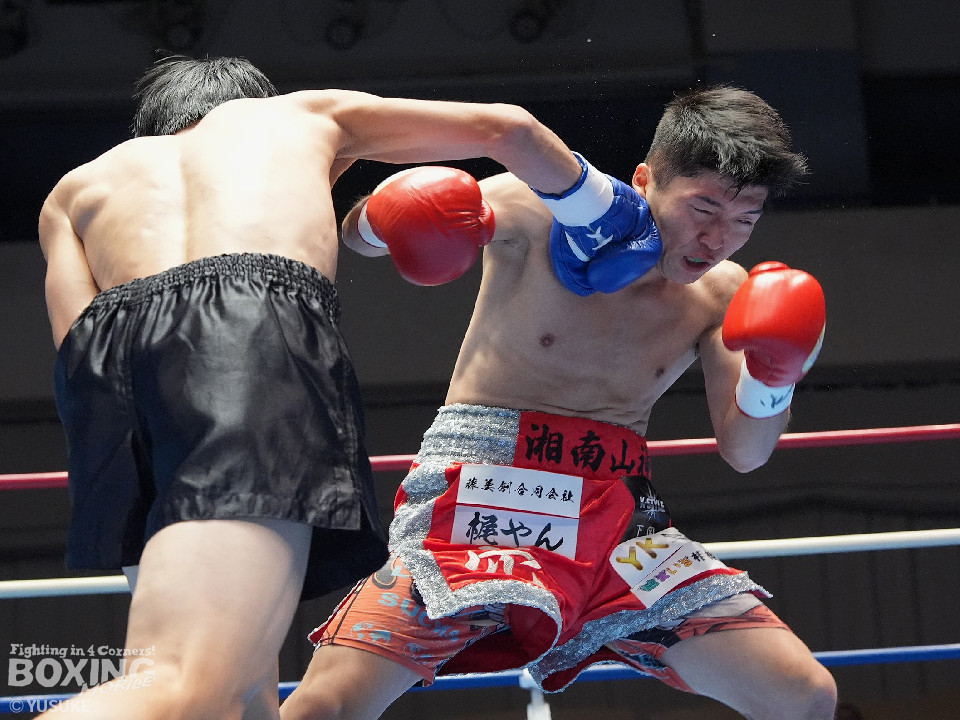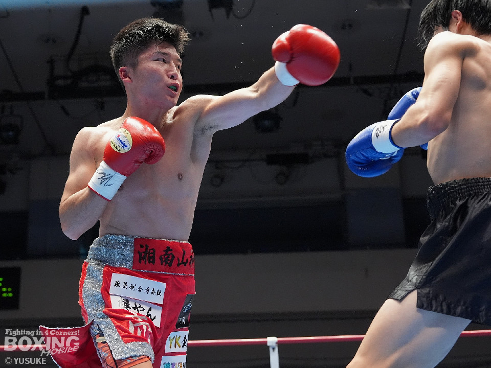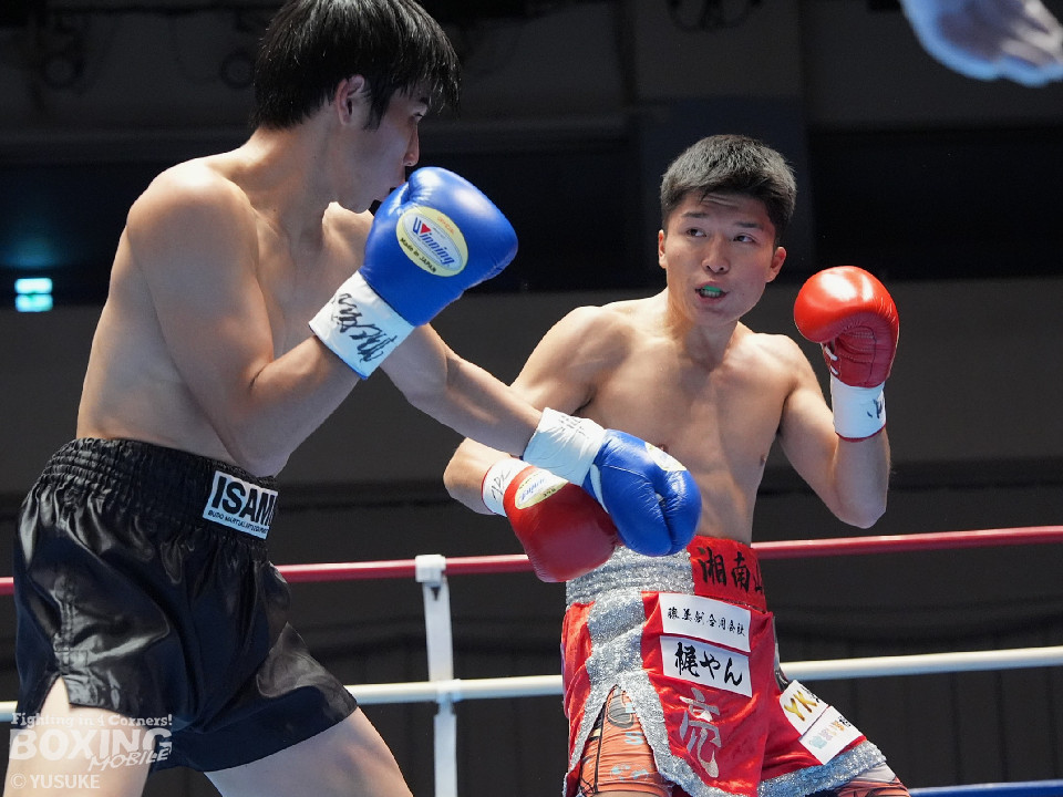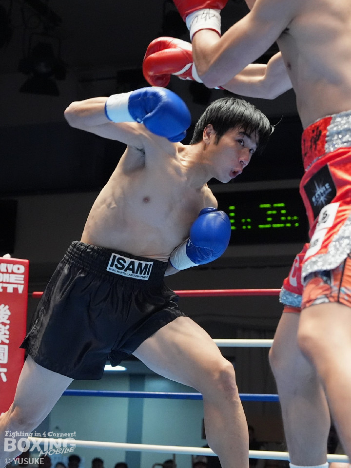 試合:今年9月以来のダイレクトリマッチは、サウスポー越前屋が前後の動きを意識しながら左ストレートで切り込み先制攻撃。2回、井野は独特のリズムからの右ストレート、左フックを好打。3回、井野は出どころの分かりにくい左右を振ると、打ち終わりに頭のポジションを意識。左ストレートにつなげたい越前屋だが有効打を決めるまでには至らず。4回、越前屋はプッシュしながらワンツーをヒット。ラスト30秒は残っている力を振り絞り打ち合った。ジャッジに委ねられた採点は三者三様の引き分けとなった。