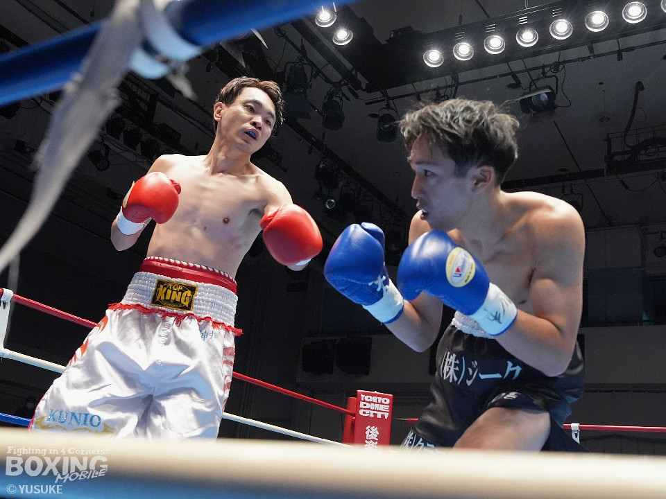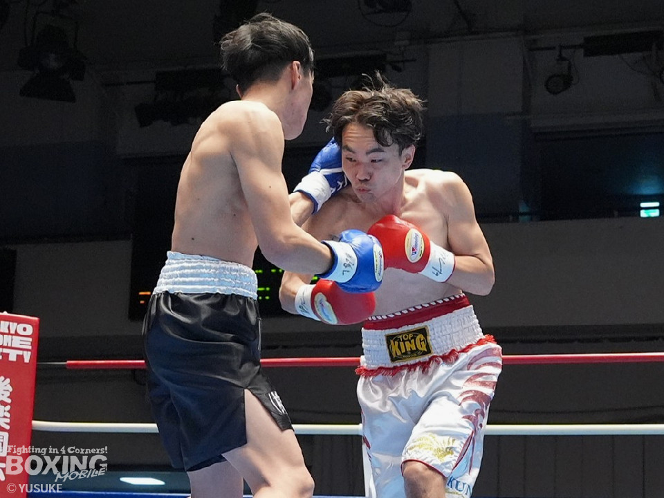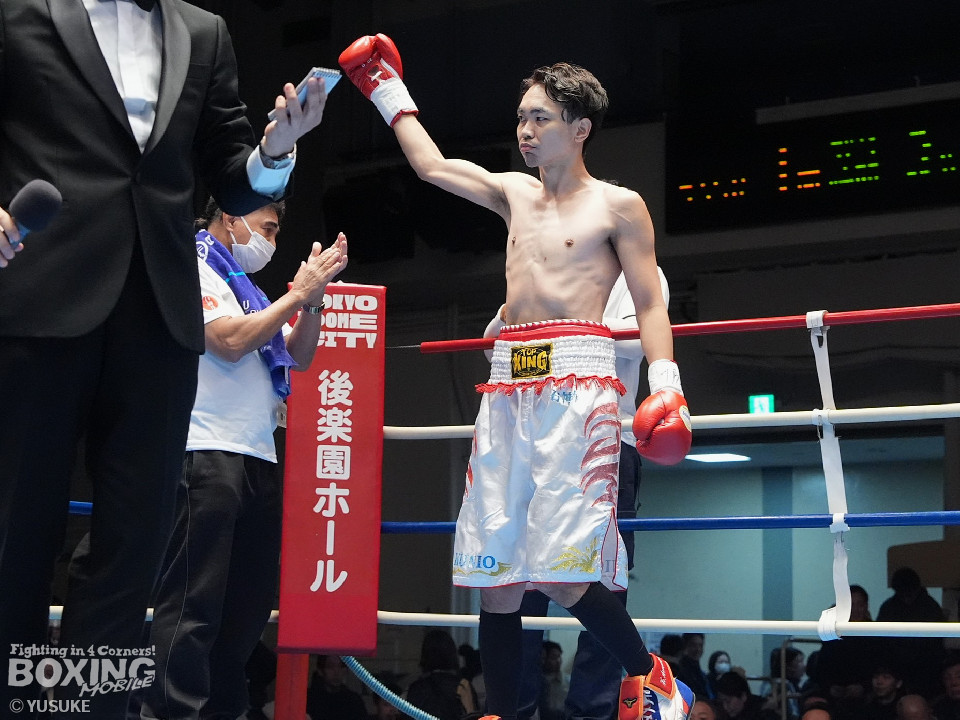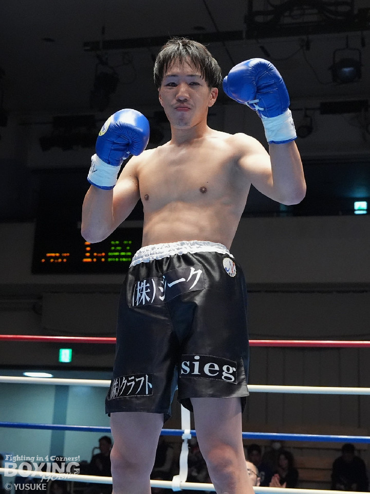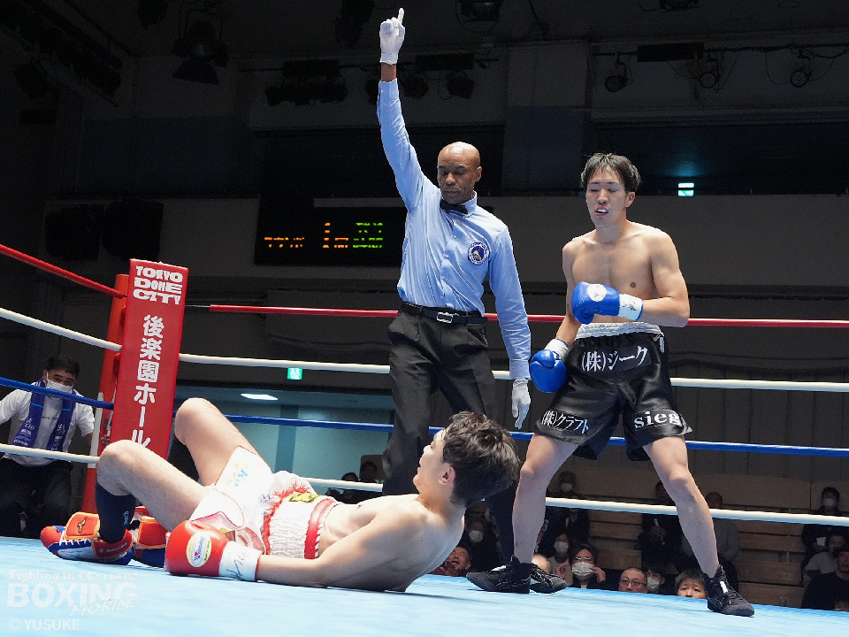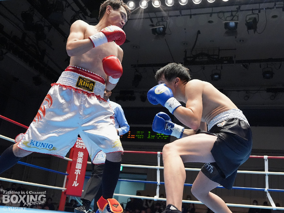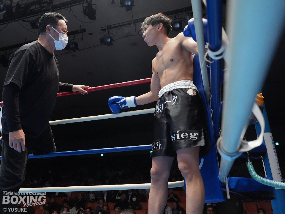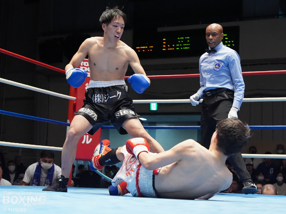 試合:長身の浅沼がジャブを飛ばしながら打ち下ろしの右ストレートを繰り出すのに対し、森山は頭を振りながらタイミングを探る展開。静かな立ち上がりだったが、ラウンド終了直前に森山の右ストレートがジャストミート!痛烈なダウンを奪った。ファイティングポーズを取った浅沼だったが、ダメージを考慮したレフェリーは10カウントを数え上げた。デビュー戦の森山が初回KO勝ちした。
