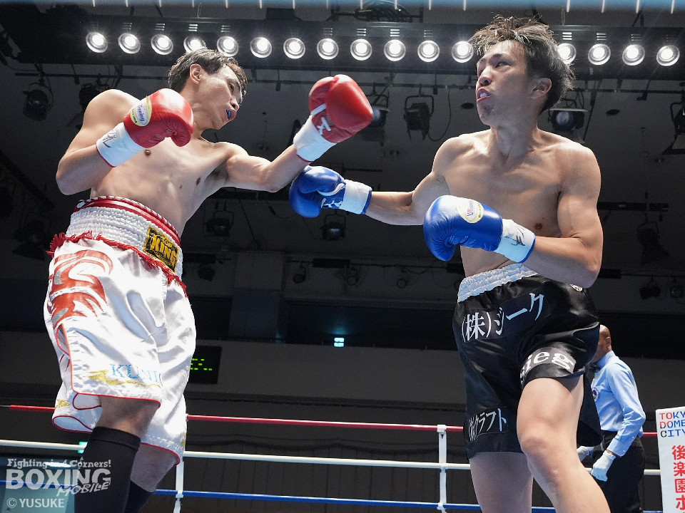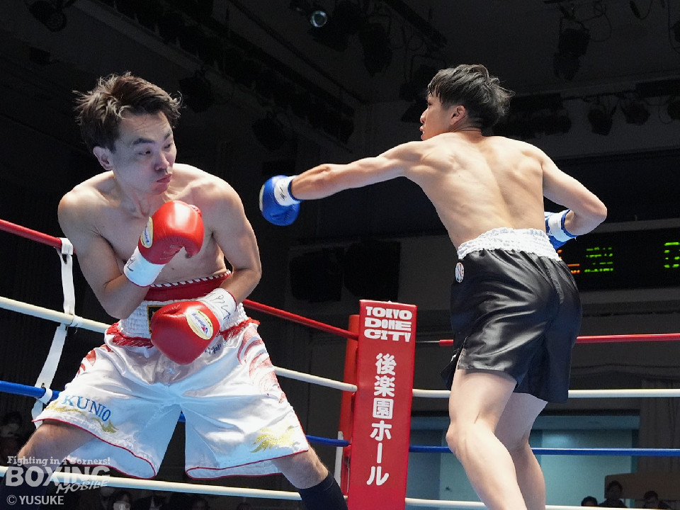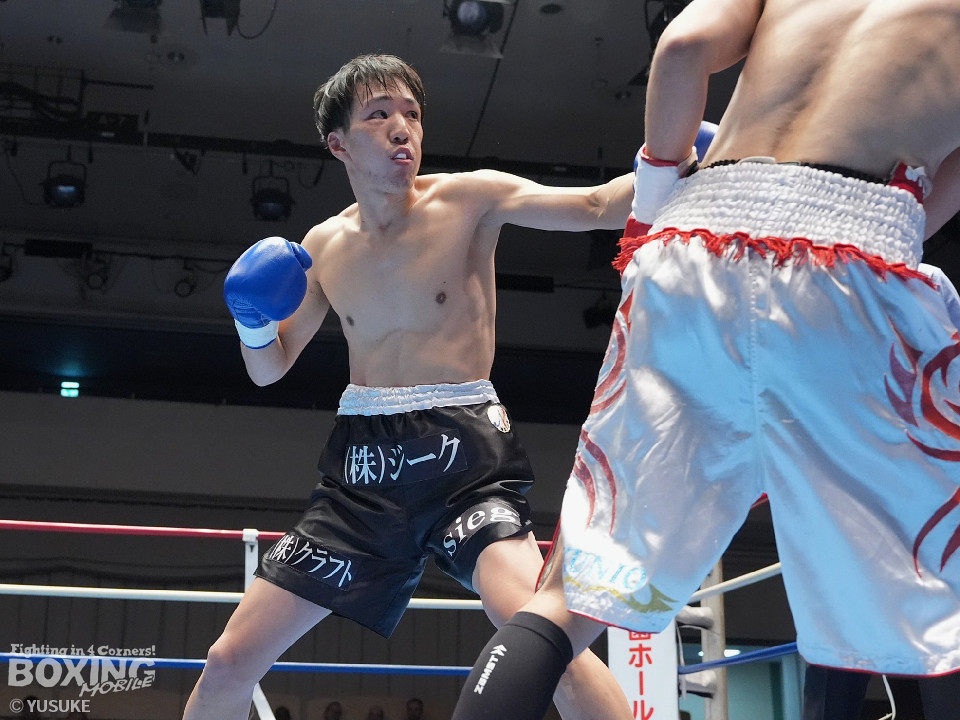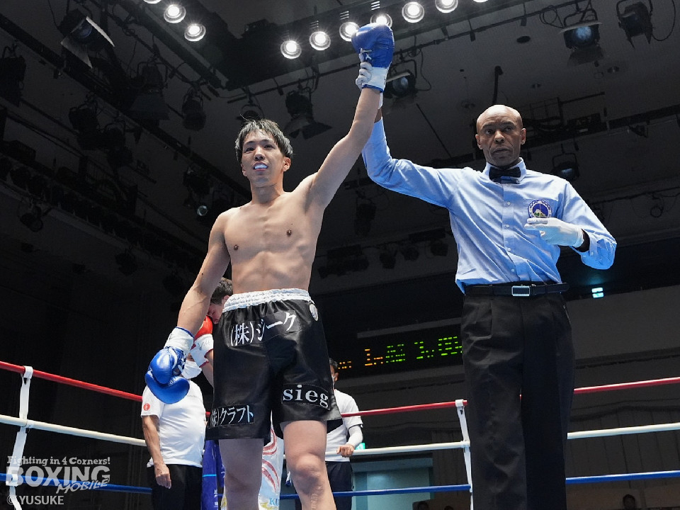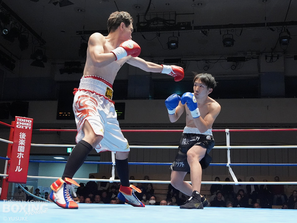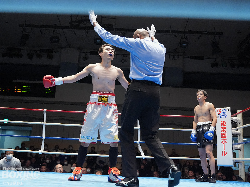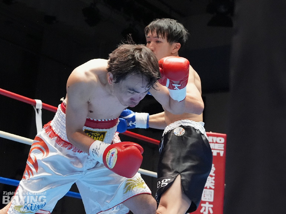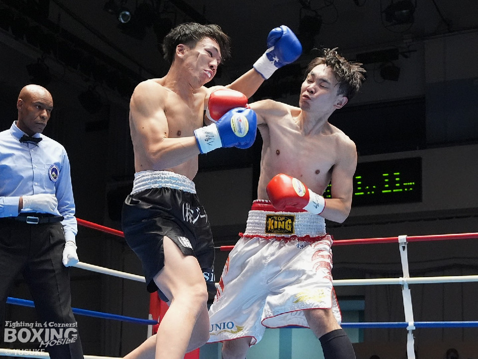 試合:長身の浅沼がジャブを飛ばしながら打ち下ろしの右ストレートを繰り出すのに対し、森山は頭を振りながらタイミングを探る展開。静かな立ち上がりだったが、ラウンド終了直前に森山の右ストレートがジャストミート!痛烈なダウンを奪った。ファイティングポーズを取った浅沼だったが、ダメージを考慮したレフェリーは10カウントを数え上げた。デビュー戦の森山が初回KO勝ちした。