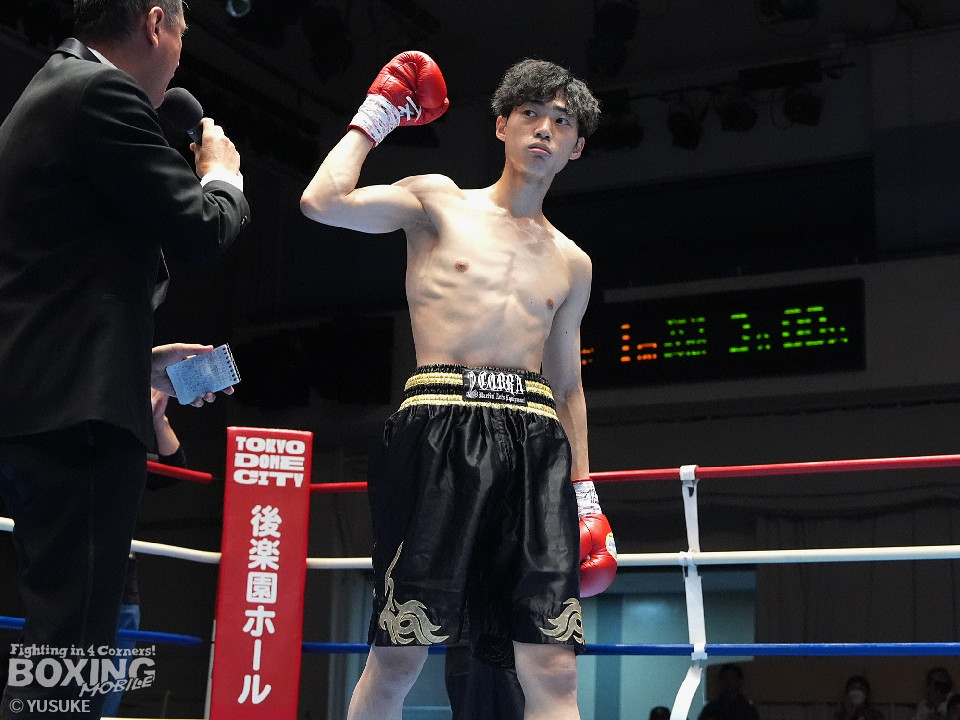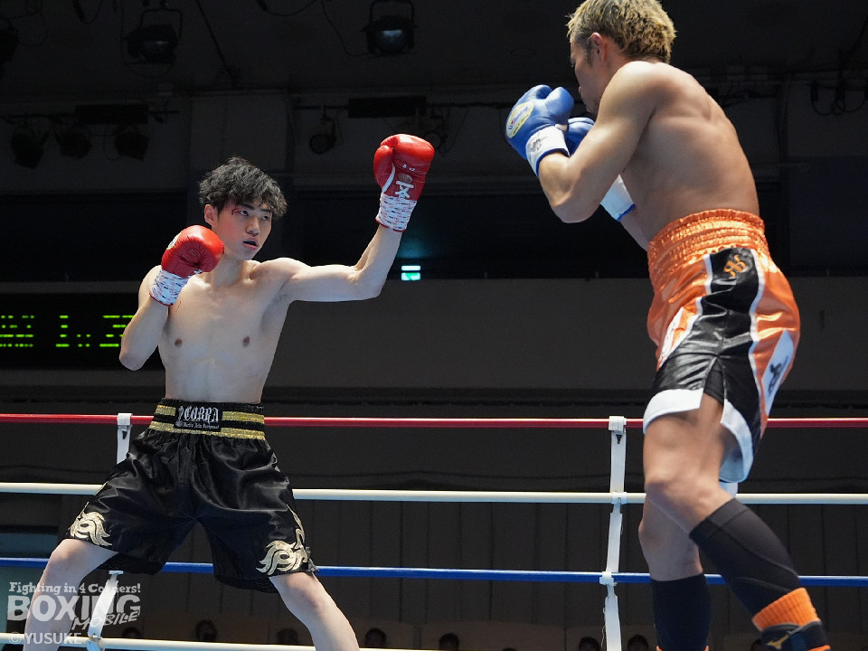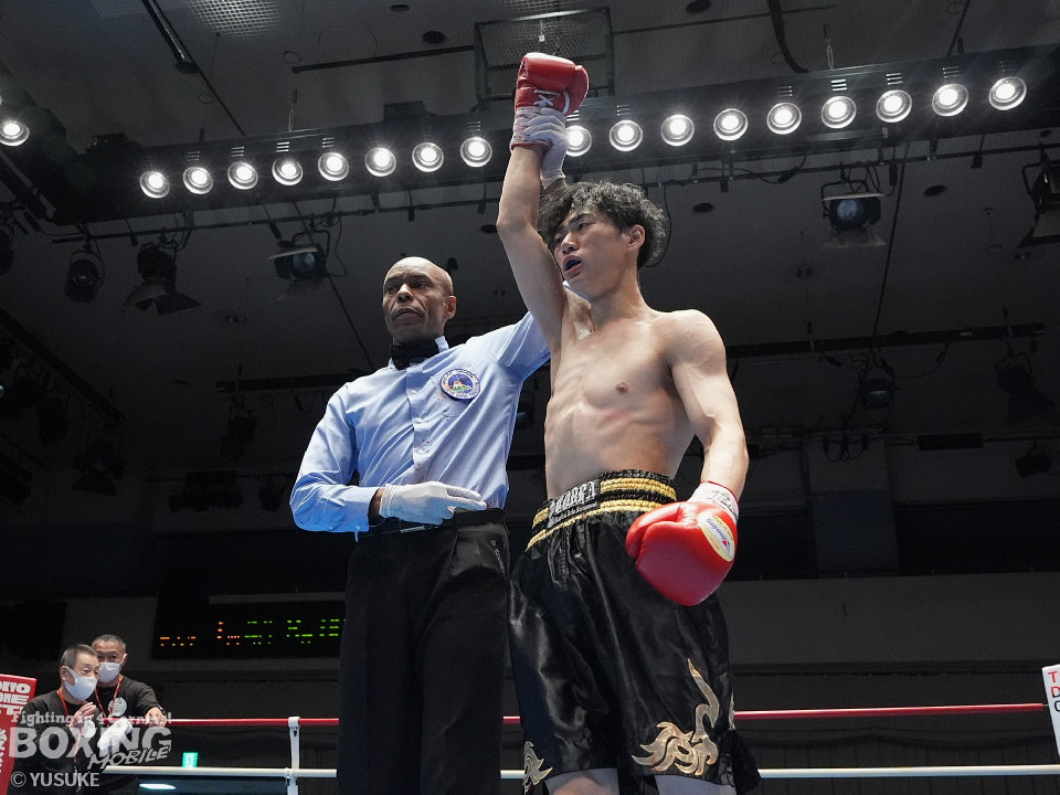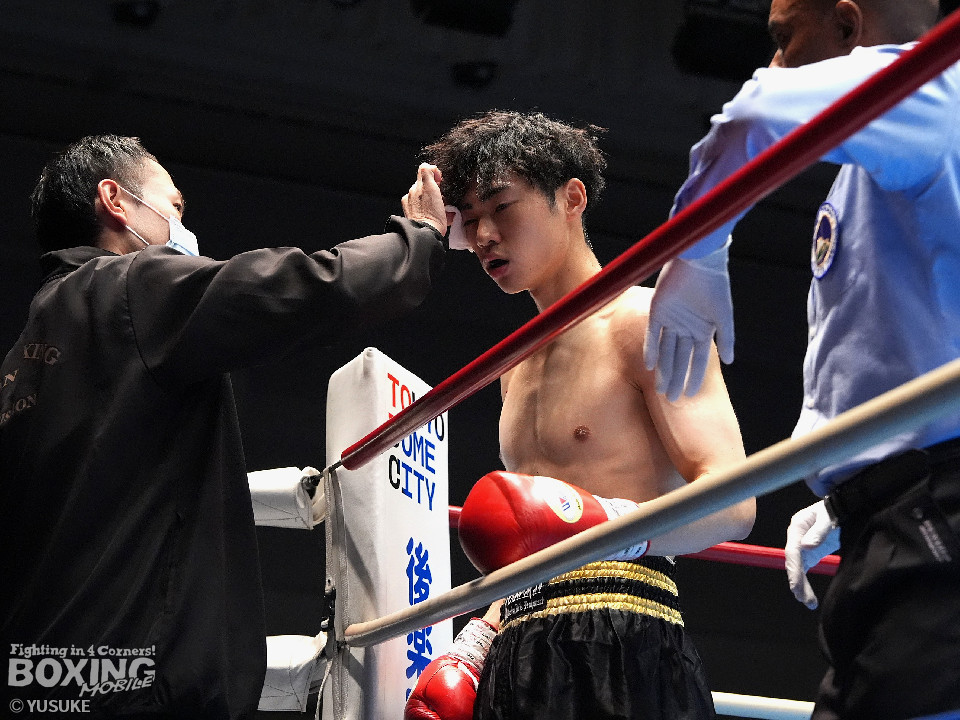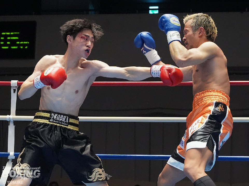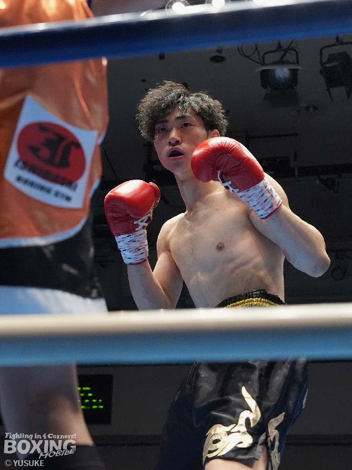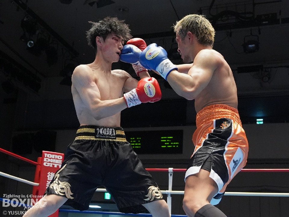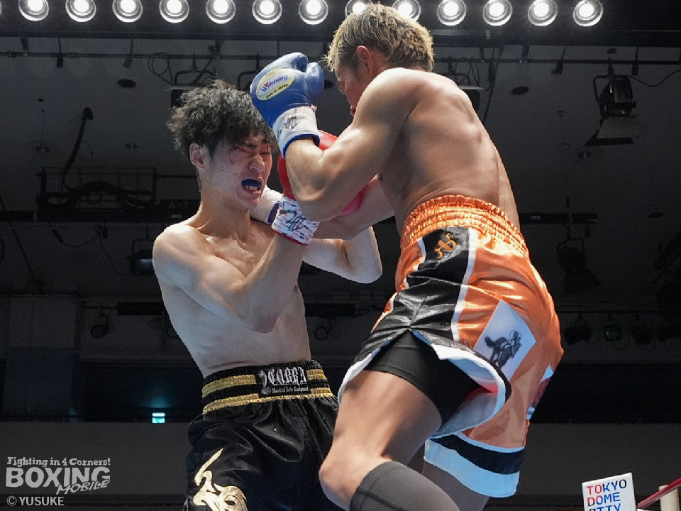 試合:サウスポー江田が左ストレートから切り込むのに対し、清水はワンツーで対抗。頭がぶつかり清水は右目上をカット。再開後、激しい打撃戦を繰り広げる中、清水は右ショートでグラつかせるとロープに詰めて連打で攻勢。手が出なくった江田を見てレフェリーがストップした。