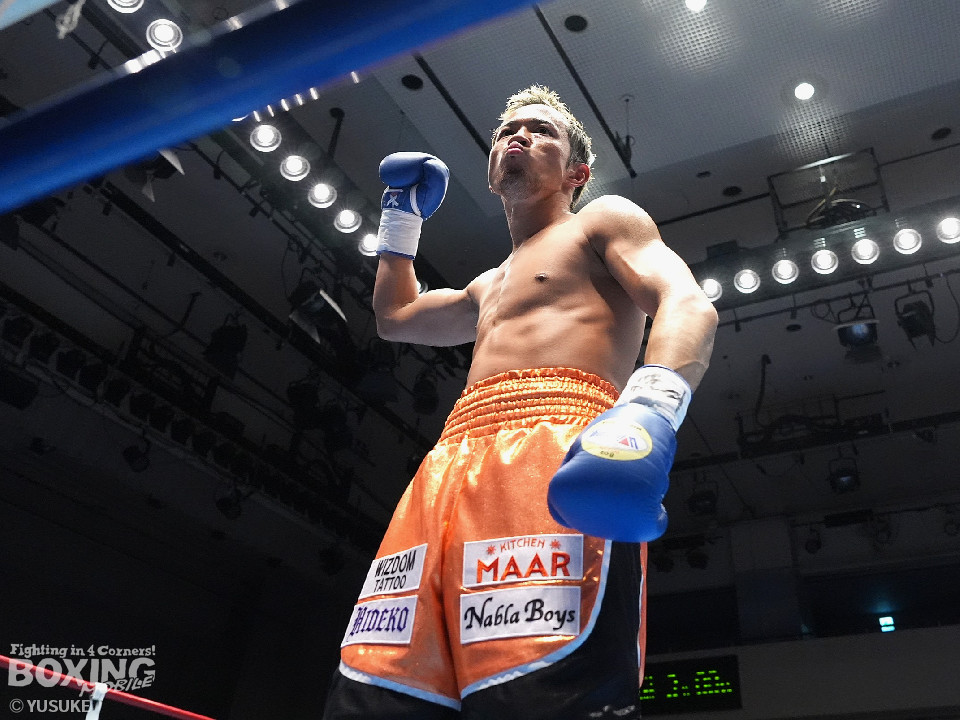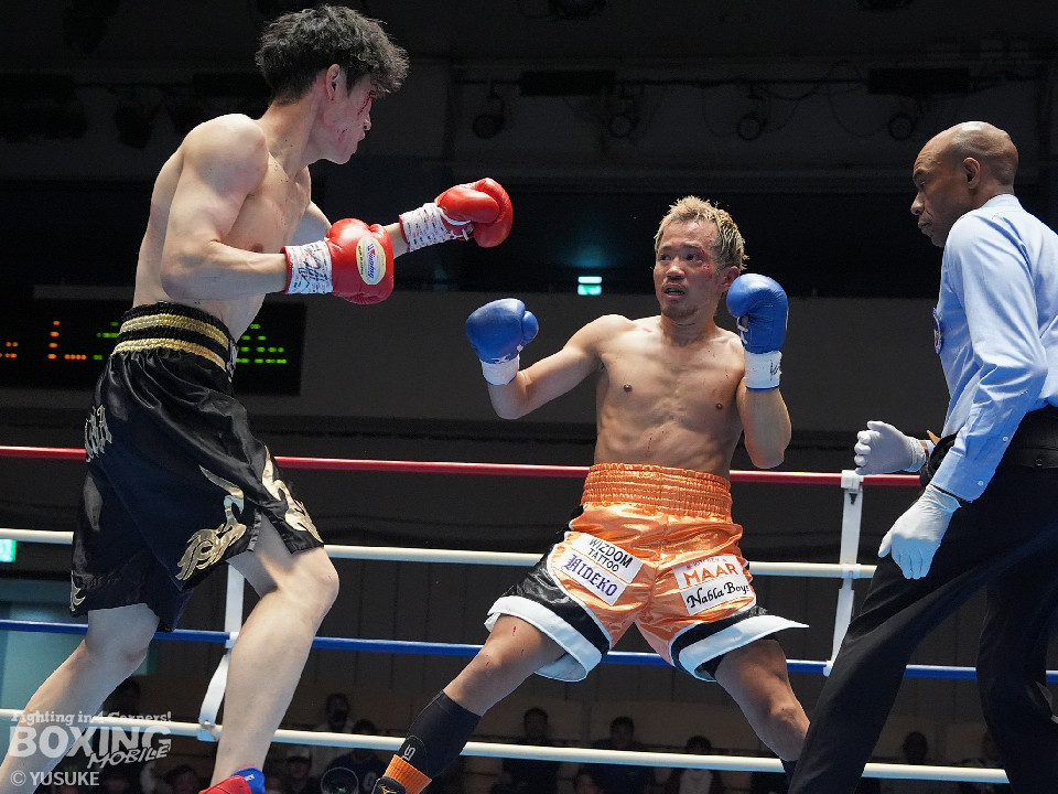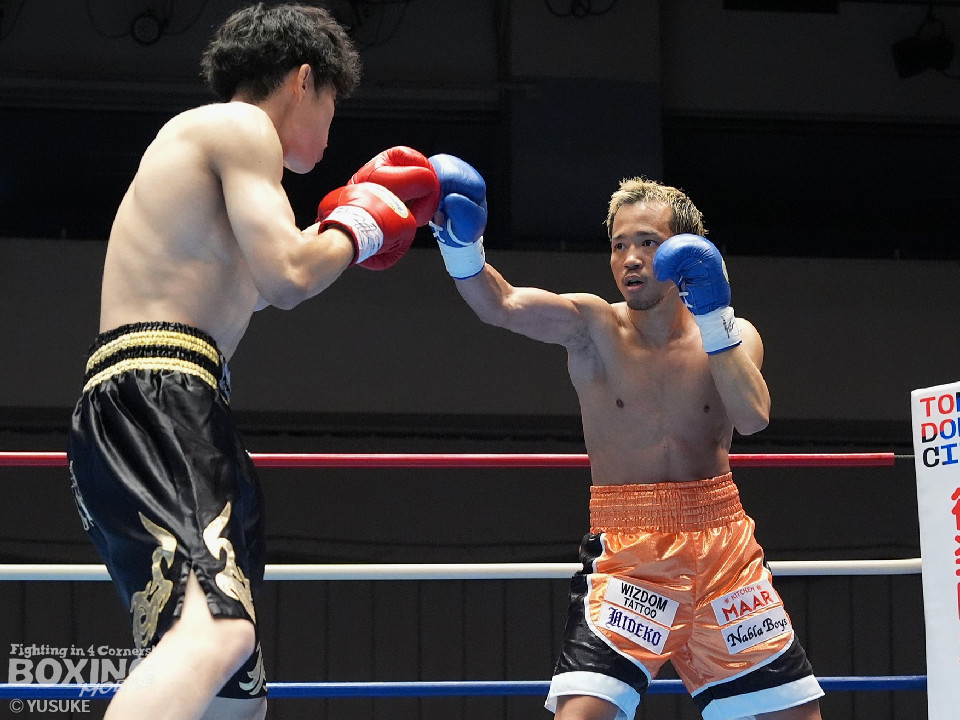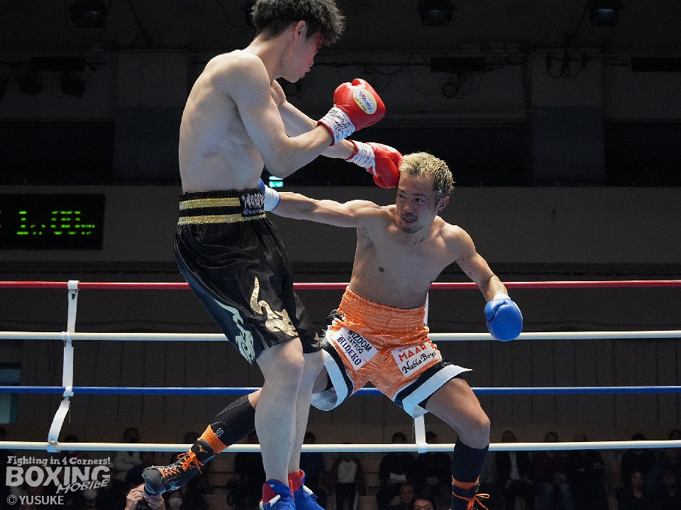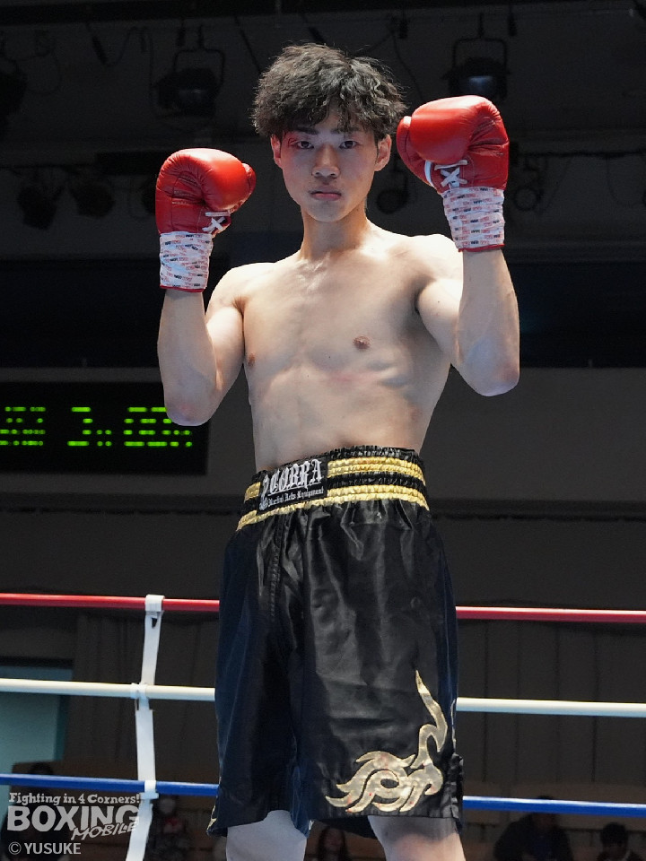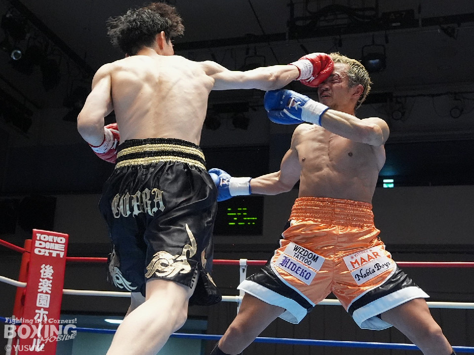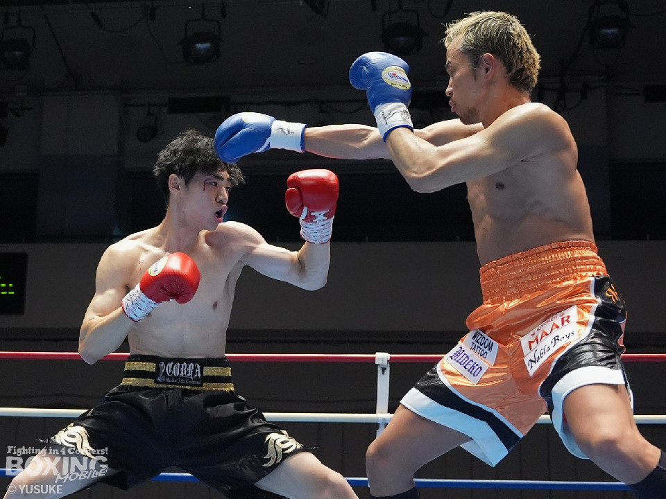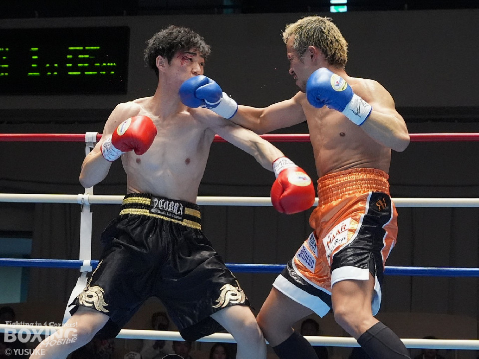試合:サウスポー江田が左ストレートから切り込むのに対し、清水はワンツーで対抗。頭がぶつかり清水は右目上をカット。再開後、激しい打撃戦を繰り広げる中、清水は右ショートでグラつかせるとロープに詰めて連打で攻勢。手が出なくった江田を見てレフェリーがストップした。