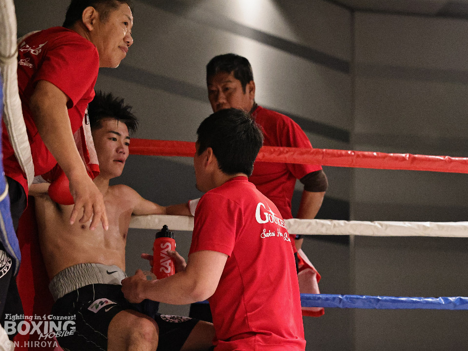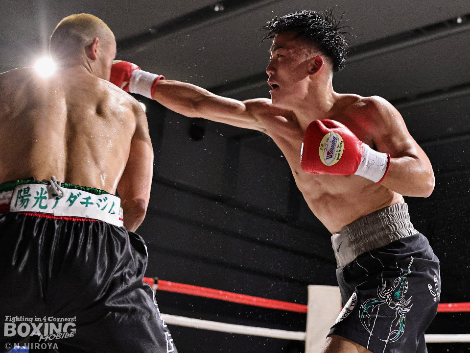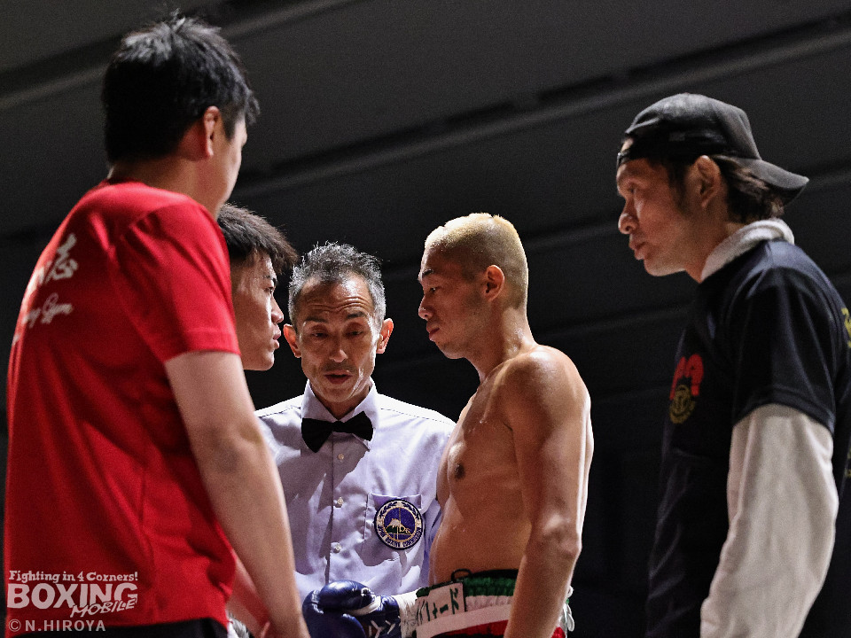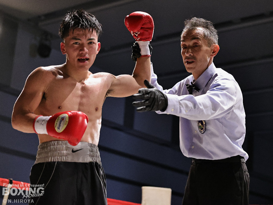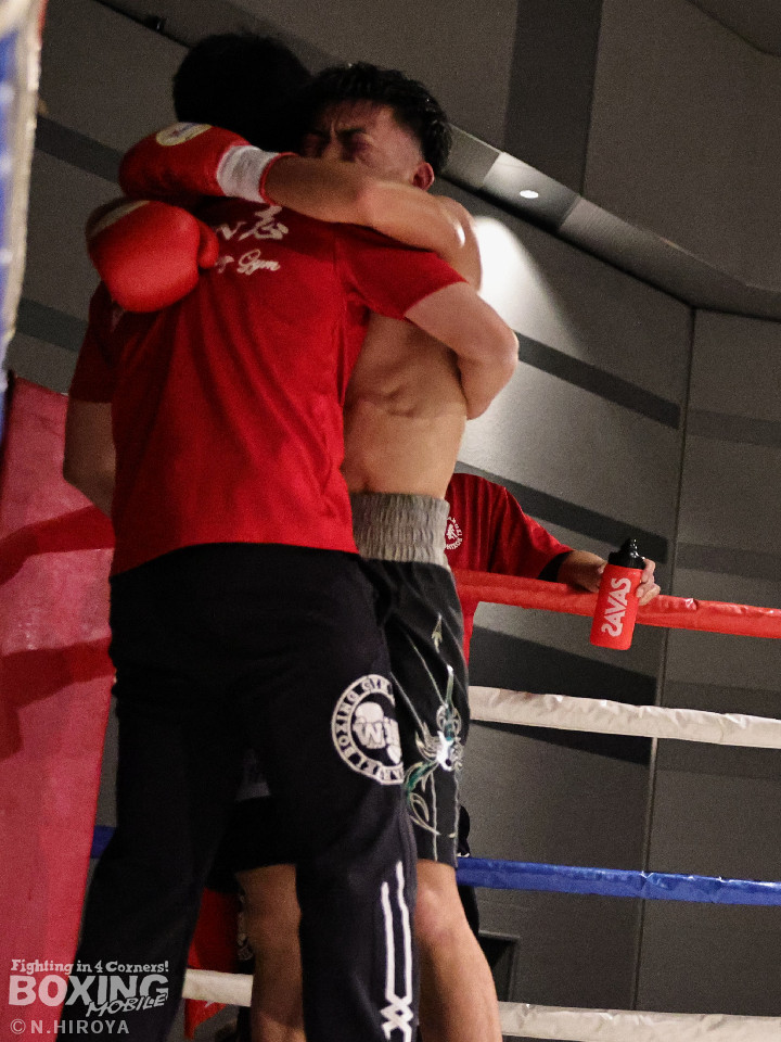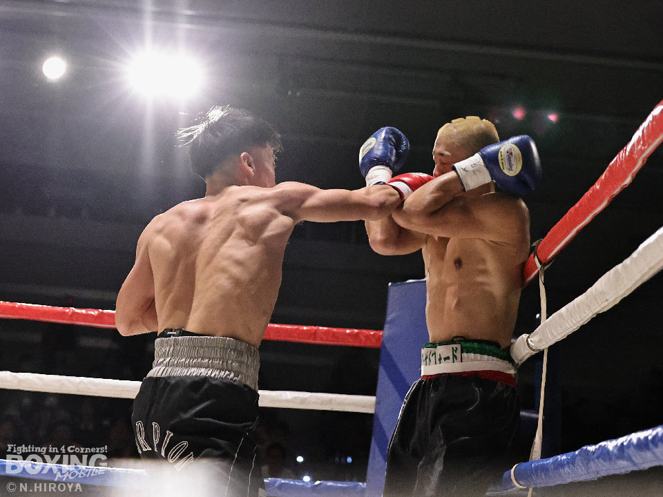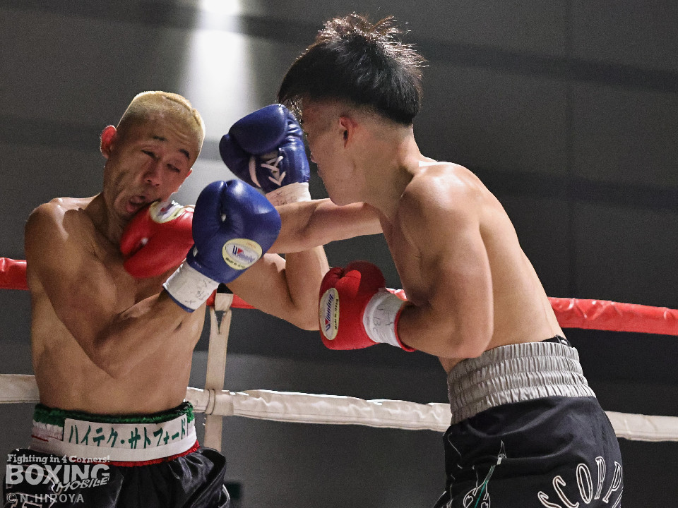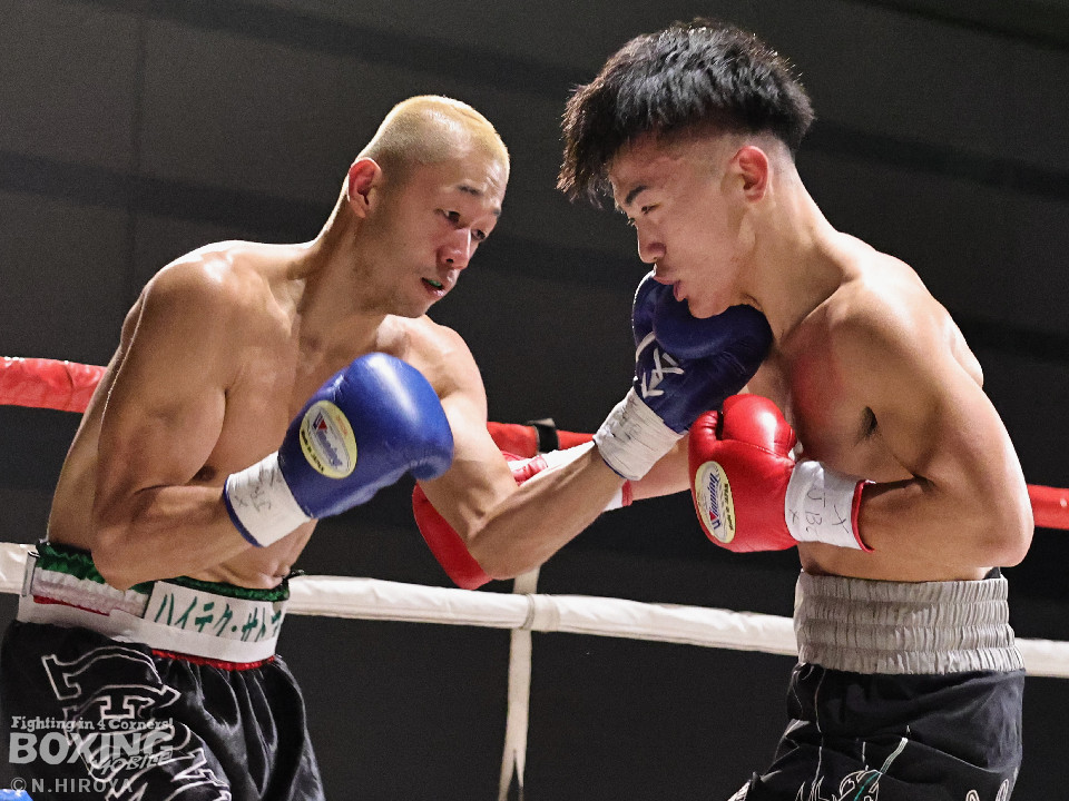 試合:白濱が右ボディを叩きつけて先制攻撃。右フックでバランスを崩させて連打で攻勢。ピンチのサウスポー・ハイテクは必死に返して、このラウンドを乗り切った。2回、白濱は右ボディを差し込み体力を削る作戦。ハイテクは左カウンターを狙った。3回、白濱はノーモーションの右ストレートで顔を弾きポイントを加点。4回、ハイテクは左アッパーからワンツーにつなげて反撃。「拓哉」コールに後押しされた白濱は気持ちを切らさず打ち返した。高校生ボクサーの白濱が2勝目を挙げた。