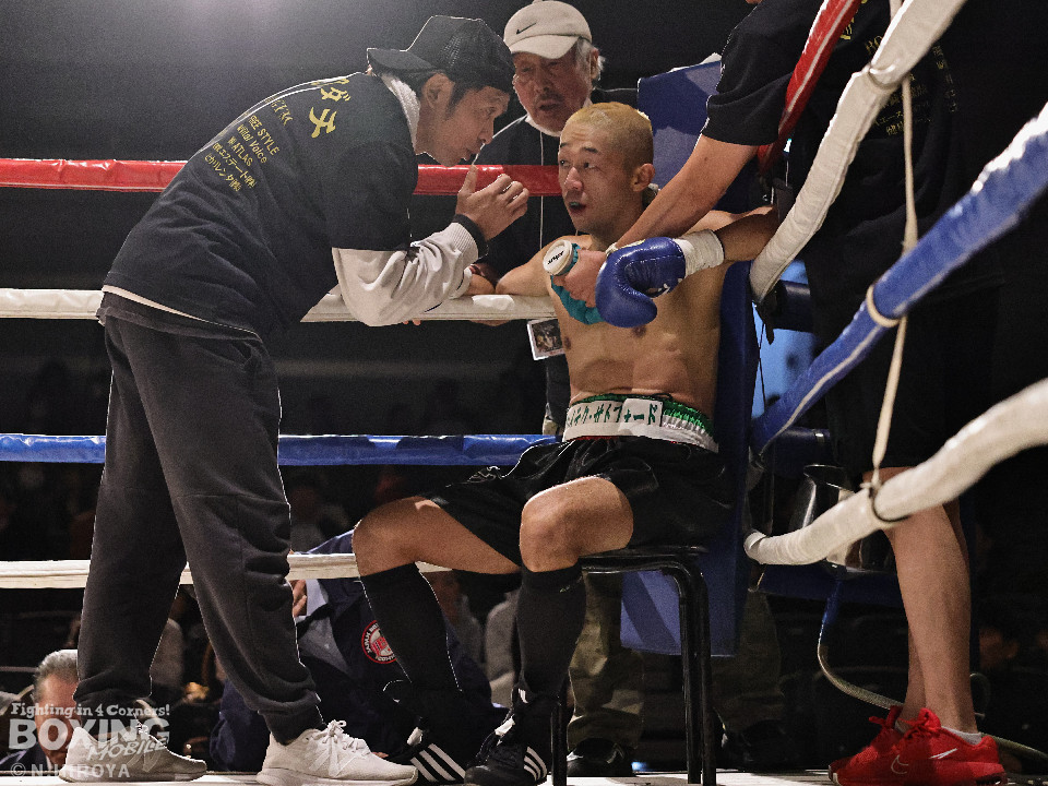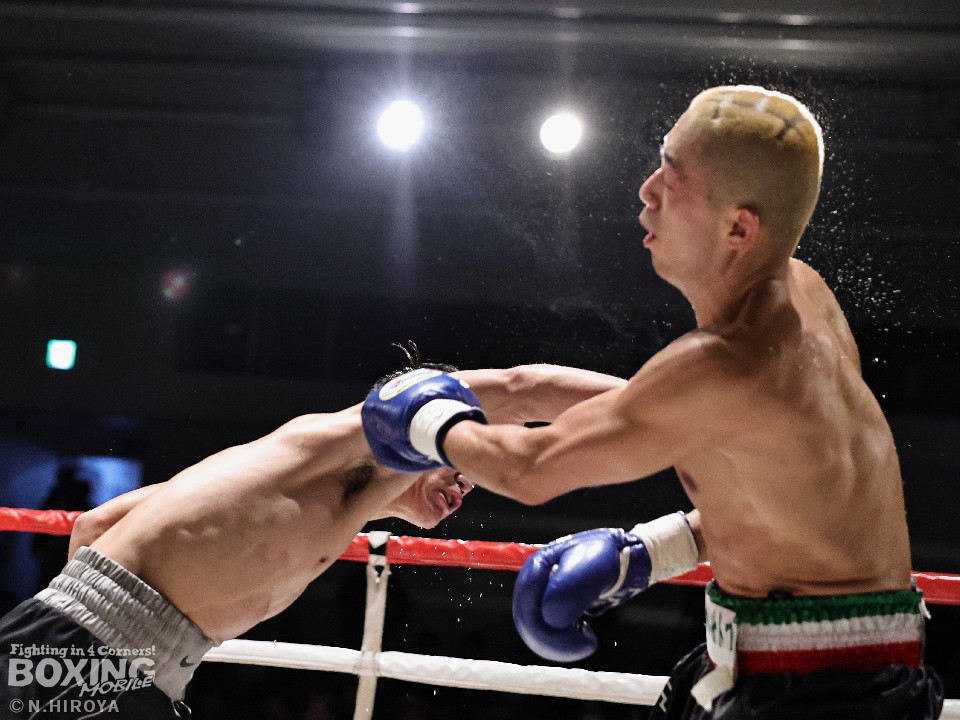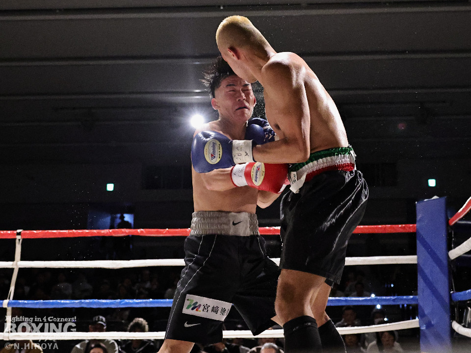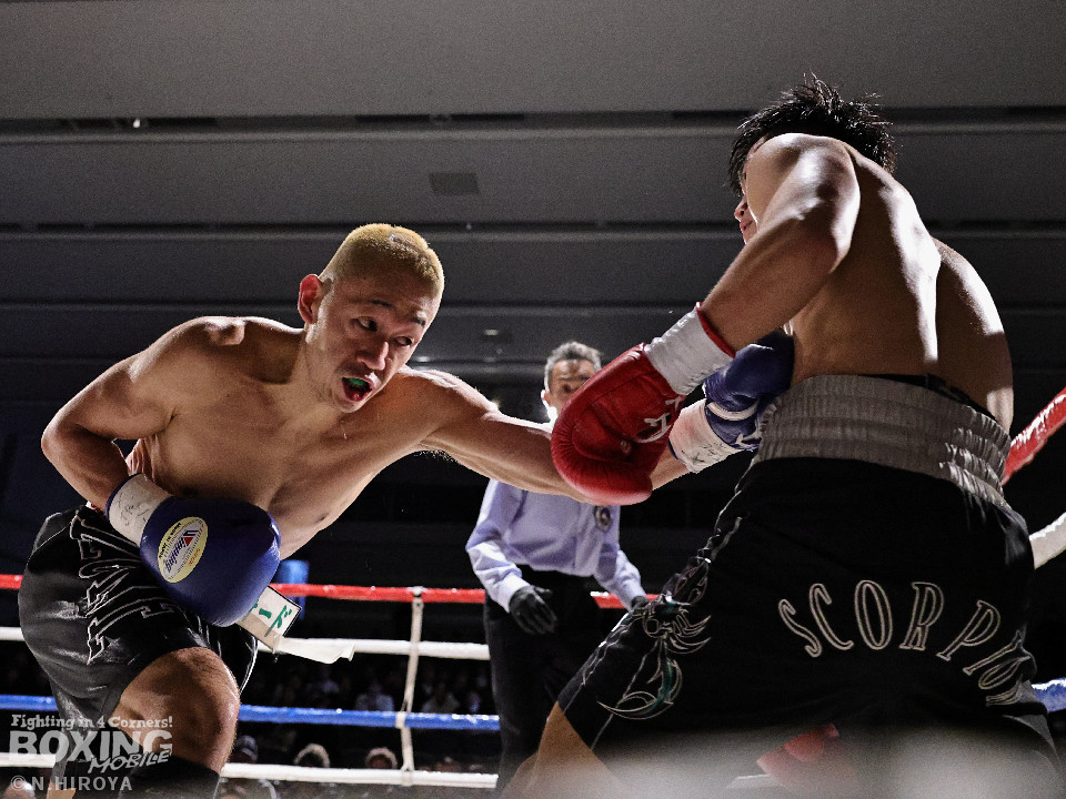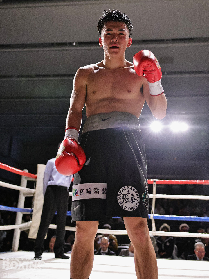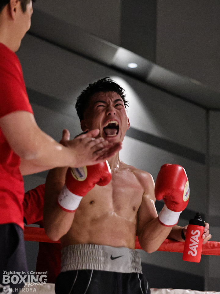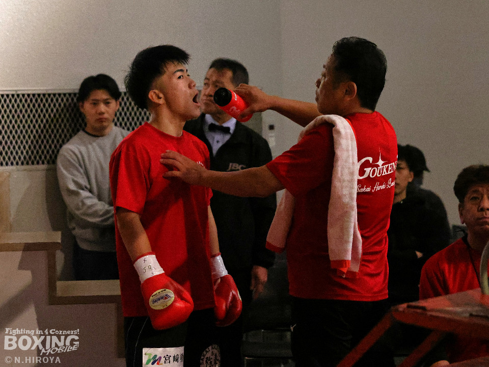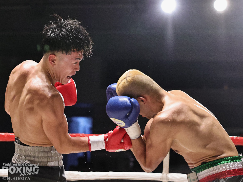 試合:白濱が右ボディを叩きつけて先制攻撃。右フックでバランスを崩させて連打で攻勢。ピンチのサウスポー・ハイテクは必死に返して、このラウンドを乗り切った。2回、白濱は右ボディを差し込み体力を削る作戦。ハイテクは左カウンターを狙った。3回、白濱はノーモーションの右ストレートで顔を弾きポイントを加点。4回、ハイテクは左アッパーからワンツーにつなげて反撃。「拓哉」コールに後押しされた白濱は気持ちを切らさず打ち返した。高校生ボクサーの白濱が2勝目を挙げた。