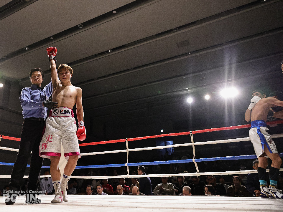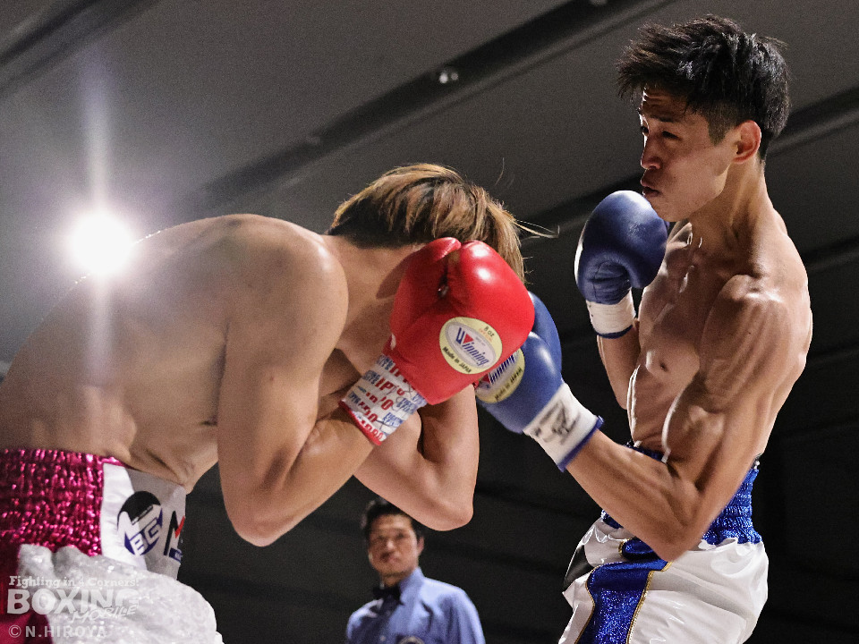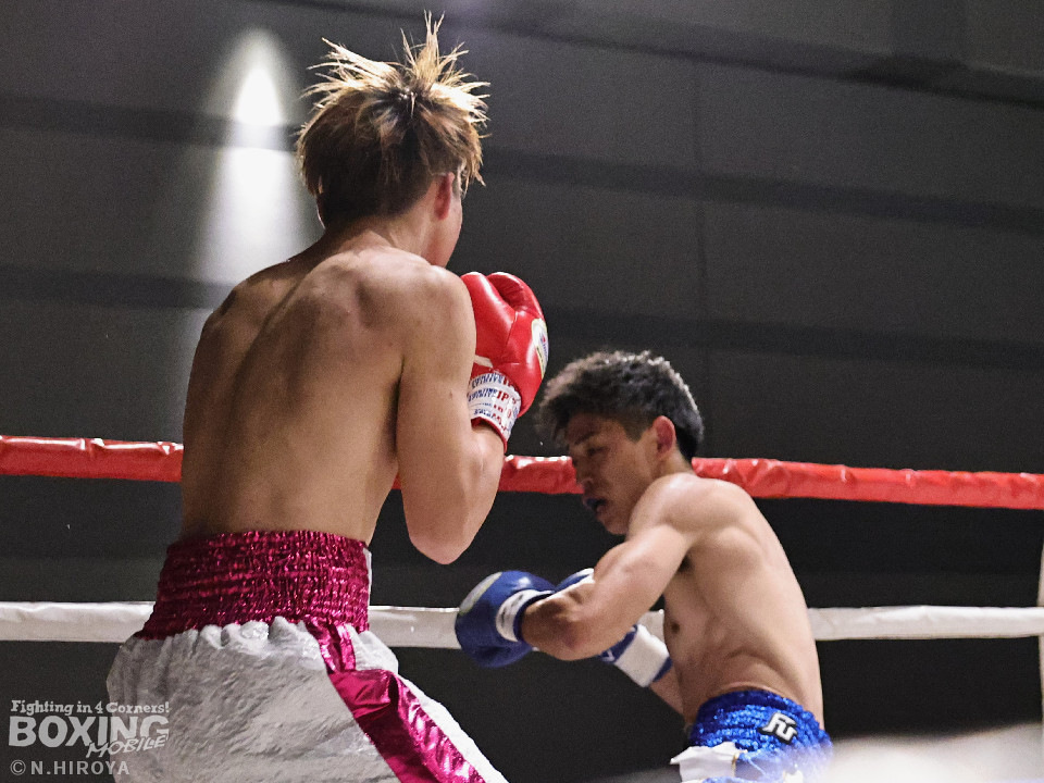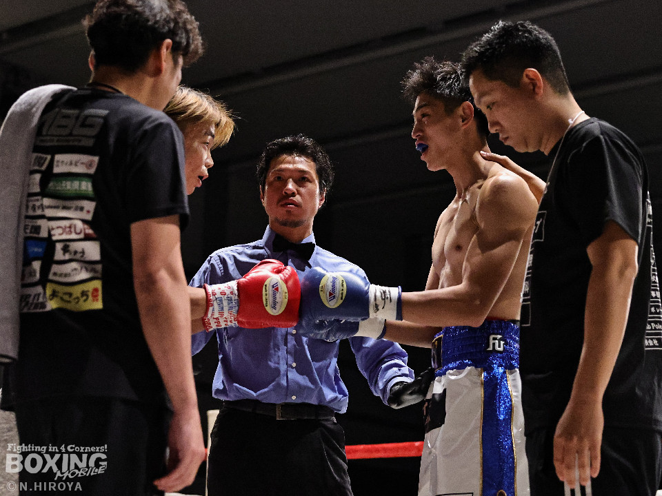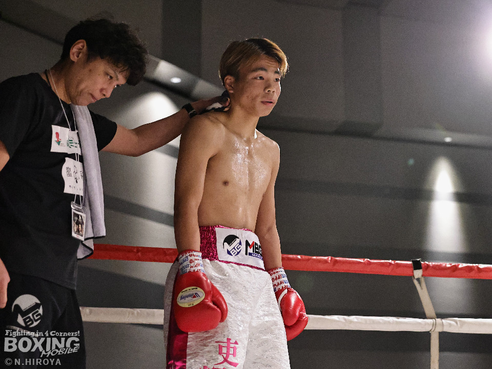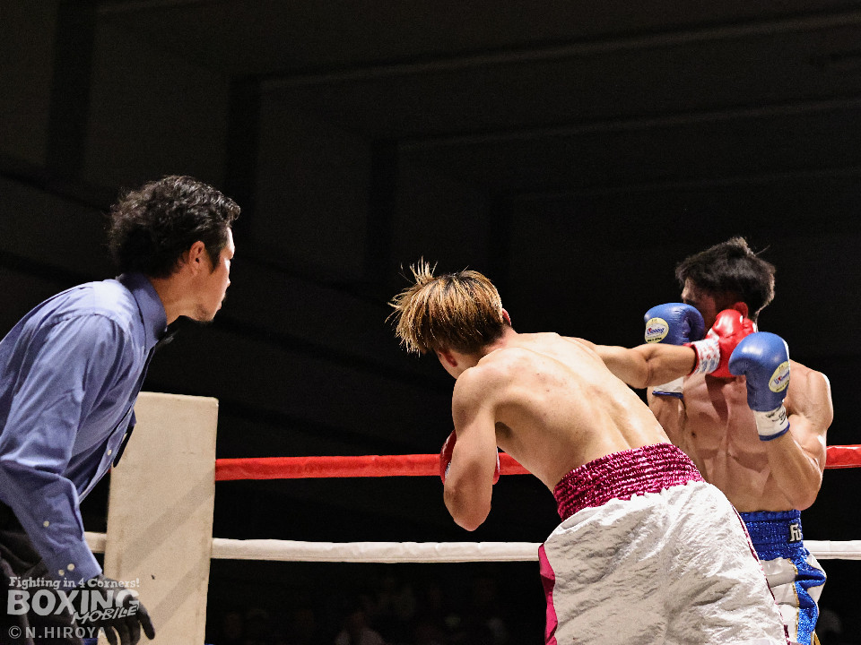 試合:180㎝の長身オーソドックス吉田が右アッパーでかち上げると、ジャブを軸に中間距離をキープ。2回、ペースを奪い返したい日野はプレスをかけて右ストレートでダウンを先取。再開後、パンチをまとめると右フックをねじ込んだところでレフェリーが割って入った。