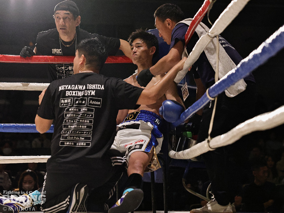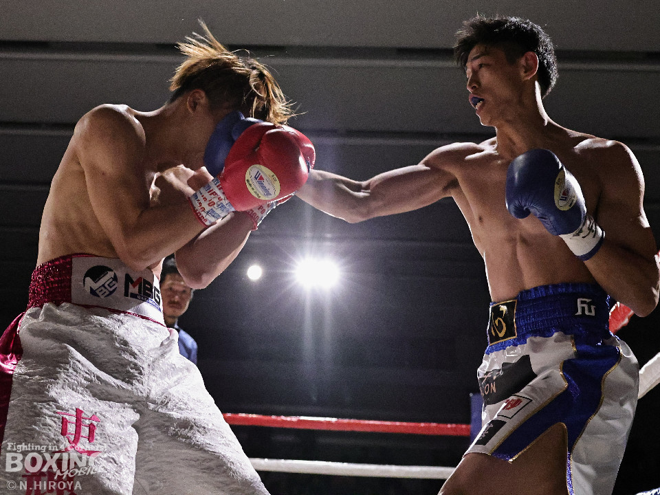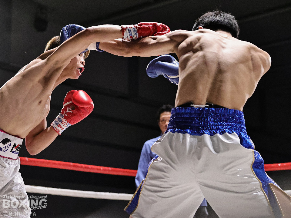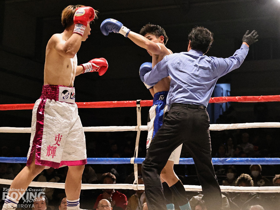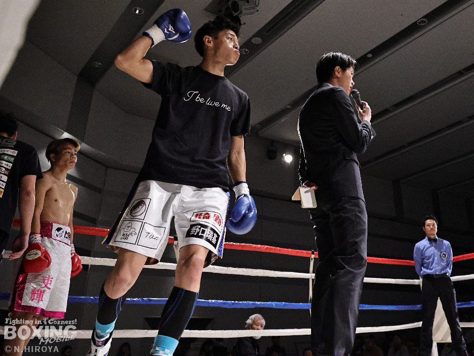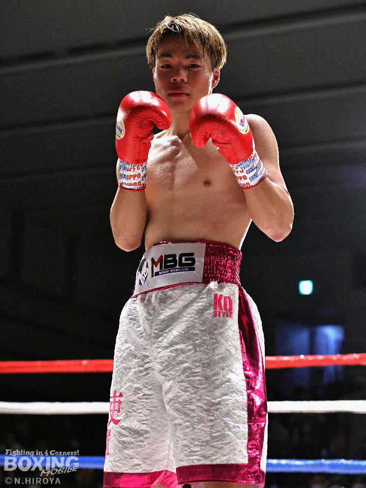 試合:180㎝の長身オーソドックス吉田が右アッパーでかち上げると、ジャブを軸に中間距離をキープ。2回、ペースを奪い返したい日野はプレスをかけて右ストレートでダウンを先取。再開後、パンチをまとめると右フックをねじ込んだところでレフェリーが割って入った。