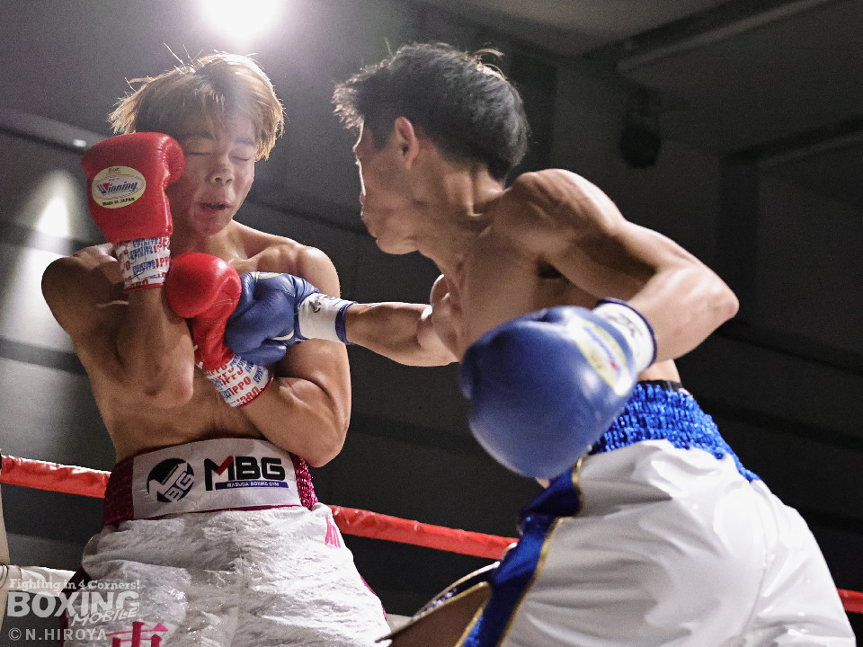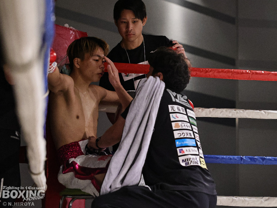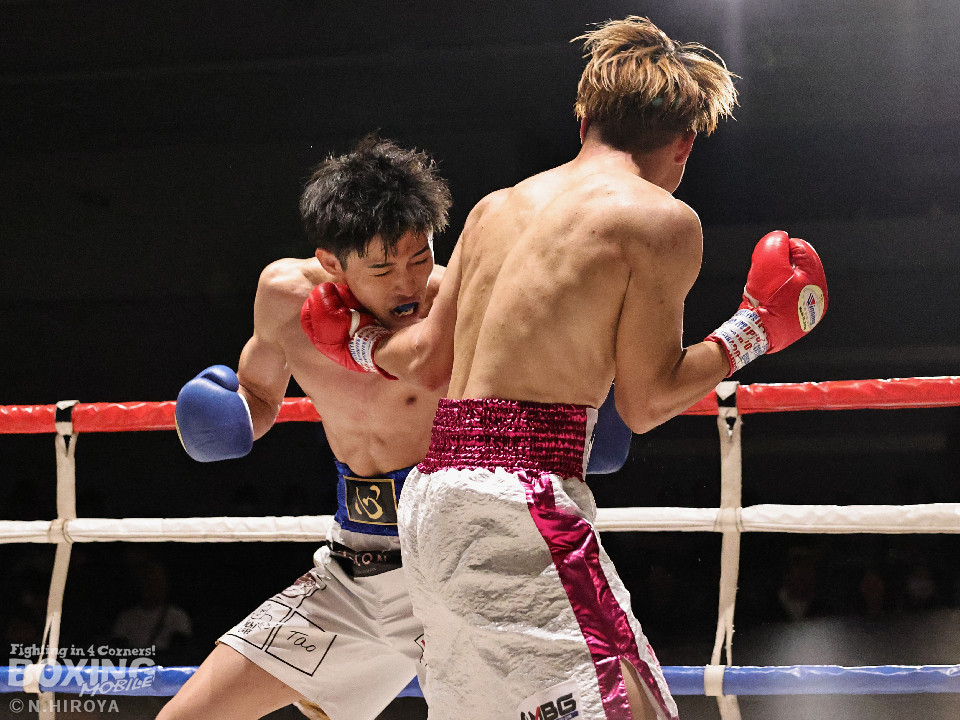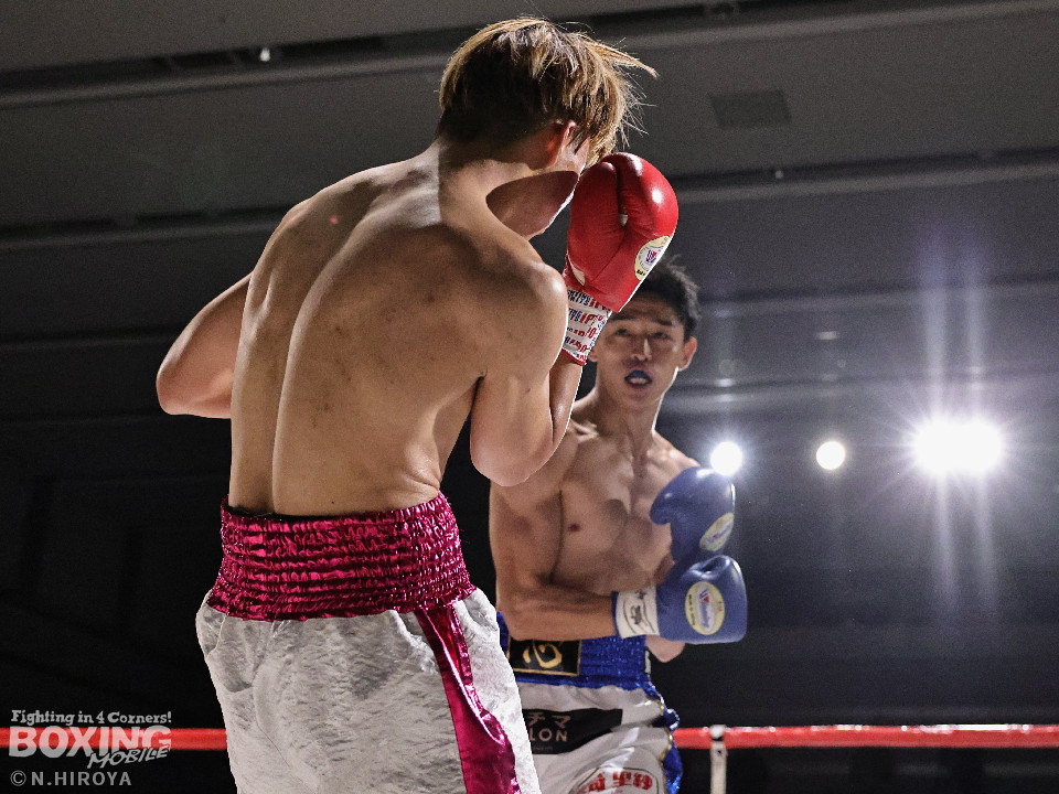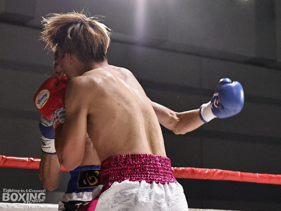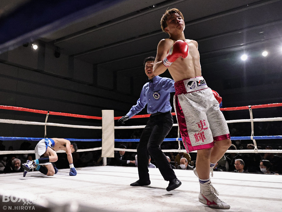 試合:180㎝の長身オーソドックス吉田が右アッパーでかち上げると、ジャブを軸に中間距離をキープ。2回、ペースを奪い返したい日野はプレスをかけて右ストレートでダウンを先取。再開後、パンチをまとめると右フックをねじ込んだところでレフェリーが割って入った。