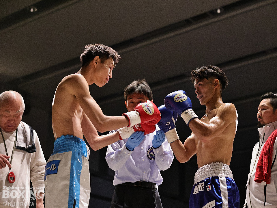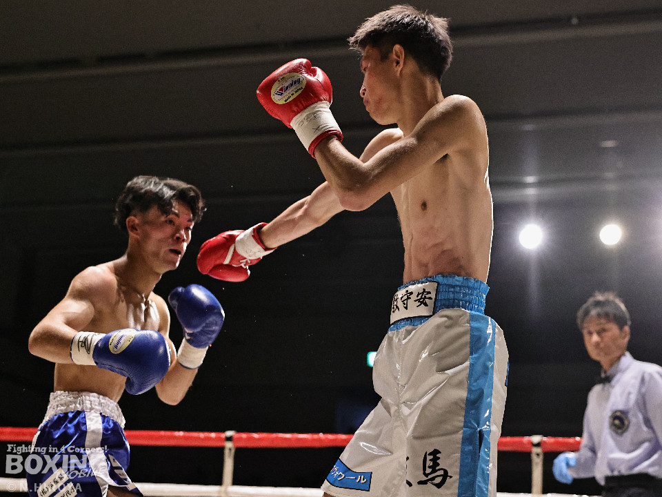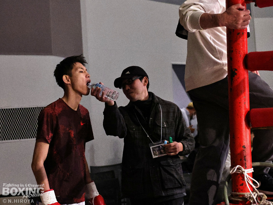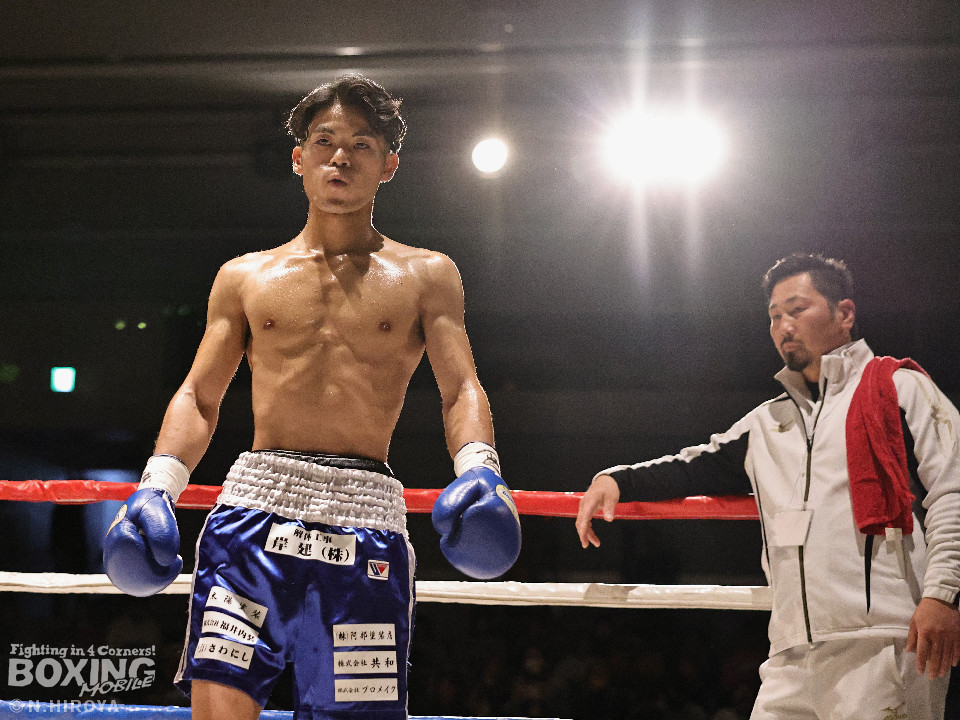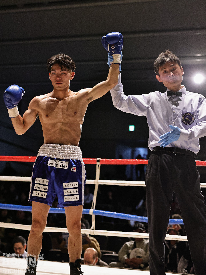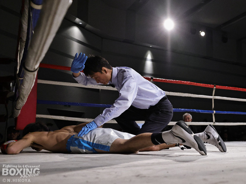 試合:サウスポー同士の一戦は、見尾が前の手でコントールしながら懐に入らせず。ラウンド終盤、右フックでグラつかせて先手を奪った。2回、冨山は上下に揺さぶりをかけると右フックをヒット。ジリジリと距離を詰めて右フックでダウンを奪取。再開後、左クロスで倒して決着をつけた。前のめりに倒れた見尾は担架で運ばれた。冨山がデビュー戦をKO勝ちした。
