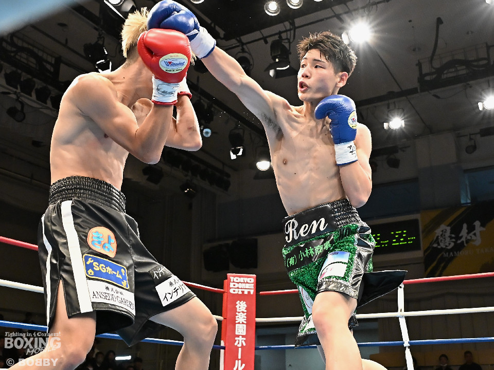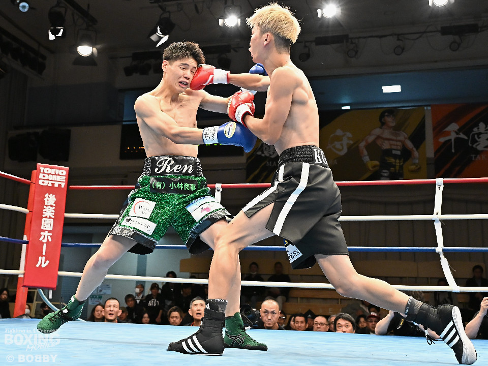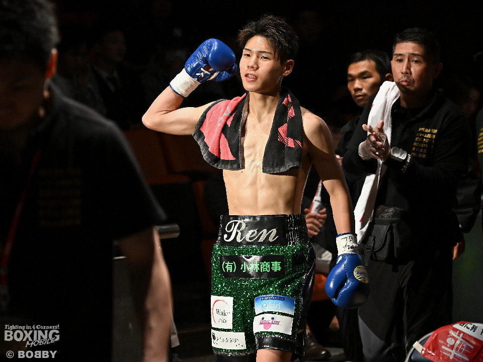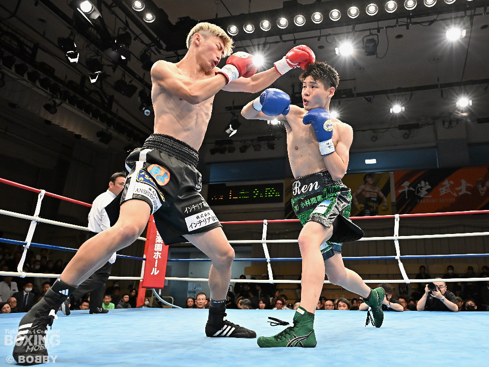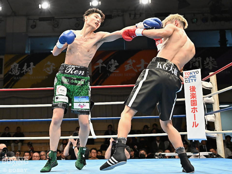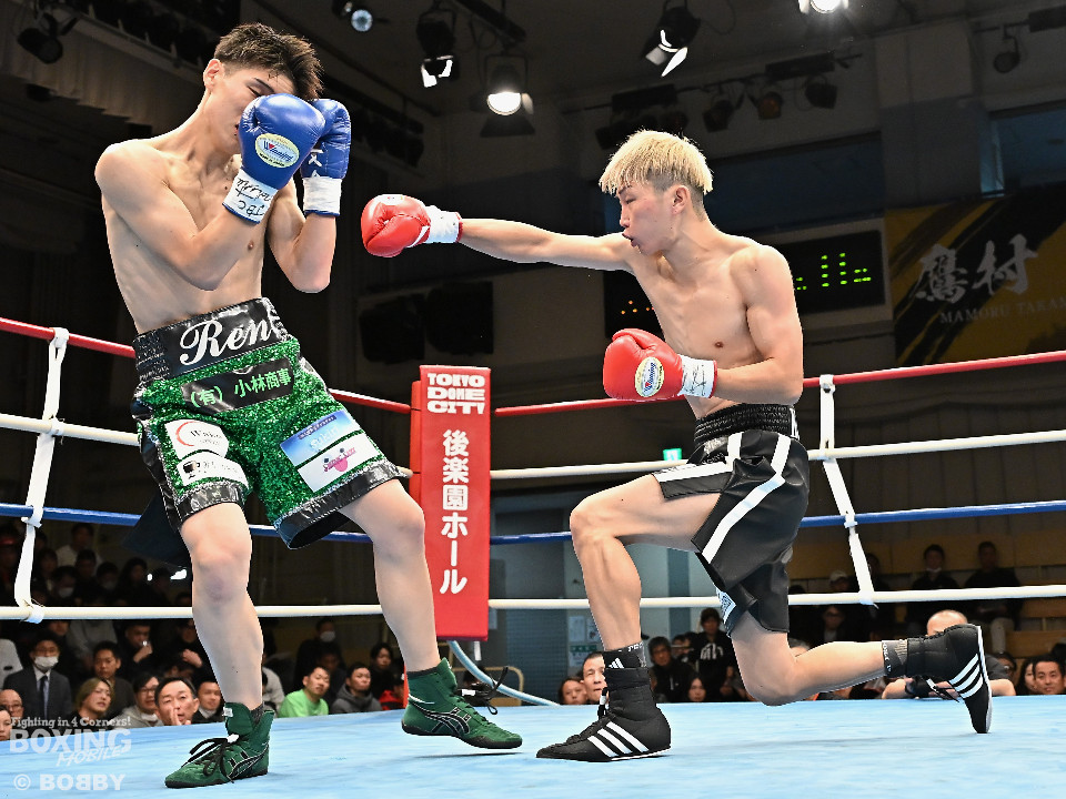 試合:小林がジャブを飛ばしながらアグレッシブに攻めるとワンツーを再三ヒット。リズムをつかむとワンツーでダウンを奪い絶好のスタートを切った。2回、右カウンターを狙う菊池に対し、小林は左を軸にダメージを与えると右ストレートで倒して決着をつけた。