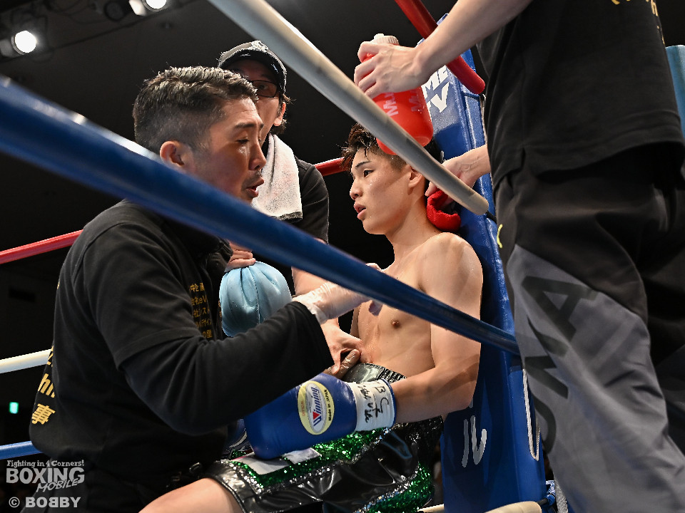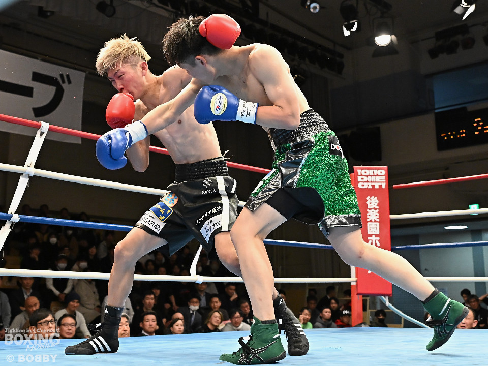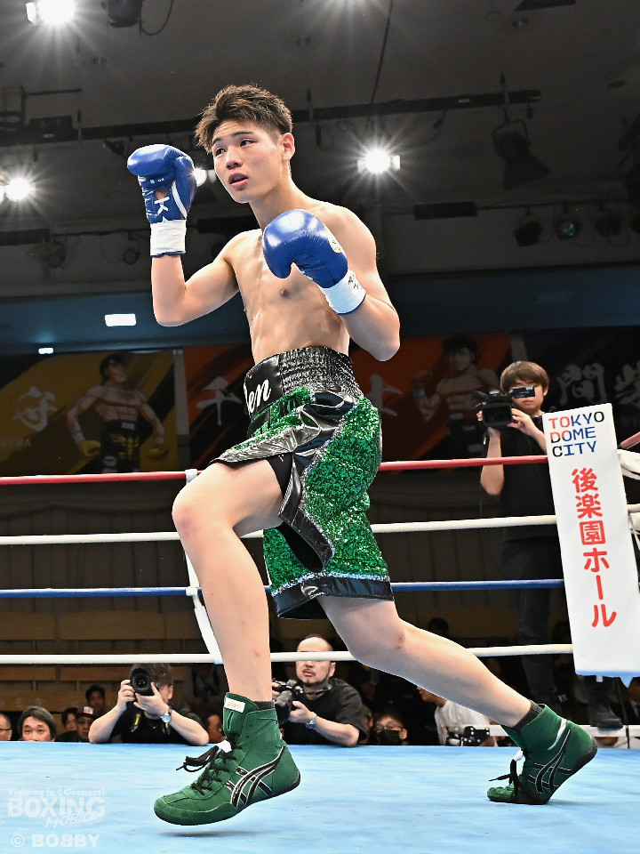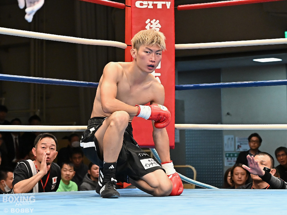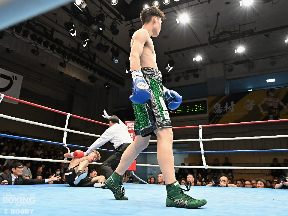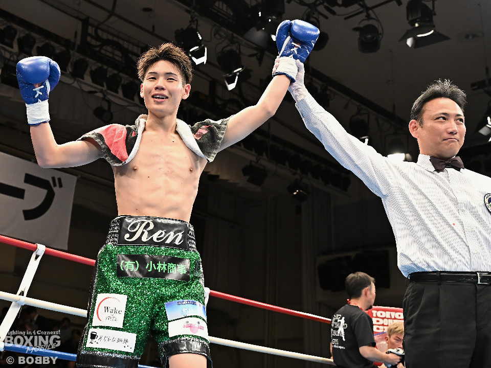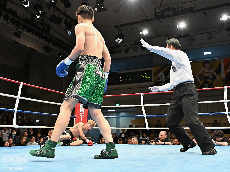 試合:小林がジャブを飛ばしながらアグレッシブに攻めるとワンツーを再三ヒット。リズムをつかむとワンツーでダウンを奪い絶好のスタートを切った。2回、右カウンターを狙う菊池に対し、小林は左を軸にダメージを与えると右ストレートで倒して決着をつけた。